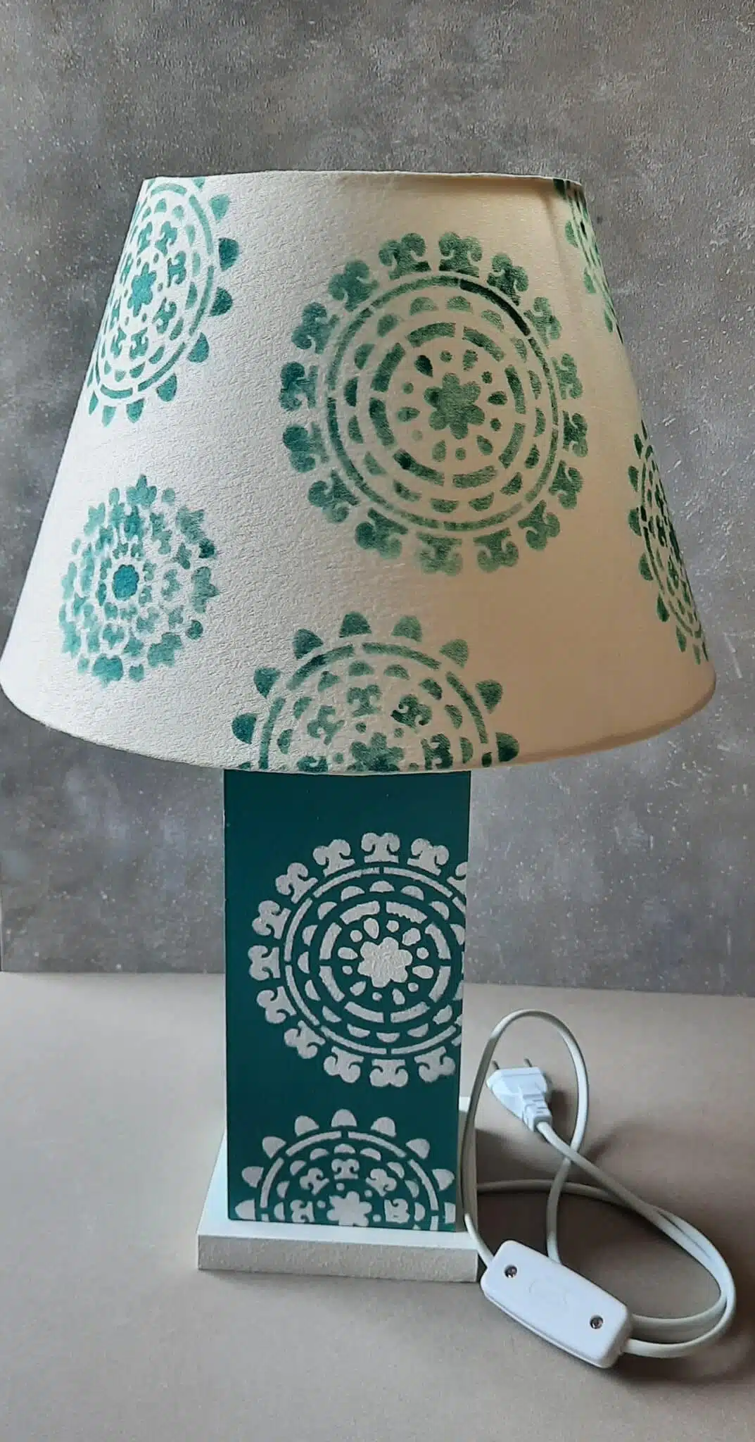 Wooden lamps 10×10 with height 27 without chapeau, chapeau is 30 cm wide .The lamp and chapeau are both stenciled with a design to add color to bedrooms and living areas