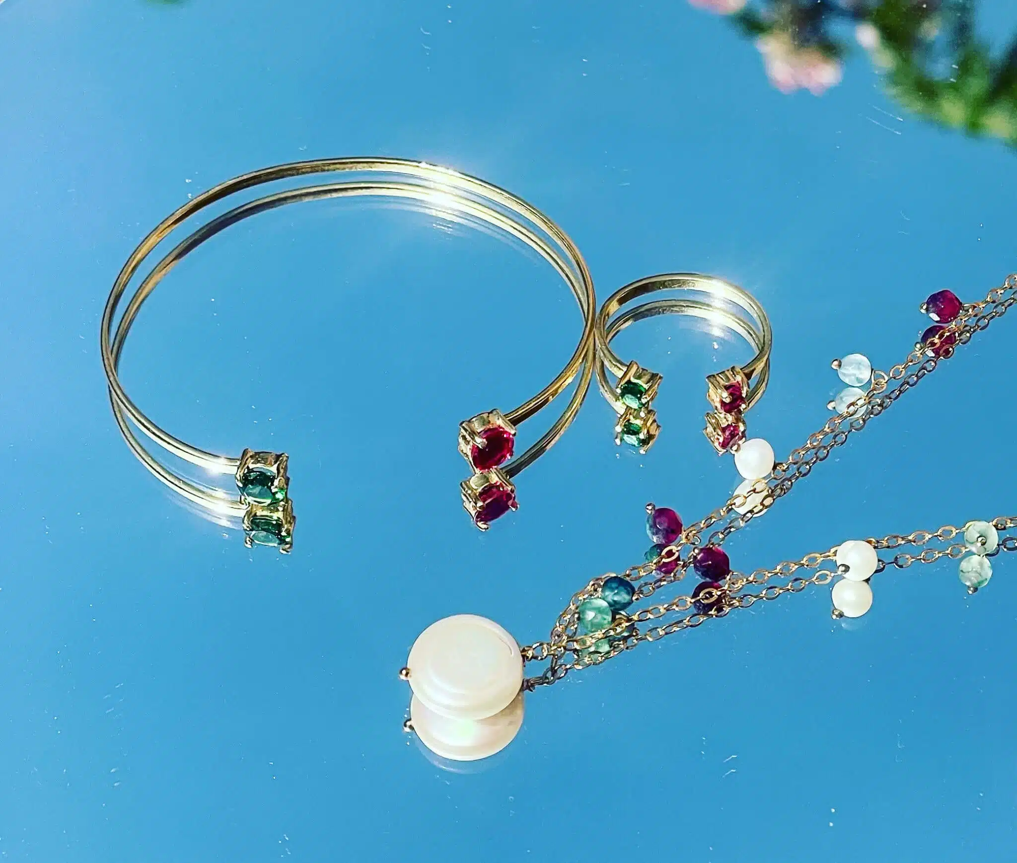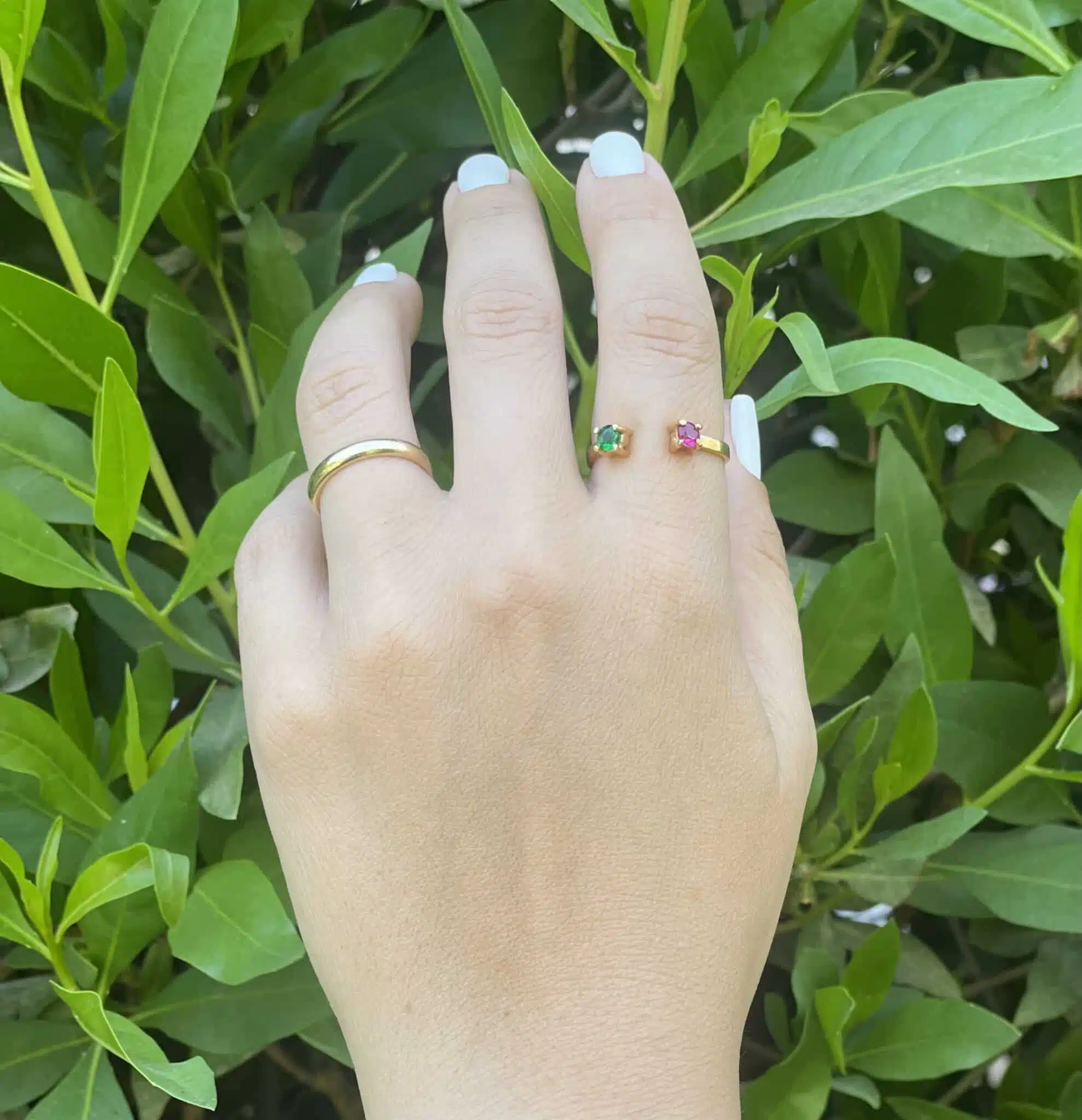 pure 925 silver platted in 18k gold ring with green and pink stones