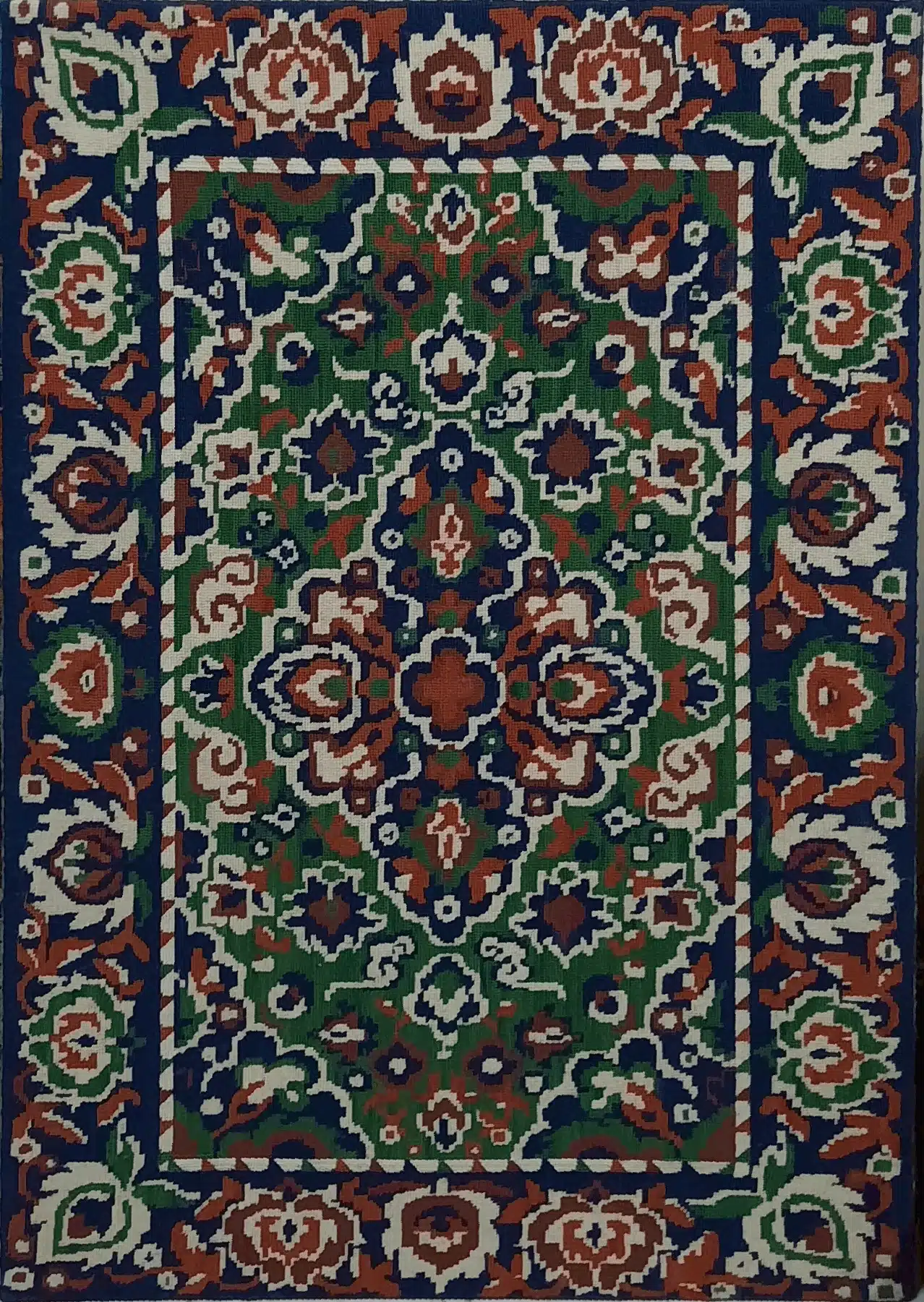 This intricate design draws inspiration from traditional Persian motifs, featuring a harmonious interplay of deep green, earthy orange, and rich navy blue tones. The symmetrical floral and geometric patterns symbolize heritage and timeless elegance, making it an ideal addition to both modern and classic interiors.