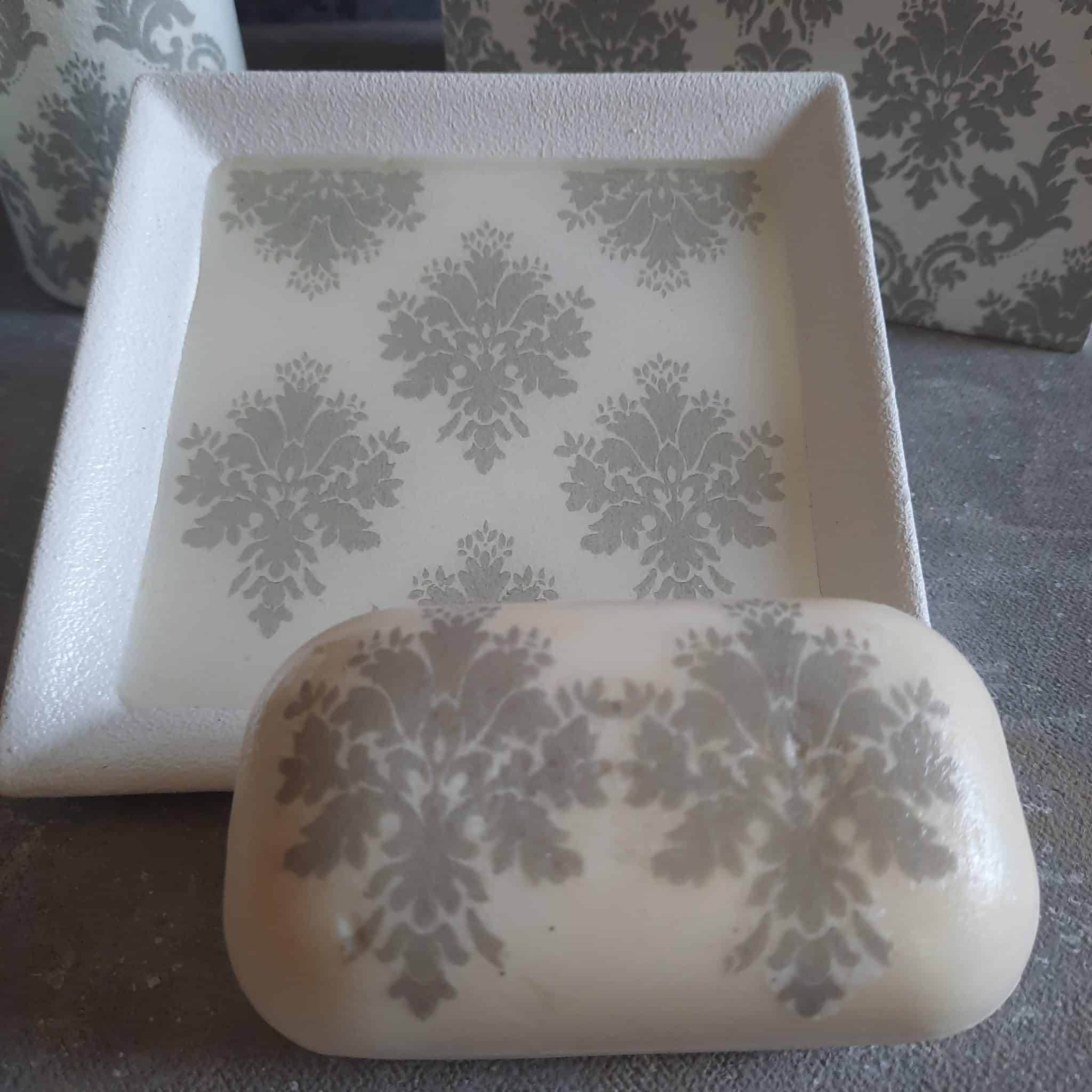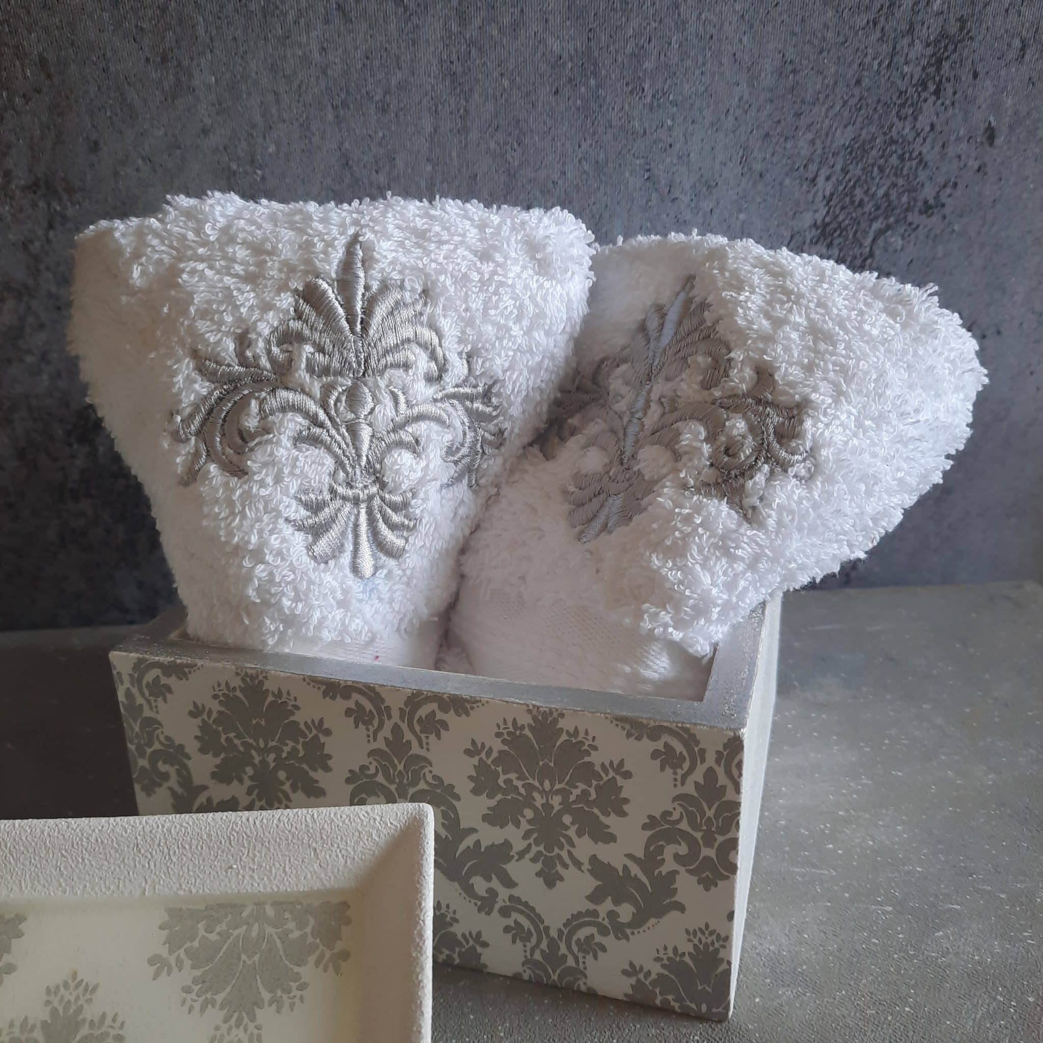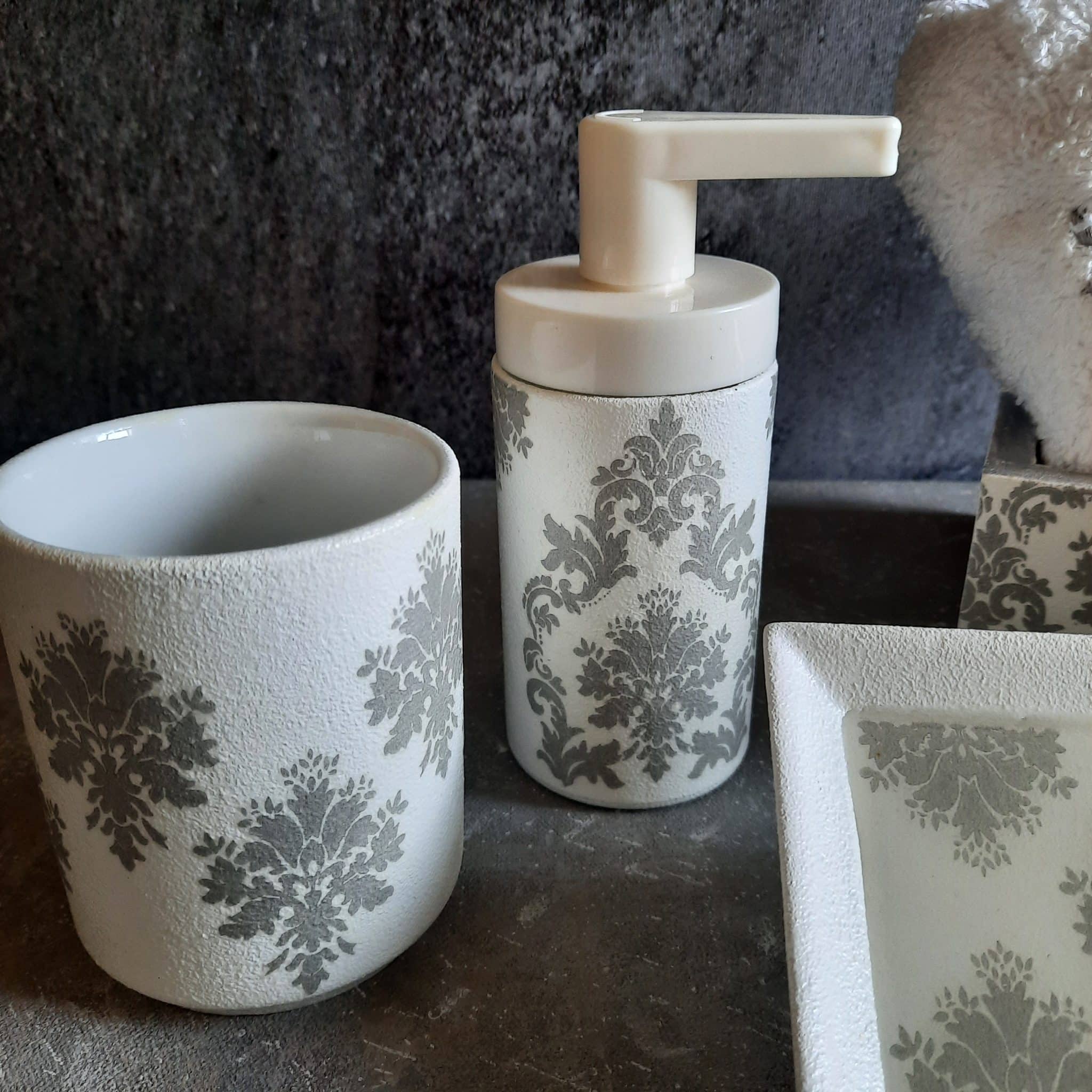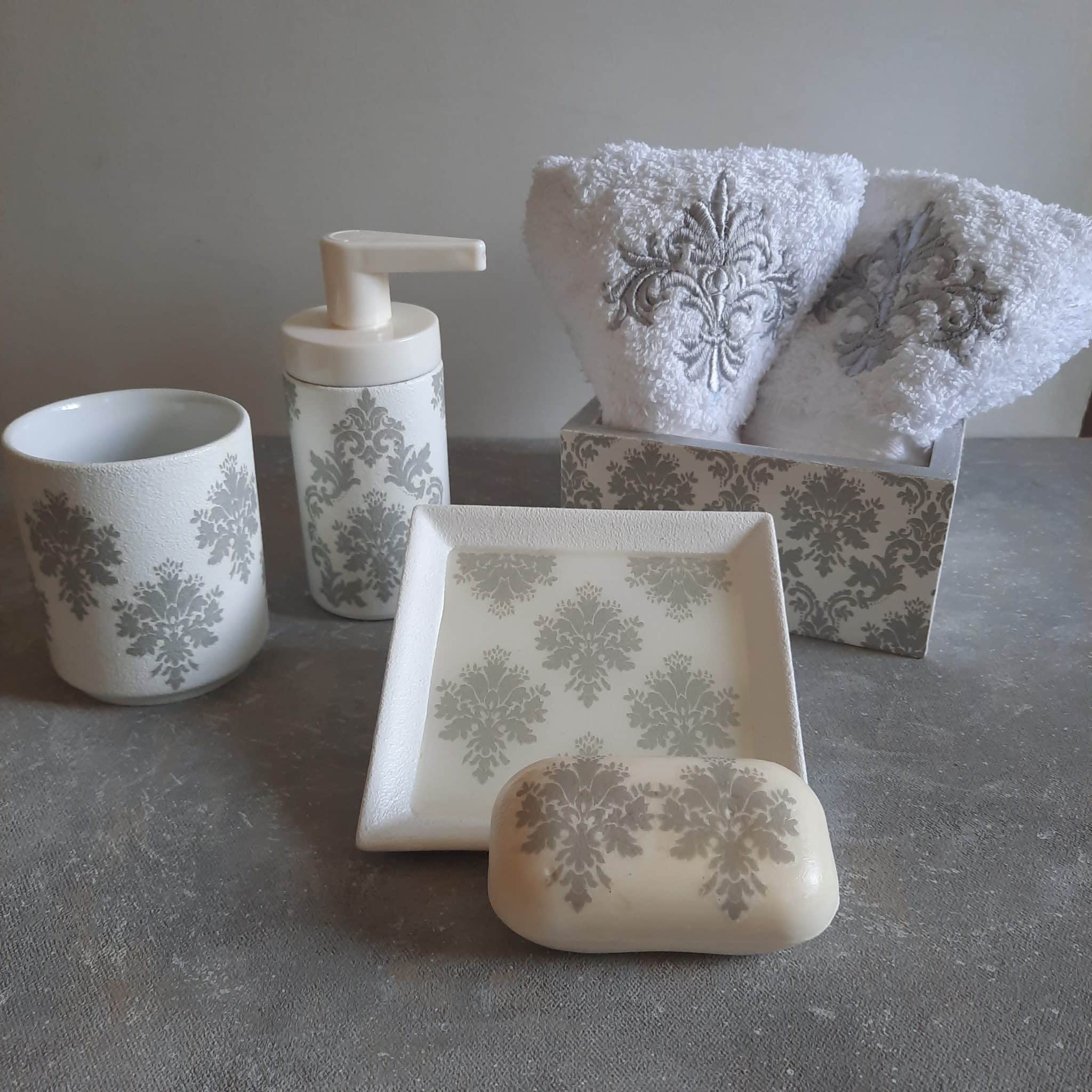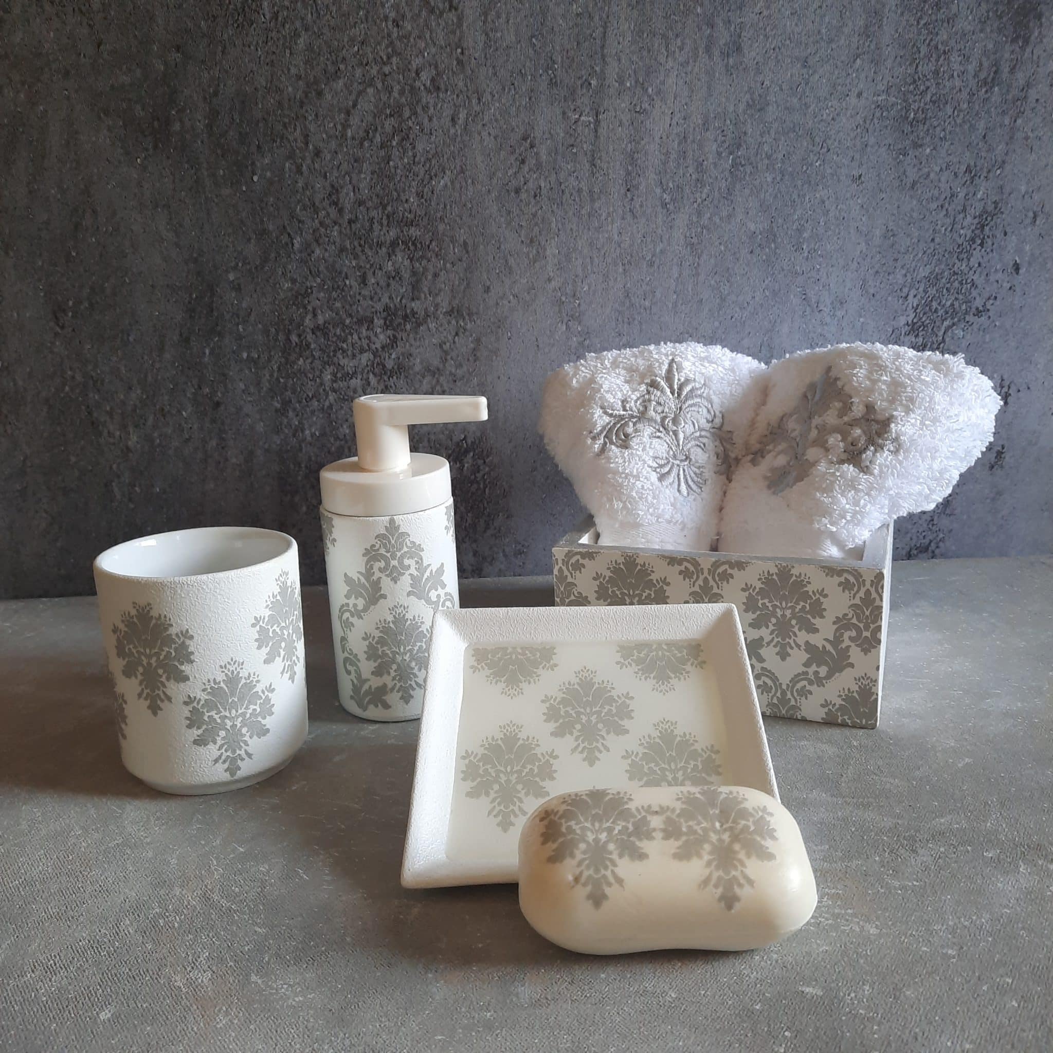 Grey bathroom set consists of a plate with soap , dispenser, cup and a box with 2 embroidered guest towels with a patten matching with the set