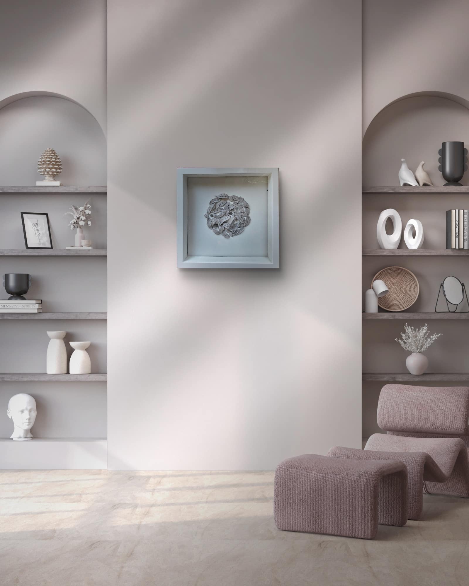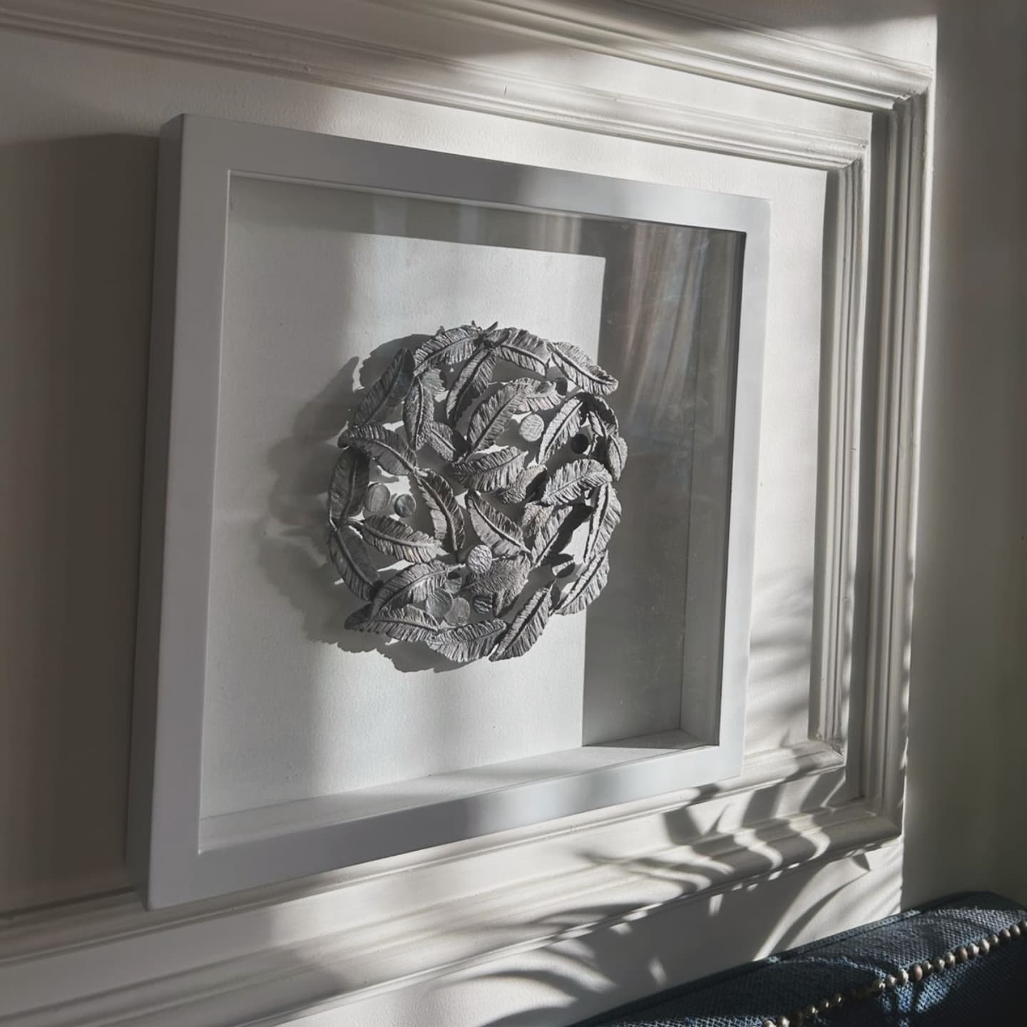 Grey clay feathers with touches of silver in a 3 cm. Deep white wood frame covered with glass