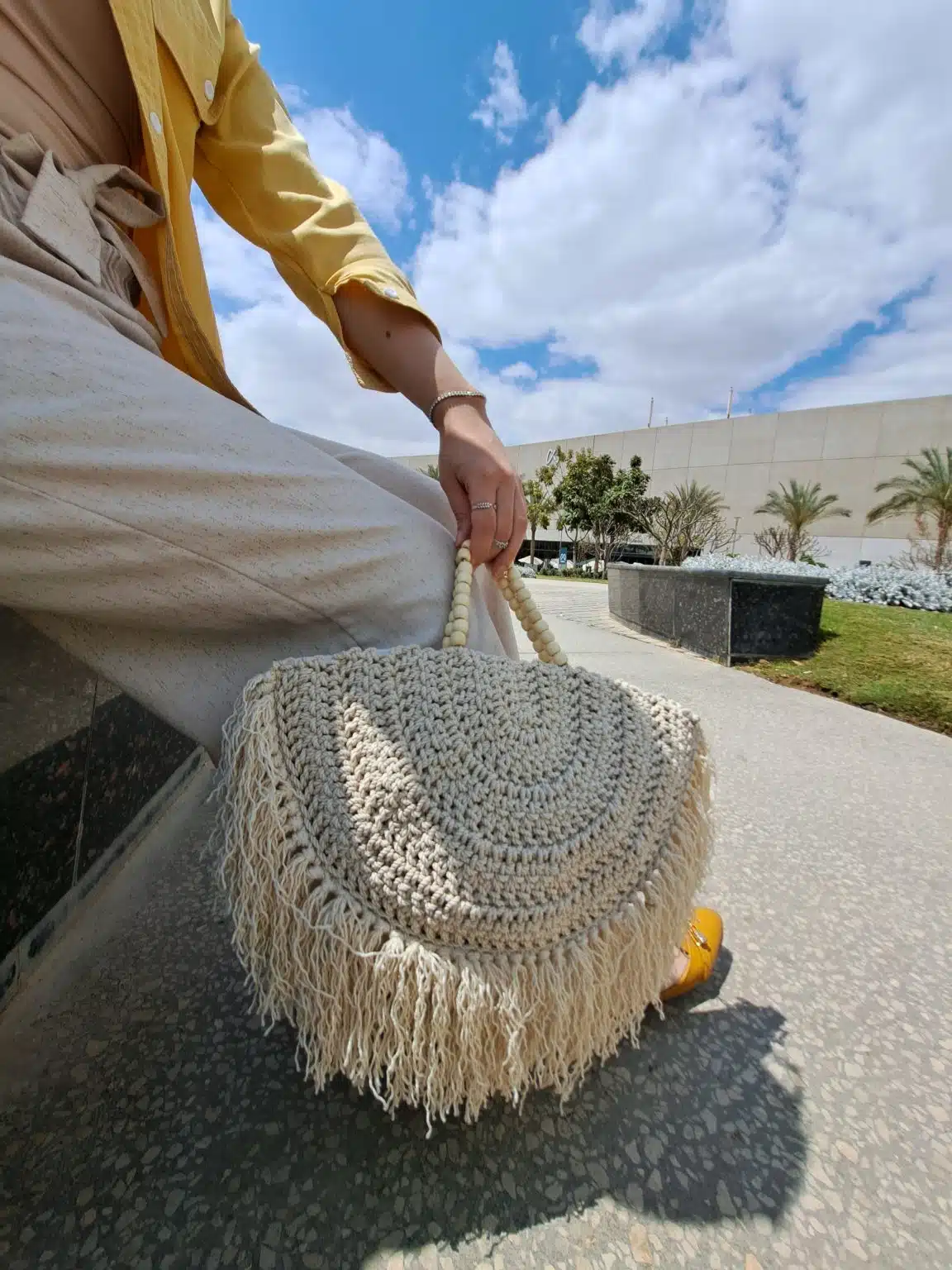 Handmade Beige macrame bag with inner coating & zipper.