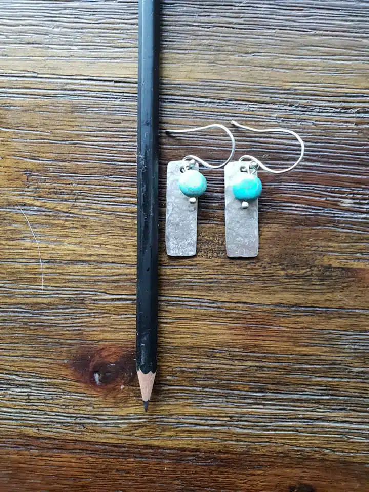 Hammered rectangular sterling silver earring with dangling turquoise. It has separate matching bracelet and ring.