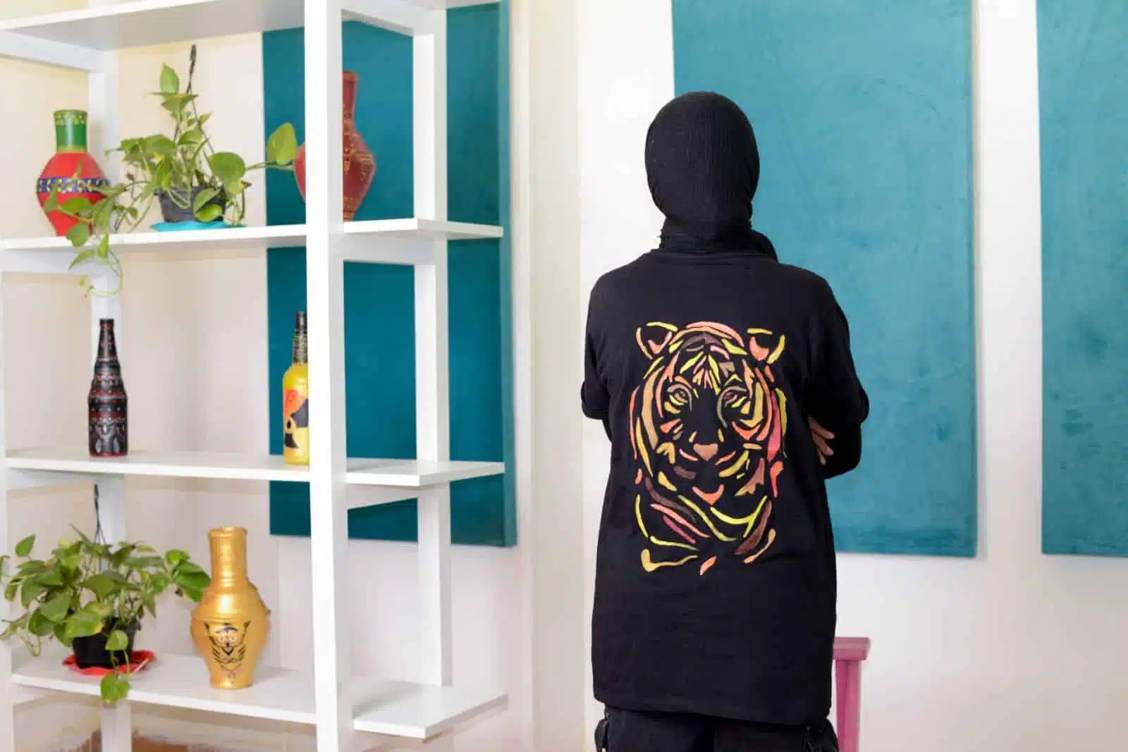 a cotton black tshirt painted on back with a lion