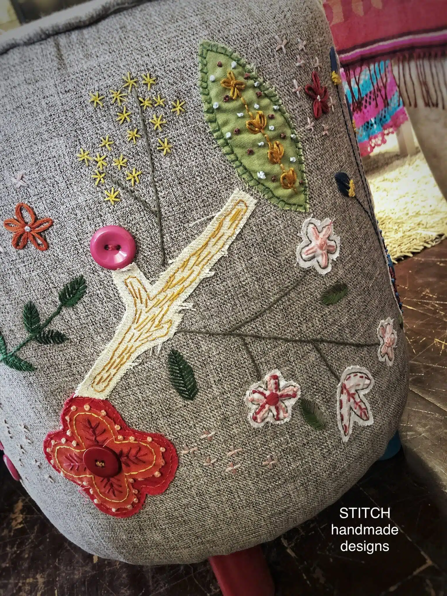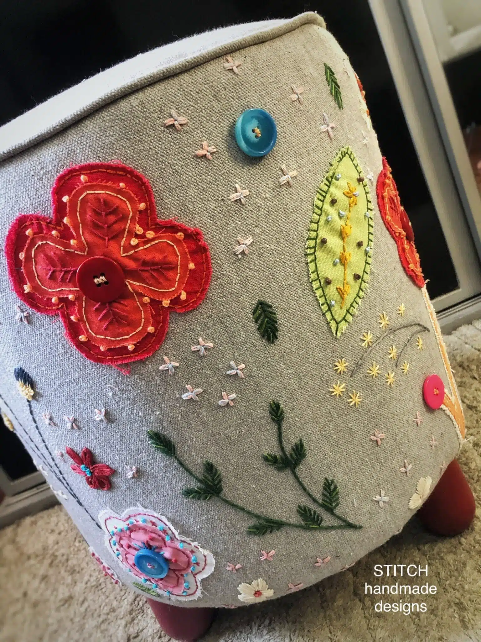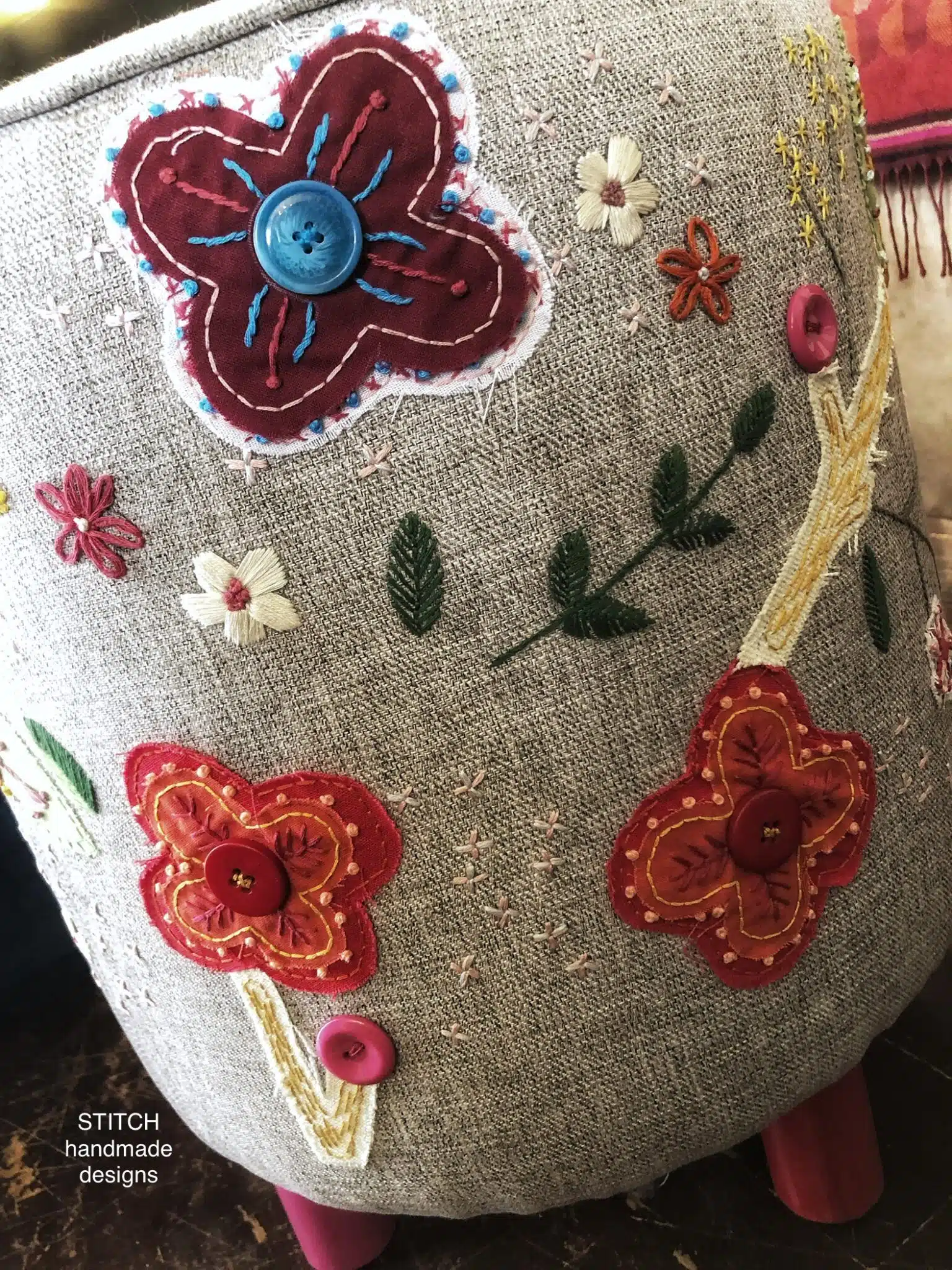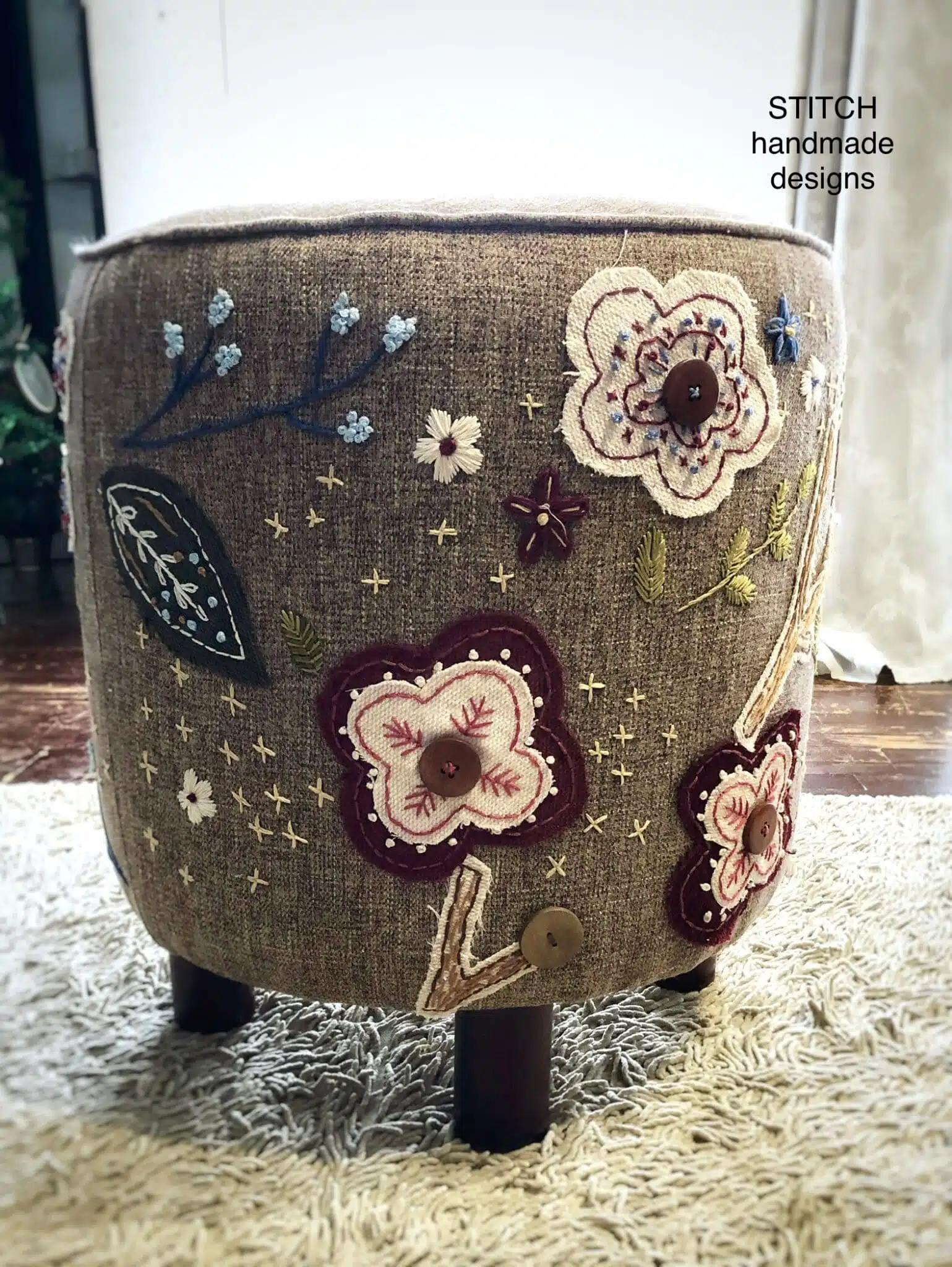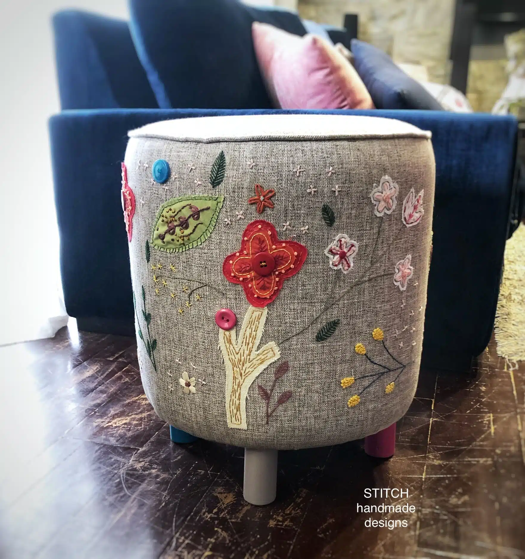 Hand embroidered applique ottoman.Available colors grey and brown.Fabrics may differ according to the availability.