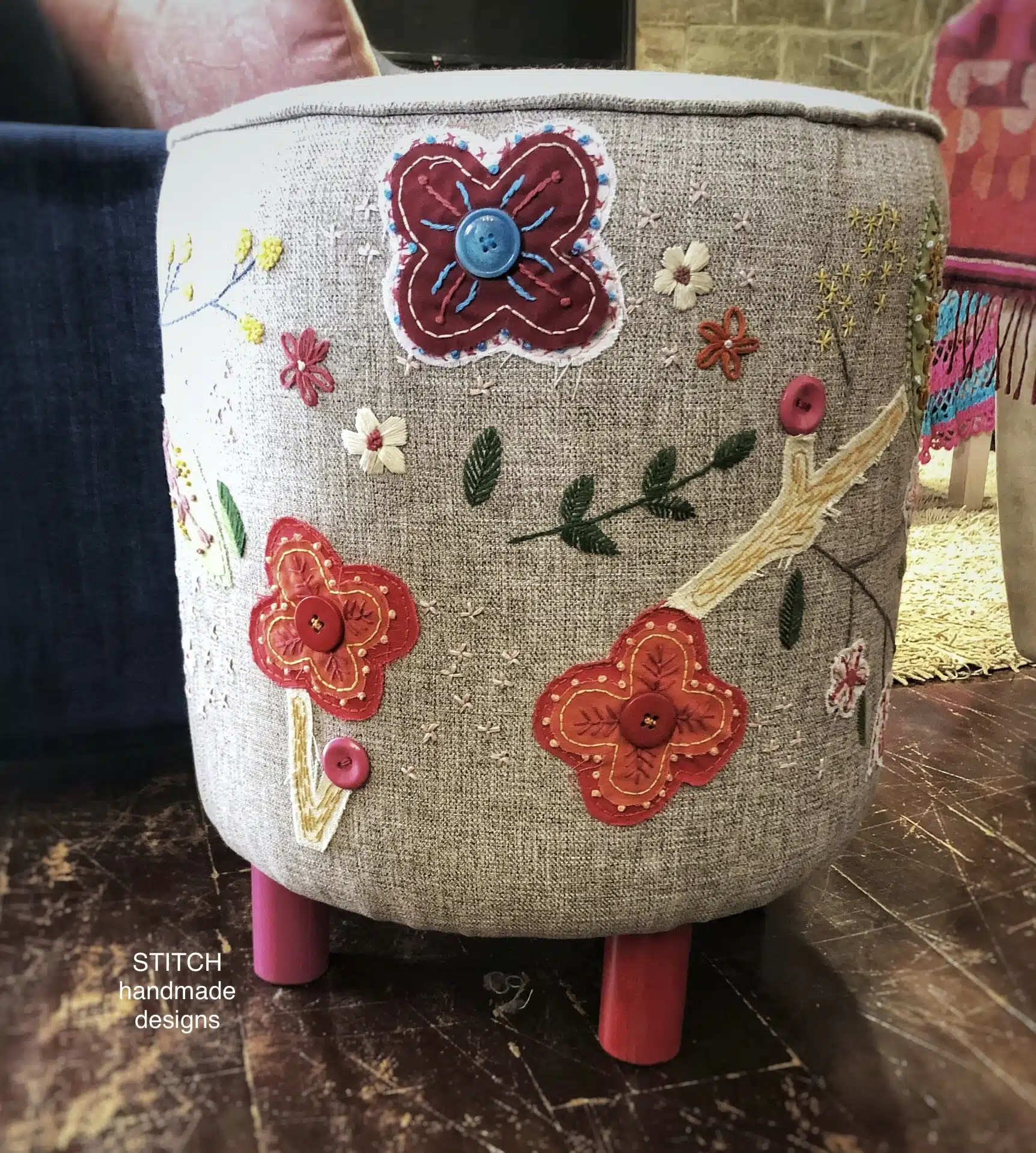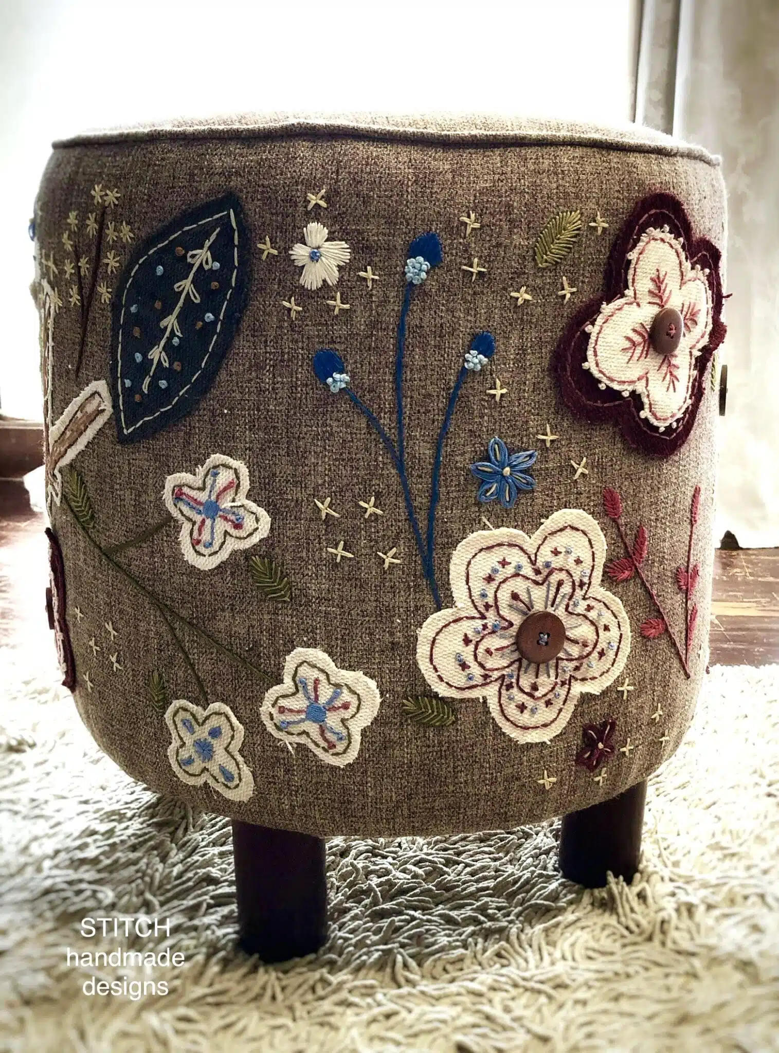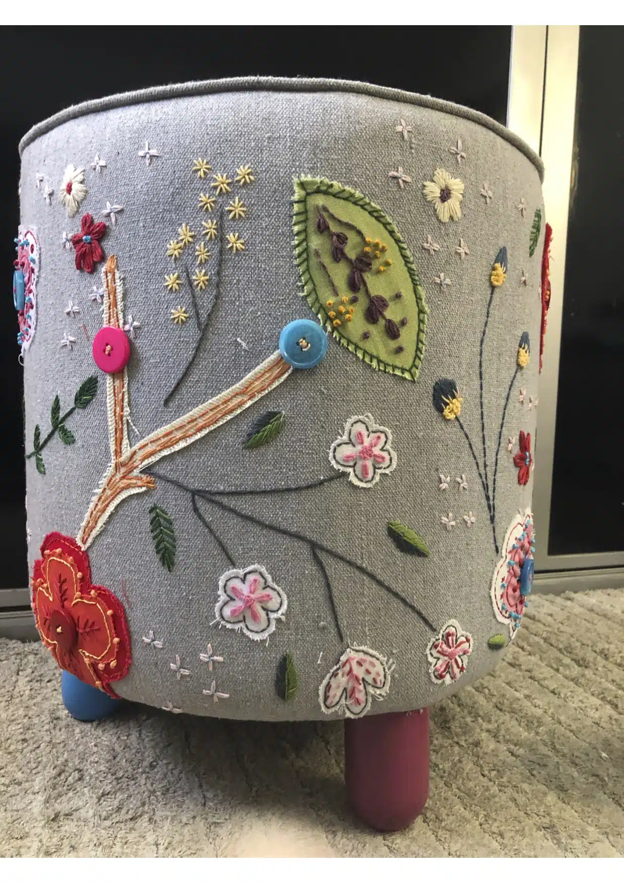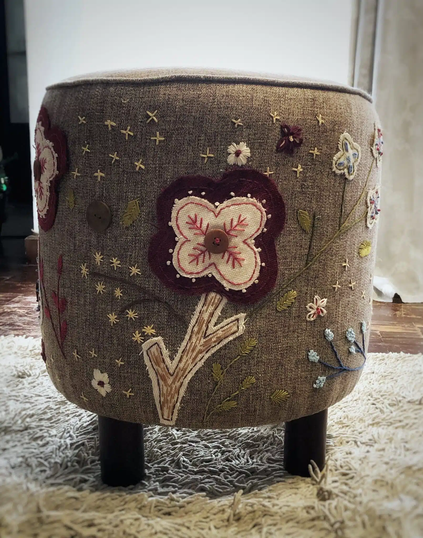 This vibrant round foot stool, adorned with colorful flowers and leaves, is the perfect addition to any room. With its applique embroidered design, the Blooming Ottoman brings a touch of nature and elegance to your living space.
