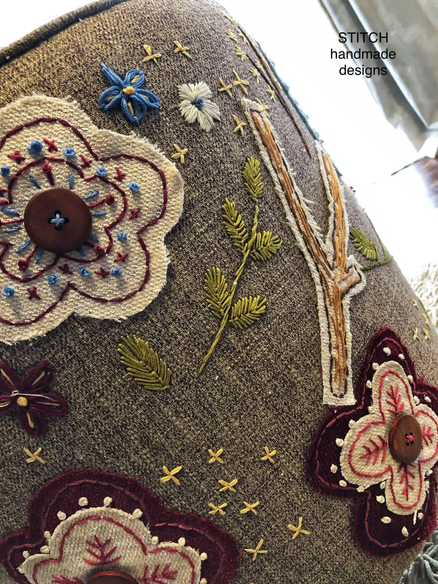 Hand embroidered applique ottoman. Available colors grey and brown. Fabrics may differ according to the availability.