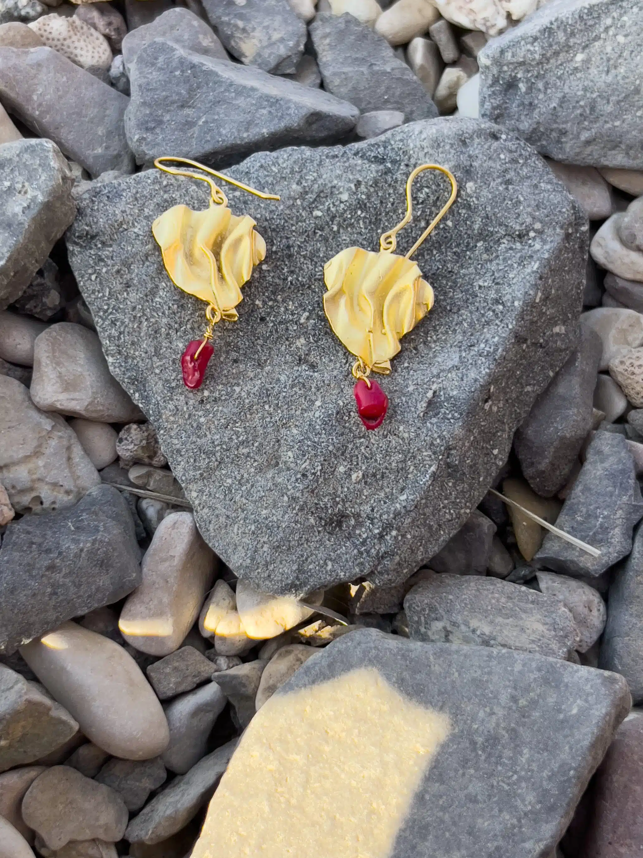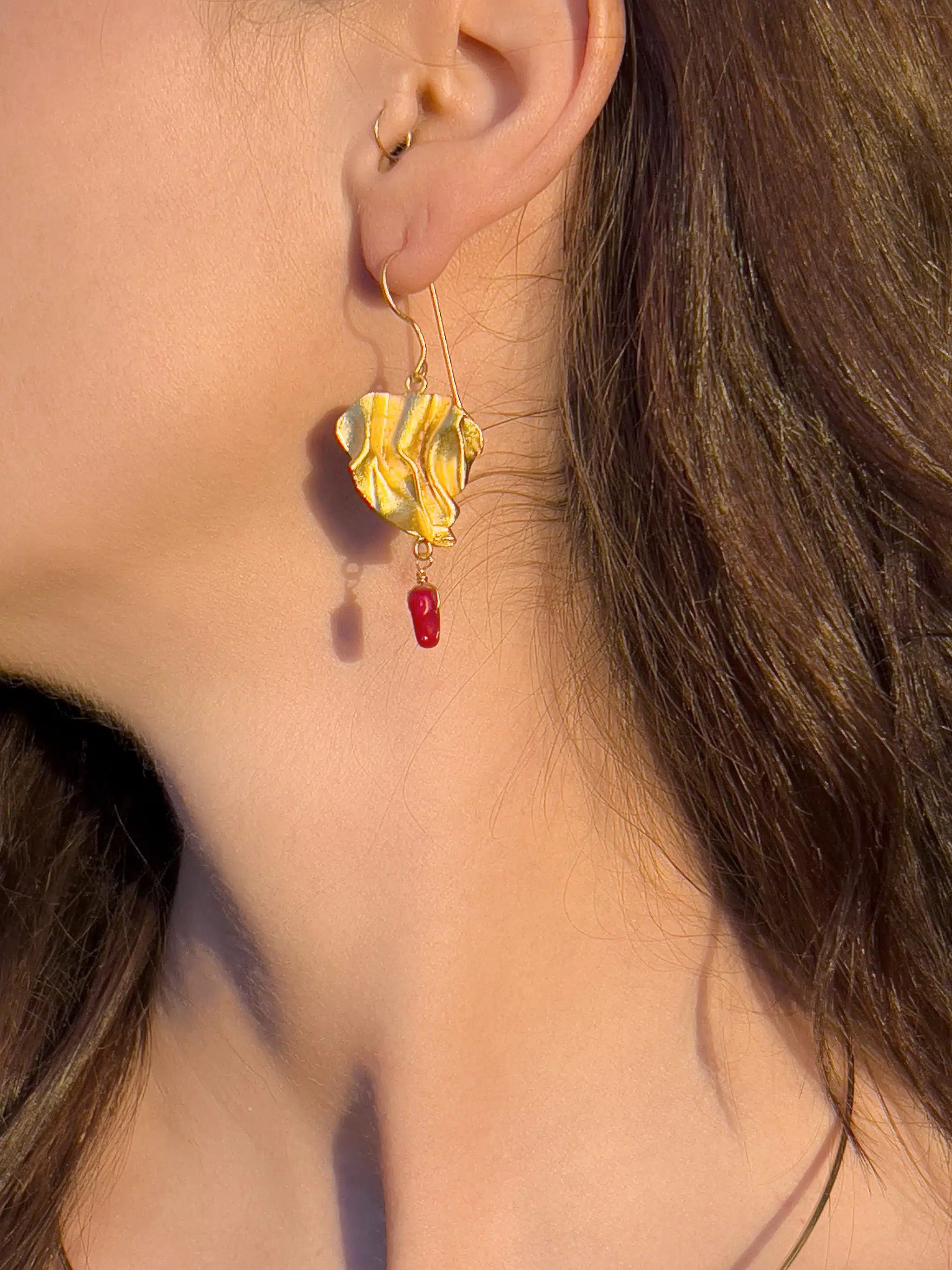 Handcrafted Gold Platted Sterling Silver Earring with a Red Precious Coral Gemstone, Each Fold and Form Reflects Organic Textures