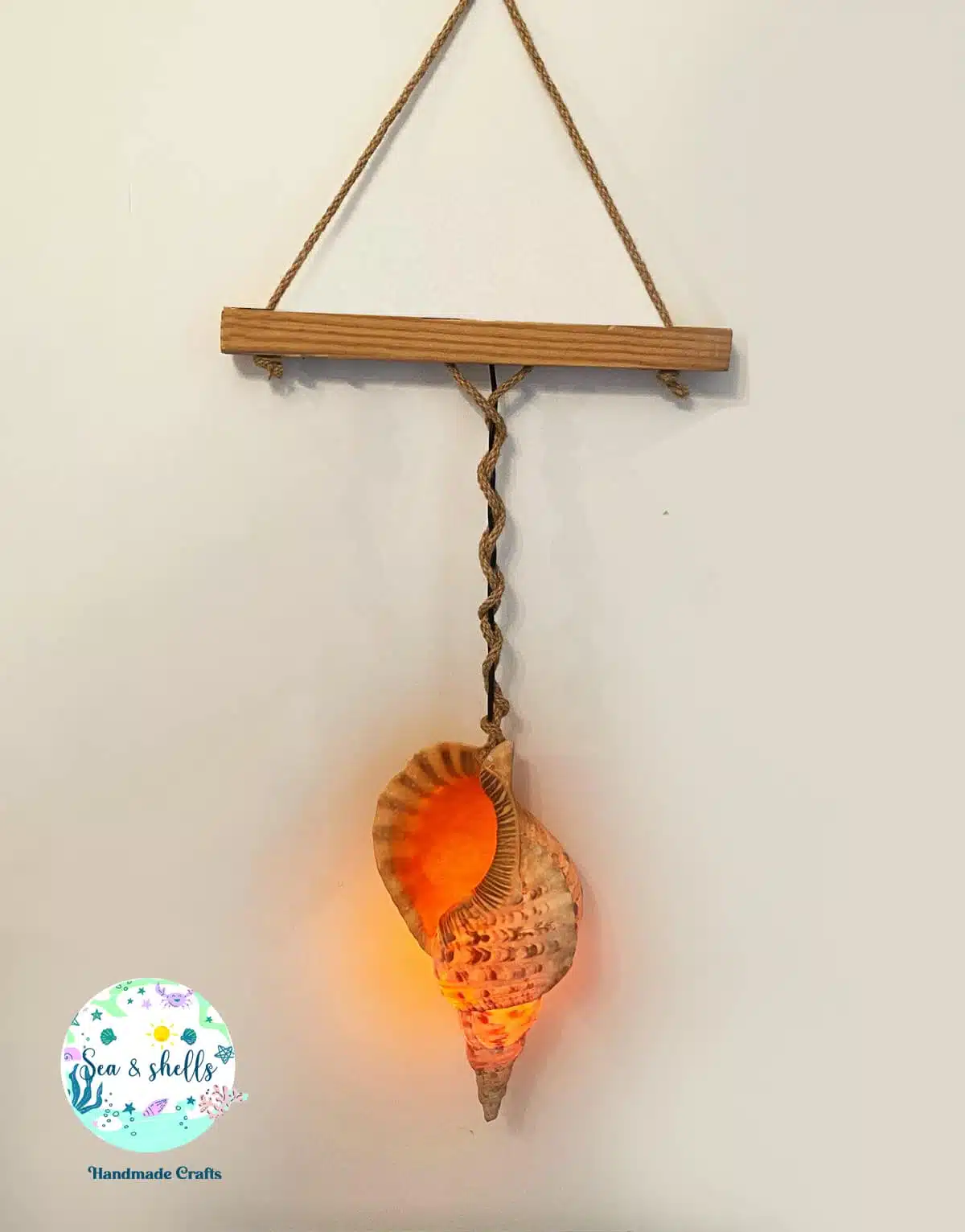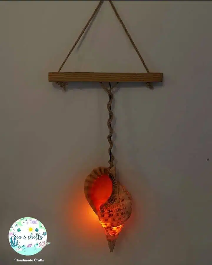 A wooden stick Connecting a real seashell lightened from inside all linked with rope.