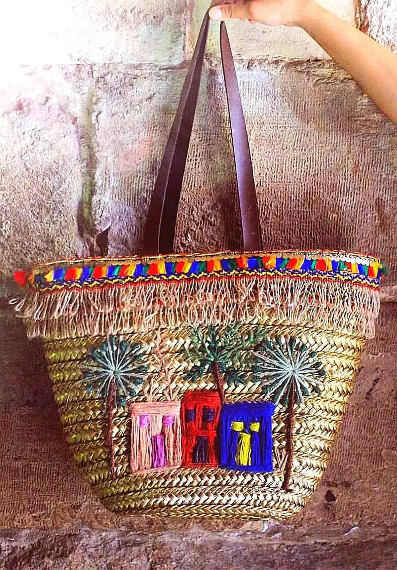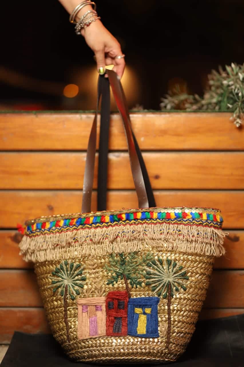 A bag made of natural, environmentally friendly reinforced wicker. It is lined on the inside and has a long handle, completely embroidered by hand with natural linen threads and natural colored burlap. The bag is spacious on the inside, suitable for the beach, shopping, club, travel, and gym. It is completely dyed in a very trendy golden color.