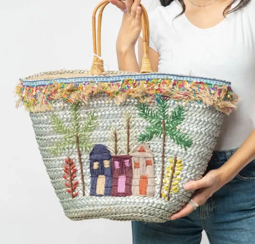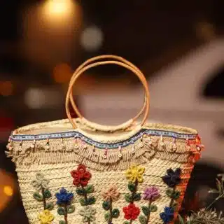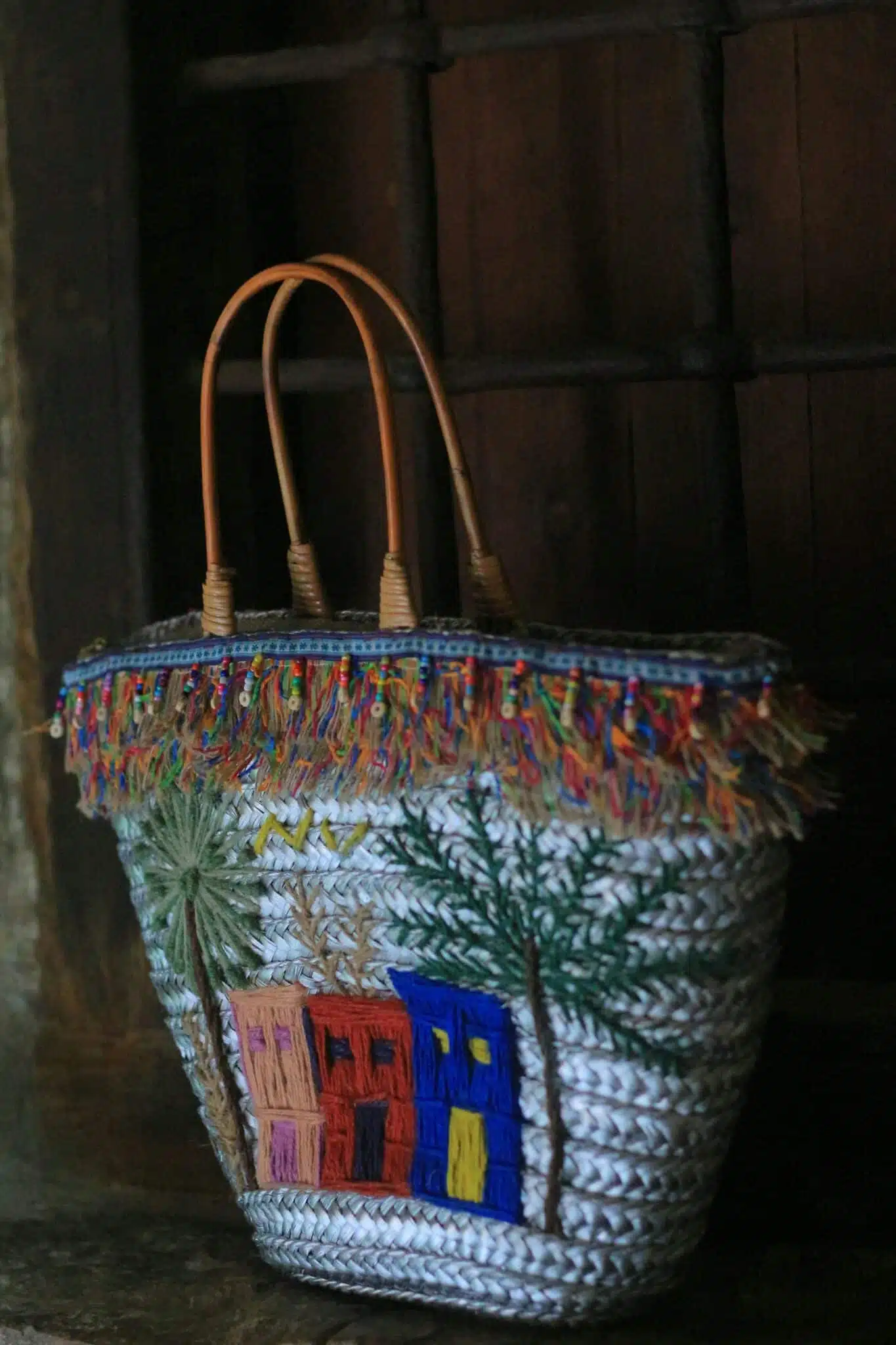 A bag made of natural, environmentally friendly reinforced wicker. It is lined from the inside and has a handle made of bamboo wood. It is completely hand-embroidered with natural linen threads in the shapes of Nubian houses and embroidered with colored natural burlap. The bag is spacious and suitable for daily use, the sea, travel, the gym, or shopping