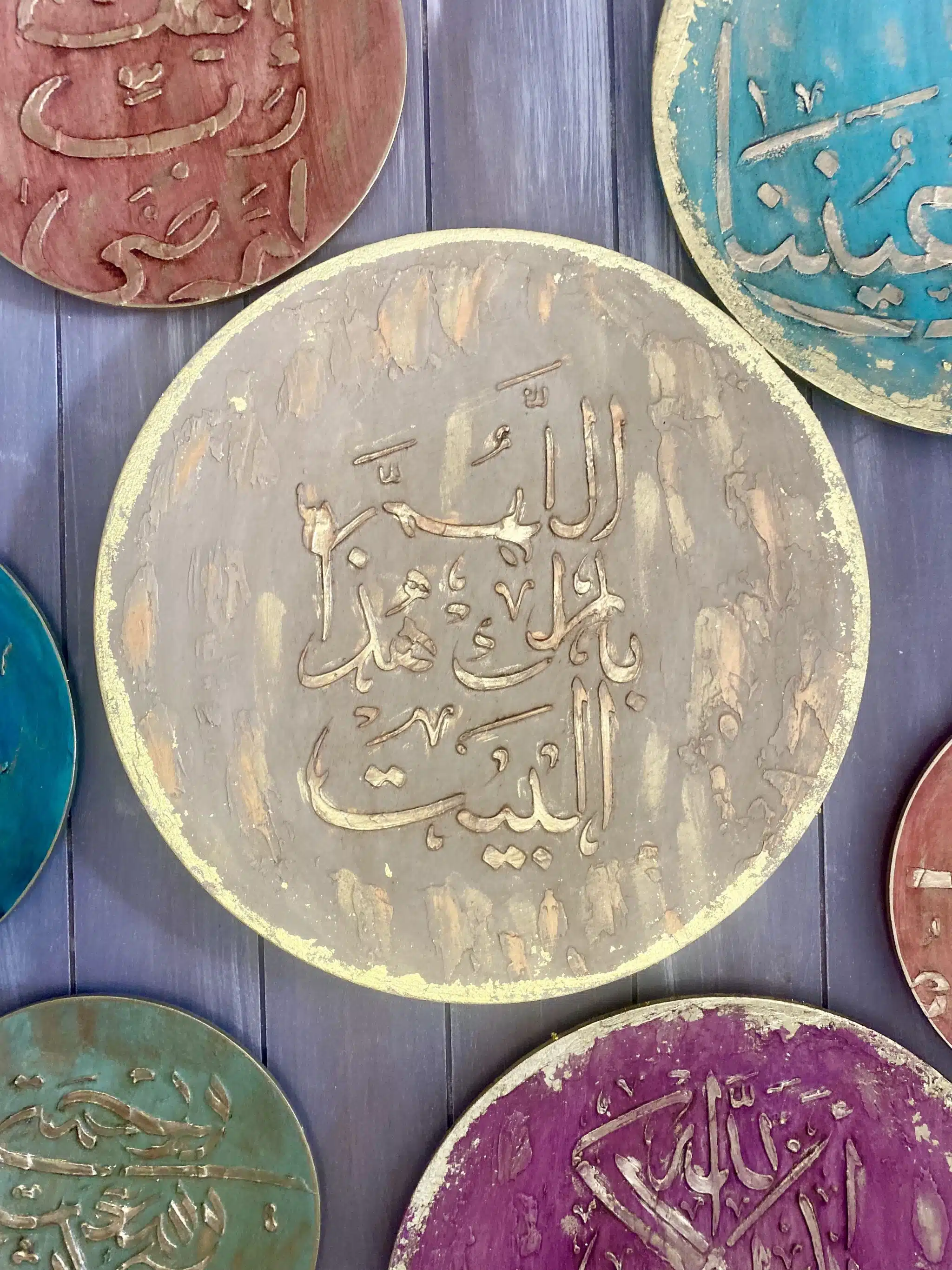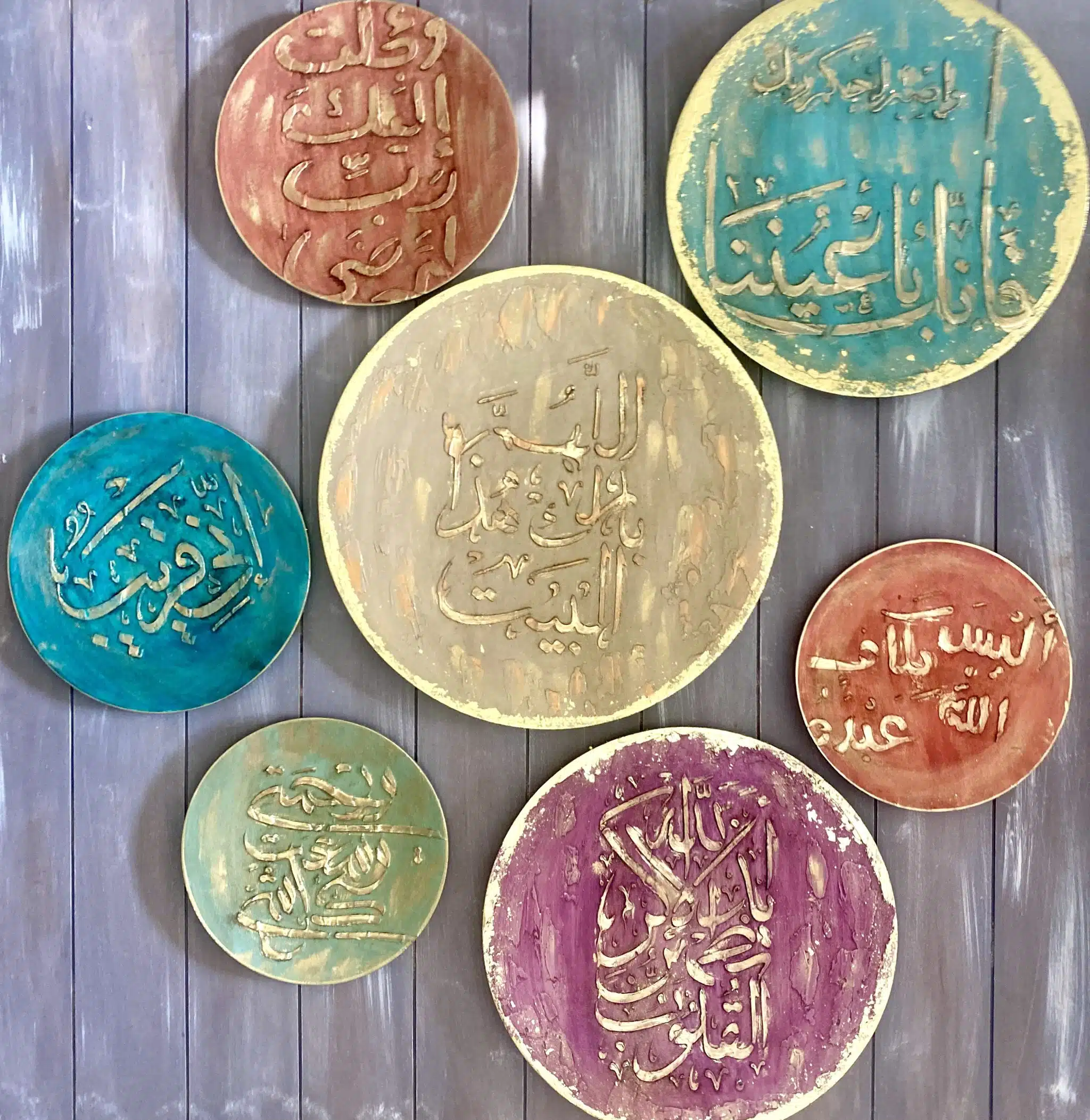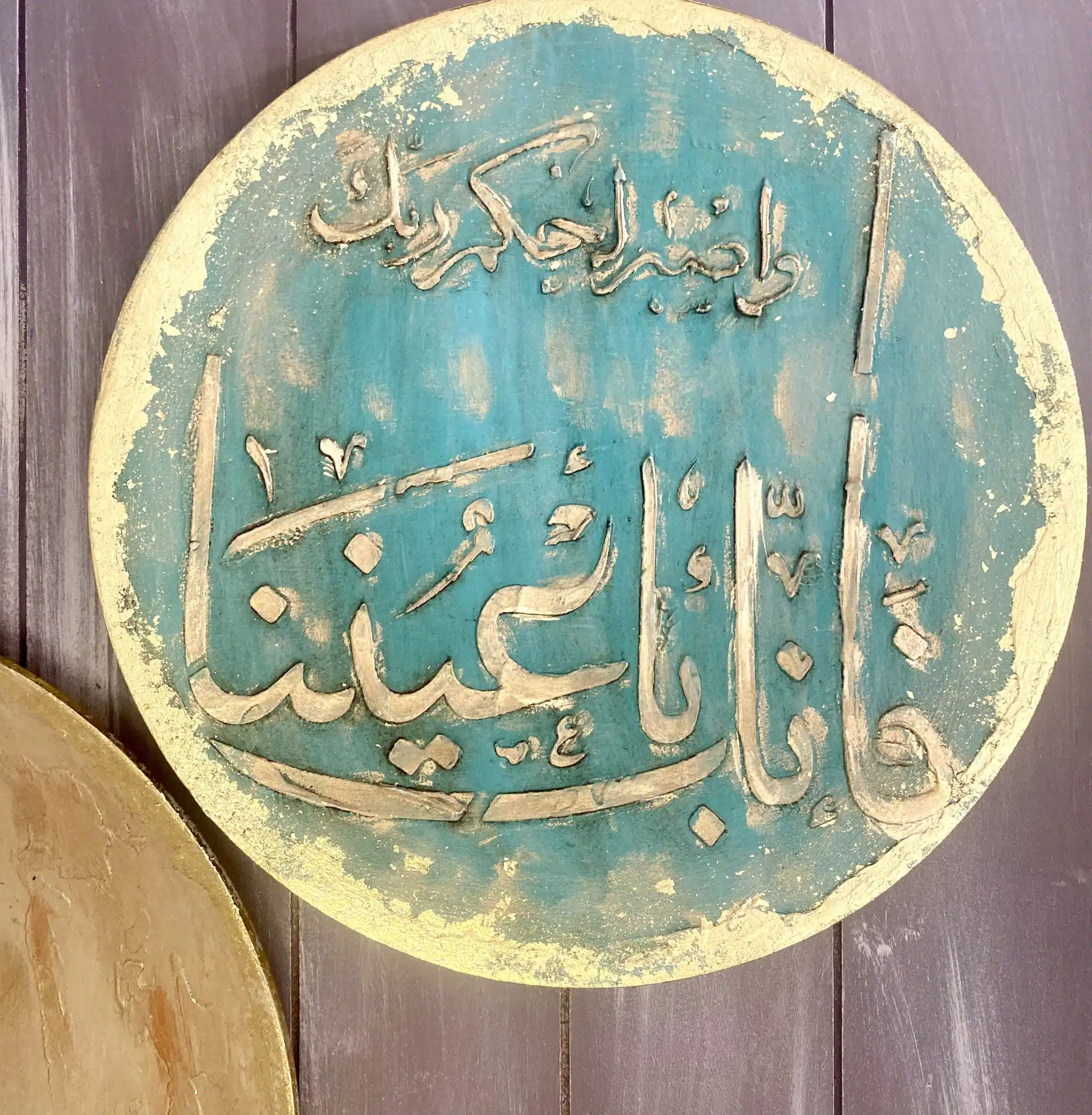 Wooden handmade wooden decoration plates on wall in Arabic Designs and gold leaf