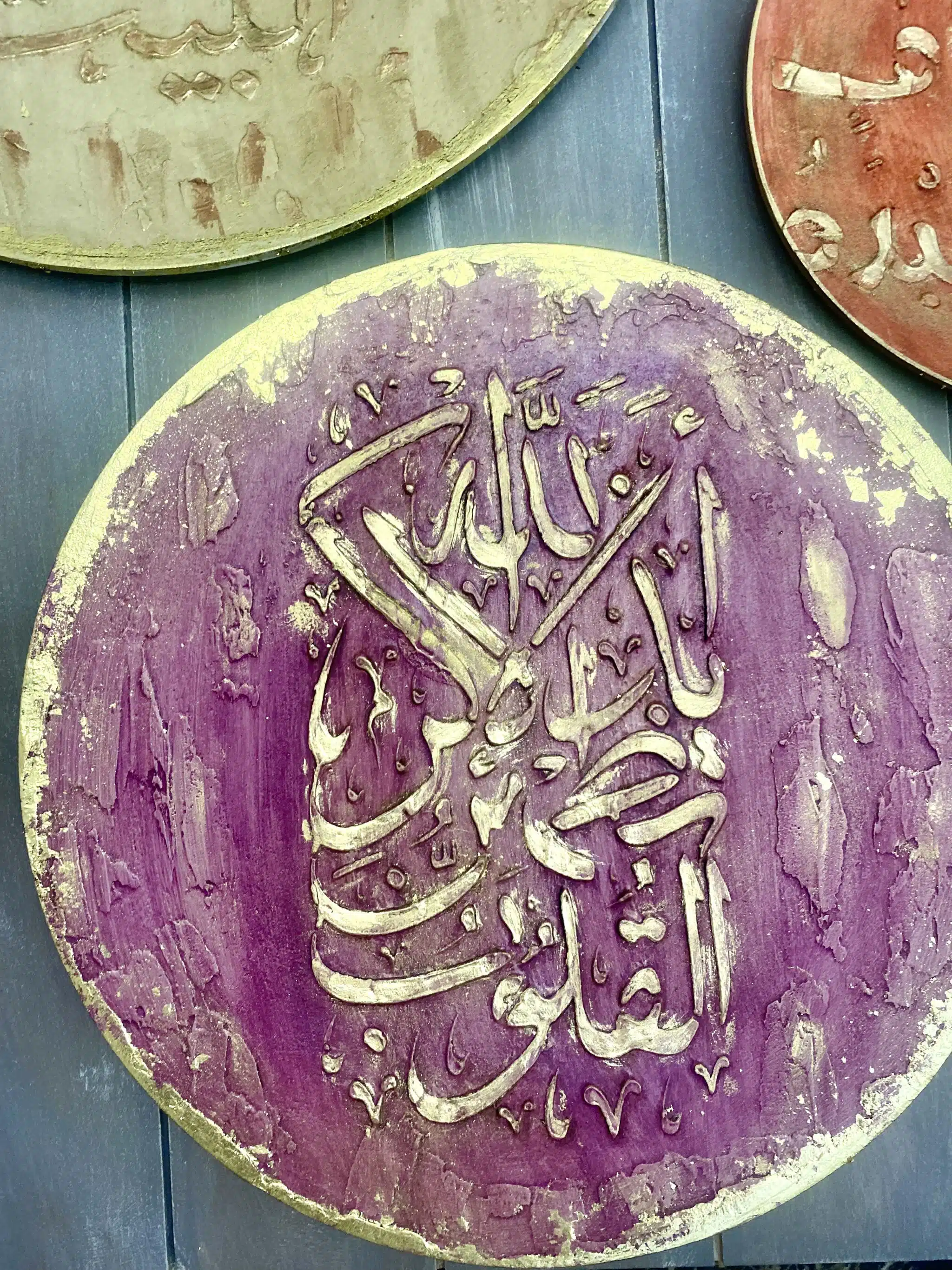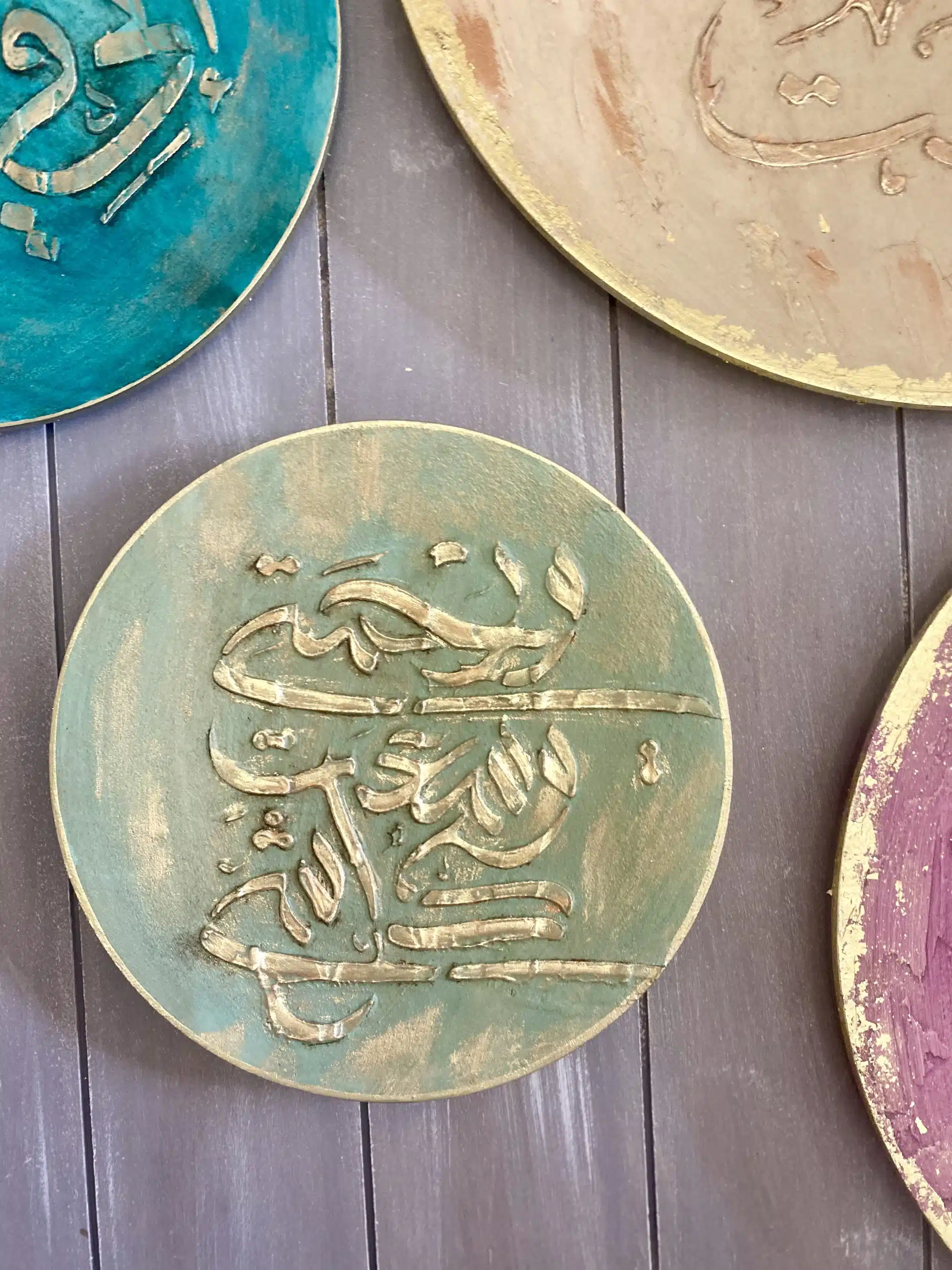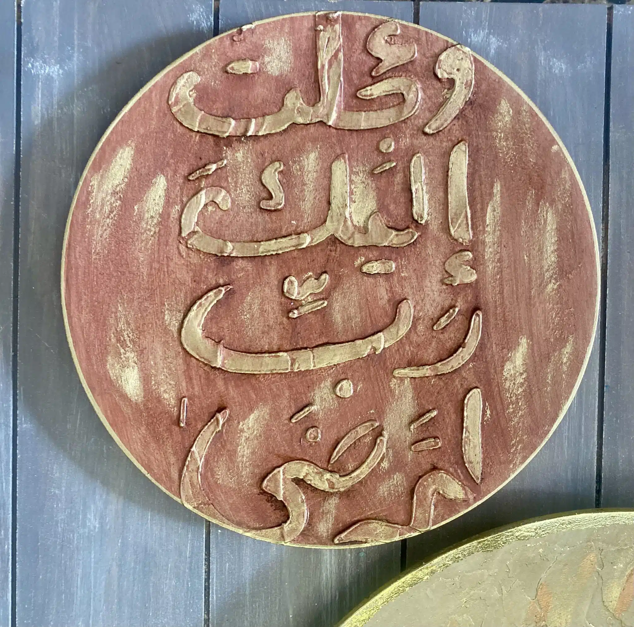 Wooden handmade wooden decoration plates on wall in Arabic Designs and gold leaf