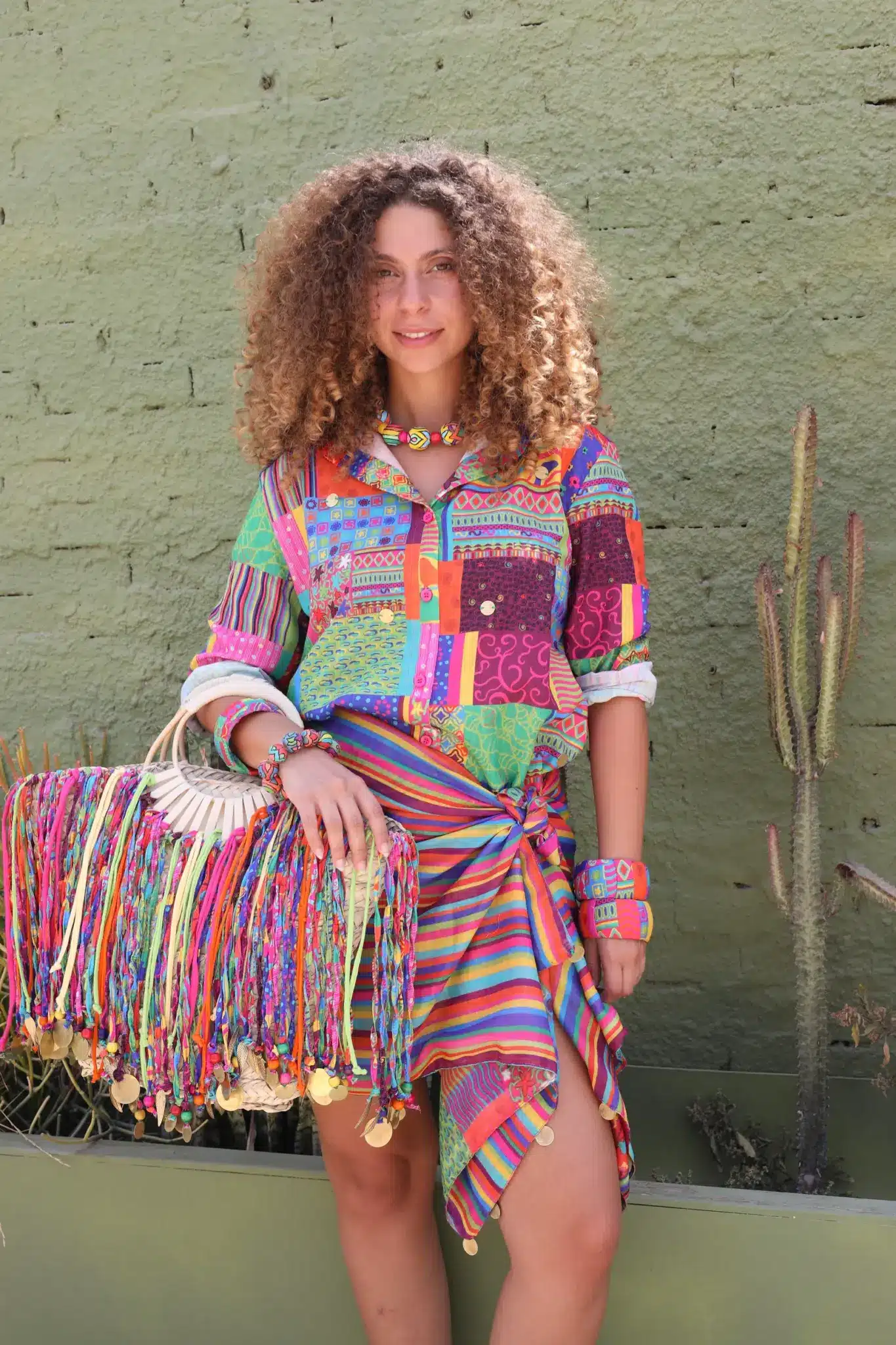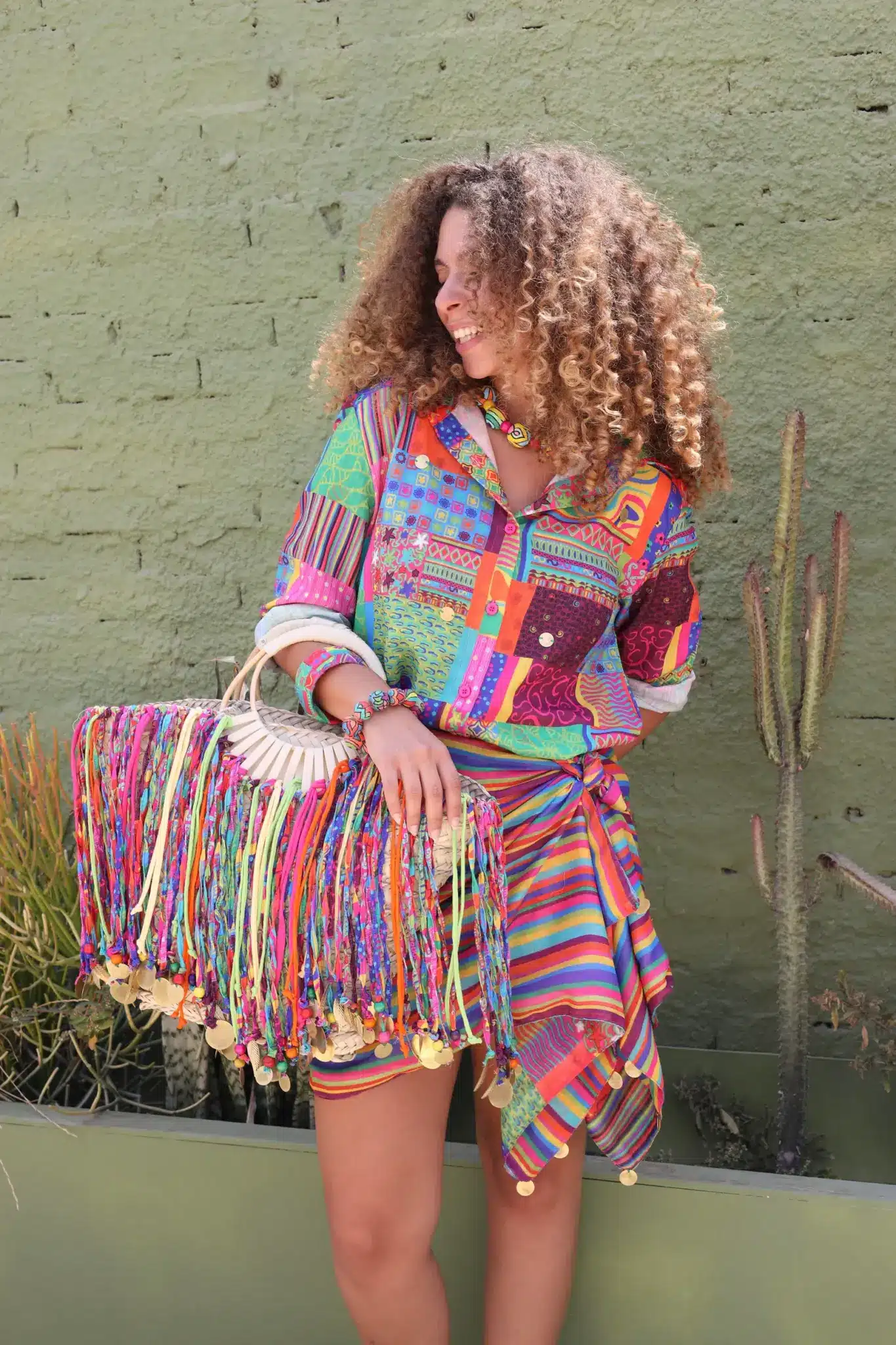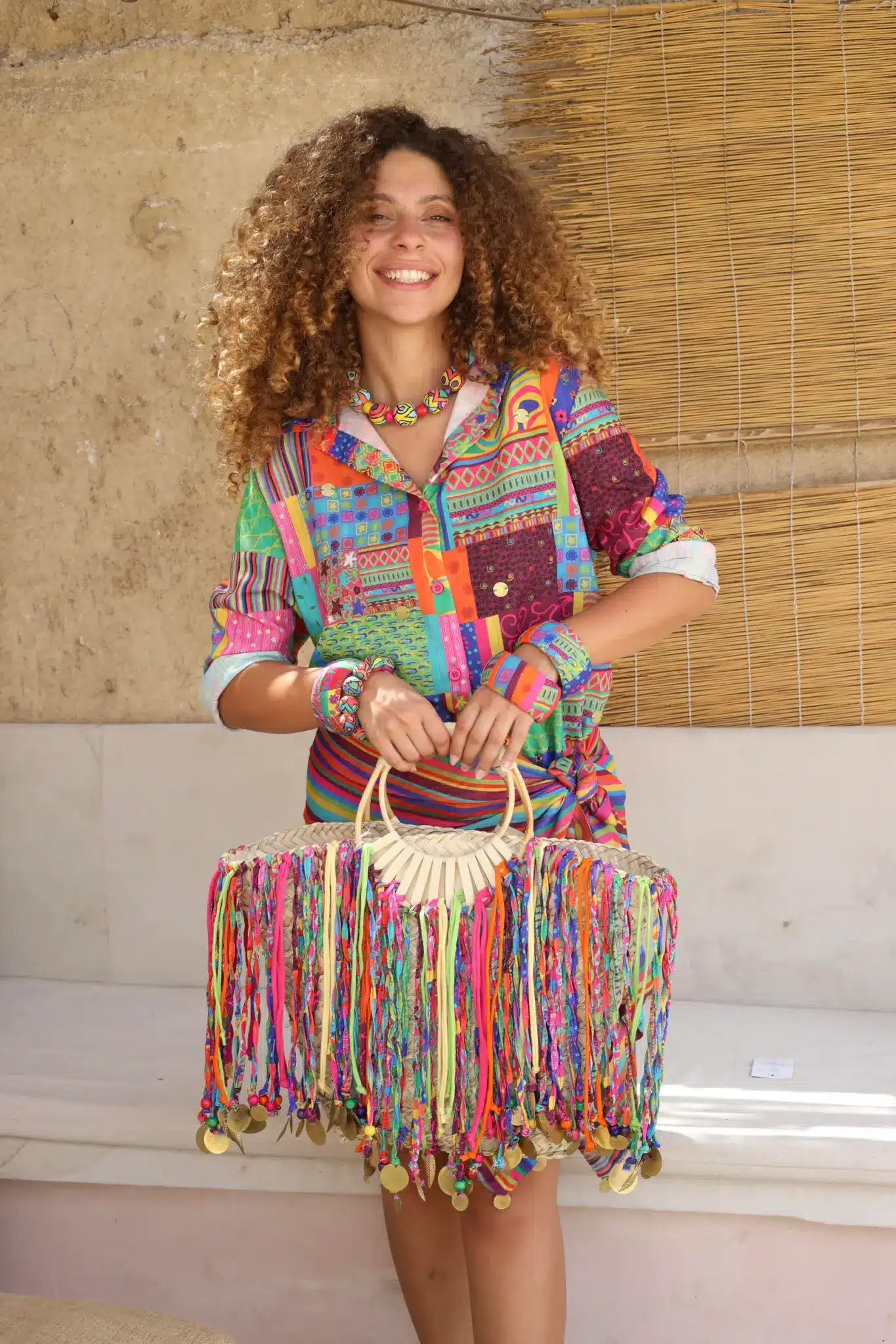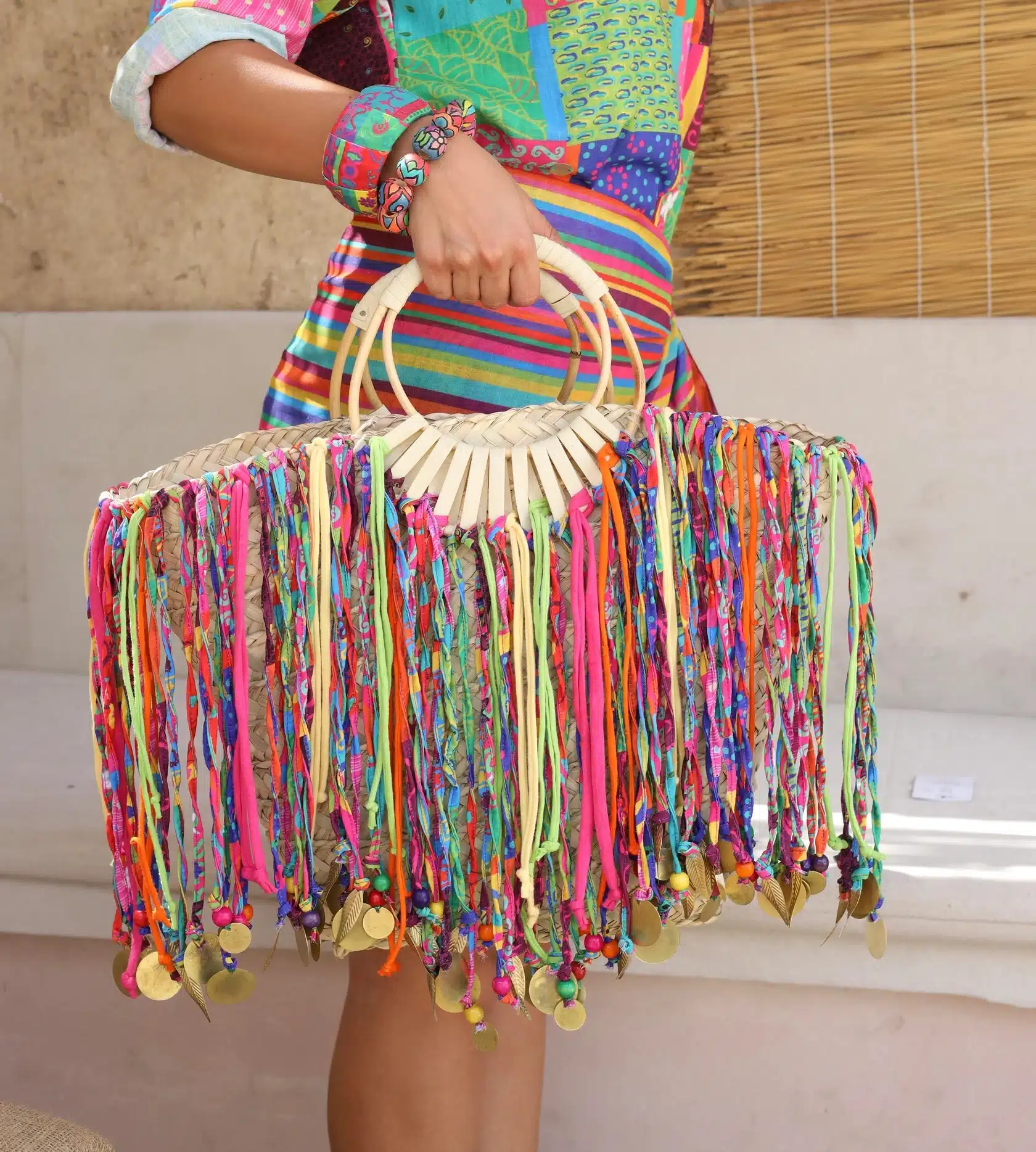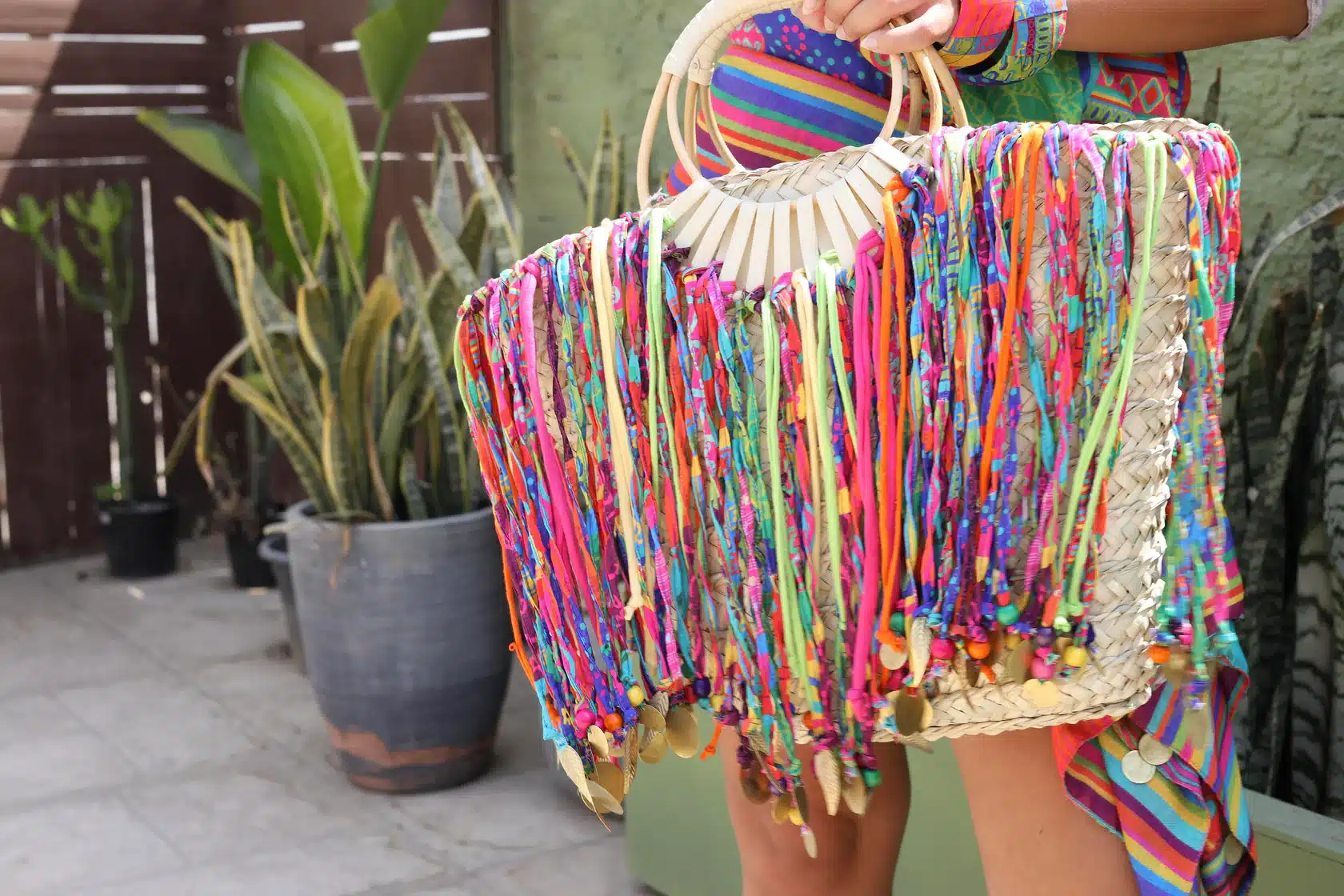 Meet the Happy Hippie beach bag that will level up all your summer outfits. It features one of a kind tassels that are made from our own colorful printed fabrics to be your playful caryall for beach days, morning picnics, or any outing under the sun. It’ll be your favorite accessory that will add vibrant energy to any outfit. It’s large enough that can fit all your stuff from your keys to your laptop and beach slippers.