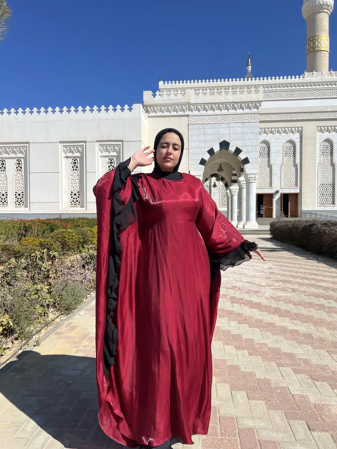 The Leila Burgundy Kaftan is an elegant one-size piece crafted from a soft, shiny material that drapes beautifully for a graceful look. Featuring striking black swirls along the borders, this kaftan blends sophistication with modesty, making it perfect for soirées, Ramadan gatherings, prayer, and refined outings. Its flowing design ensures comfort and effortless elegance, making it a timeless addition to your wardrobe.