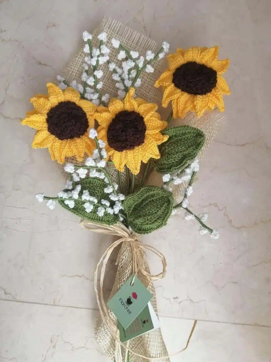 3 Sunflowers + 4 Gypsophilas + Beige sackcloth wrap
