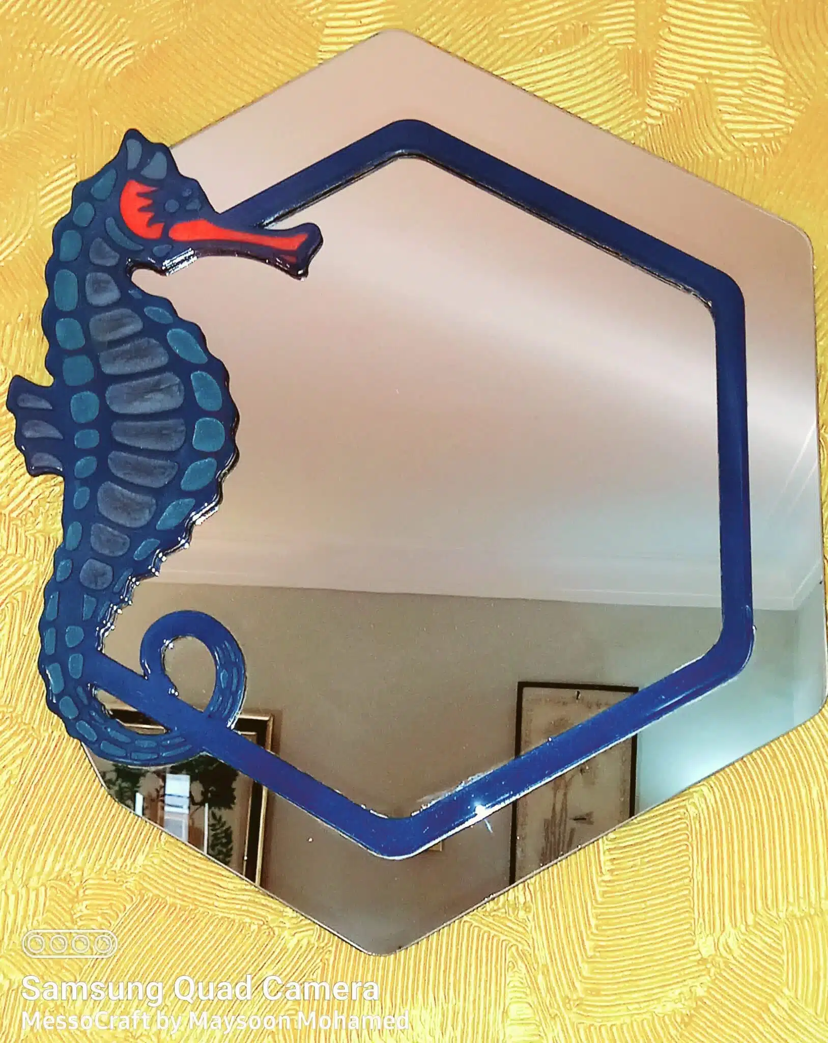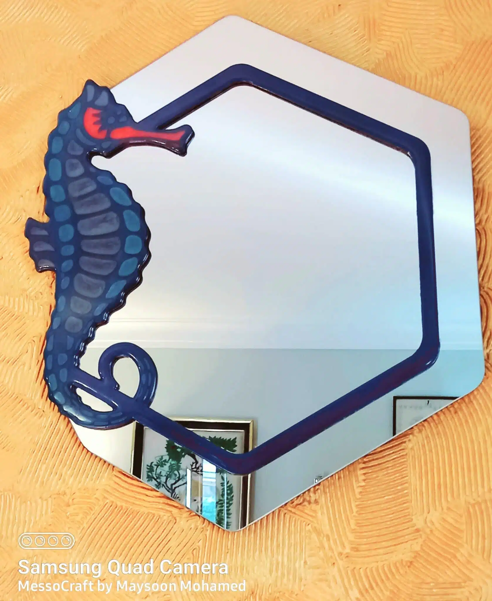 Hexagon mirror with a wooden frame and seahorse filled with pearly metallic resin colours