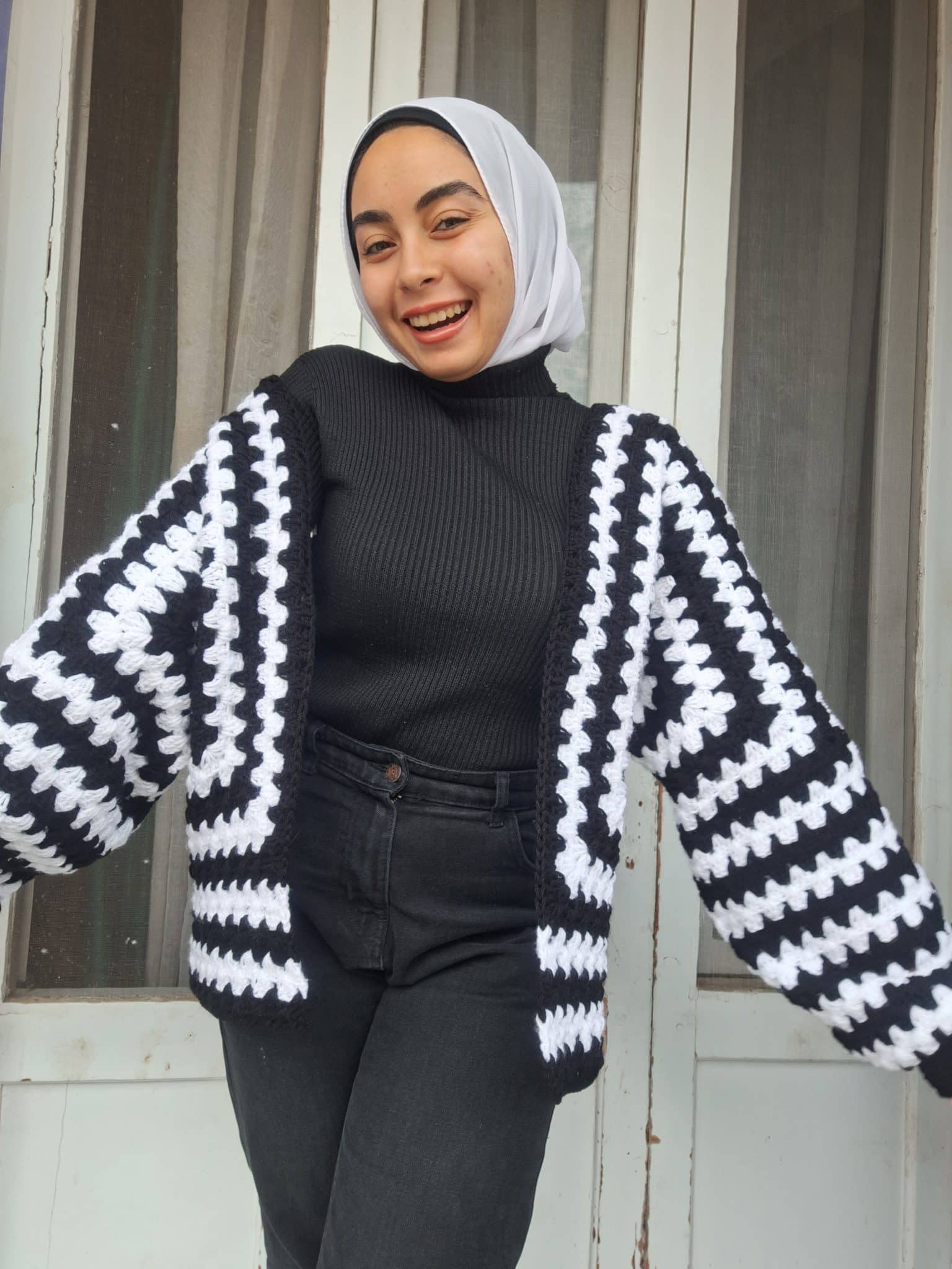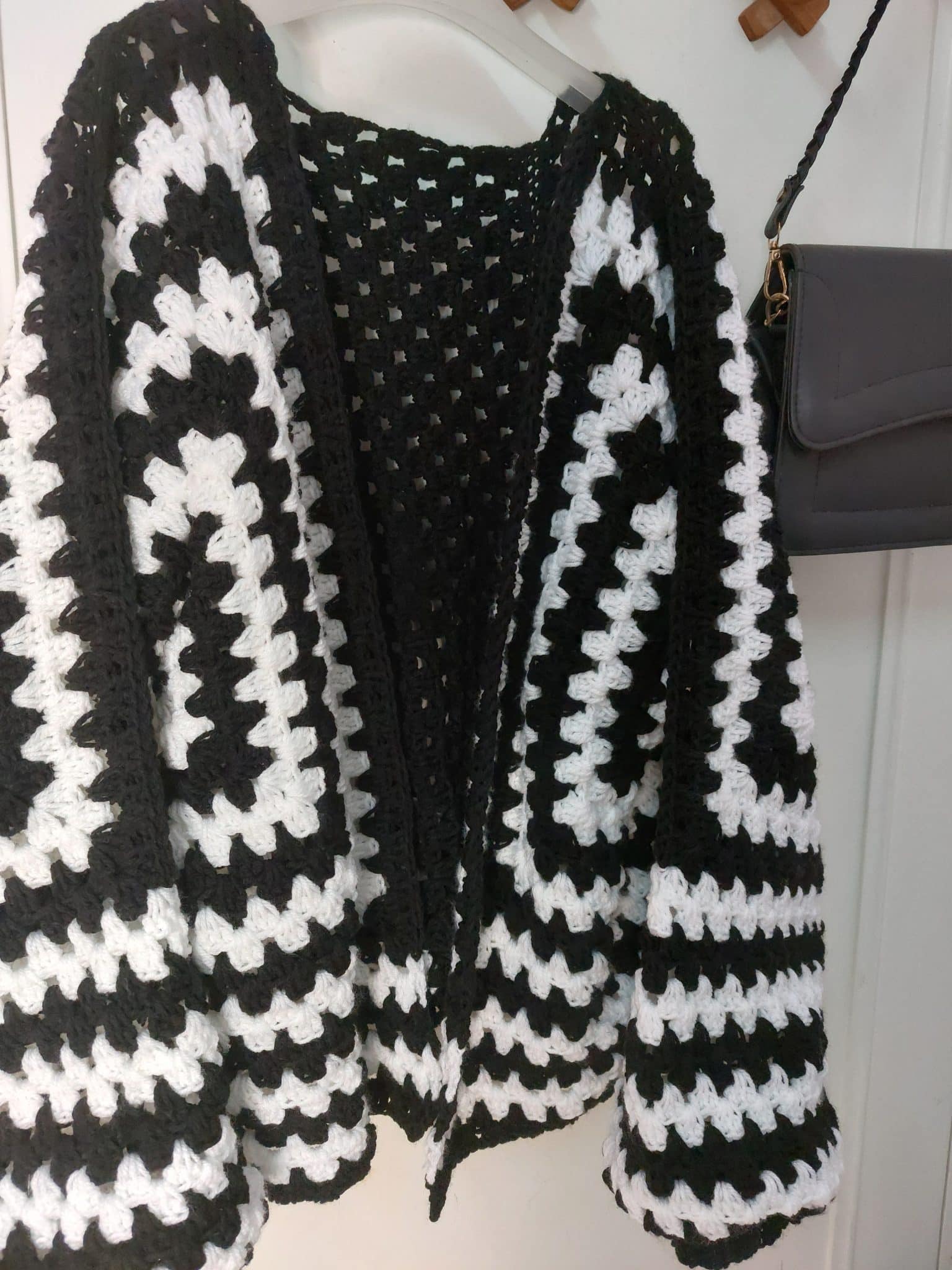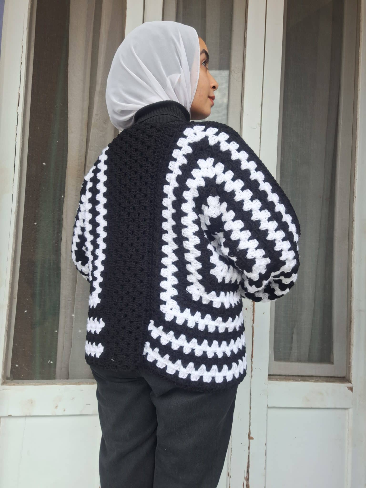 Stay warm and stylish with this oversized crocheted cardigan. Crafted from soft and cozy Turkish wool yarn, it offers a relaxed fit and a touch of bohemian flair. The bold black and white pattern adds a modern edge to this timeless piece.