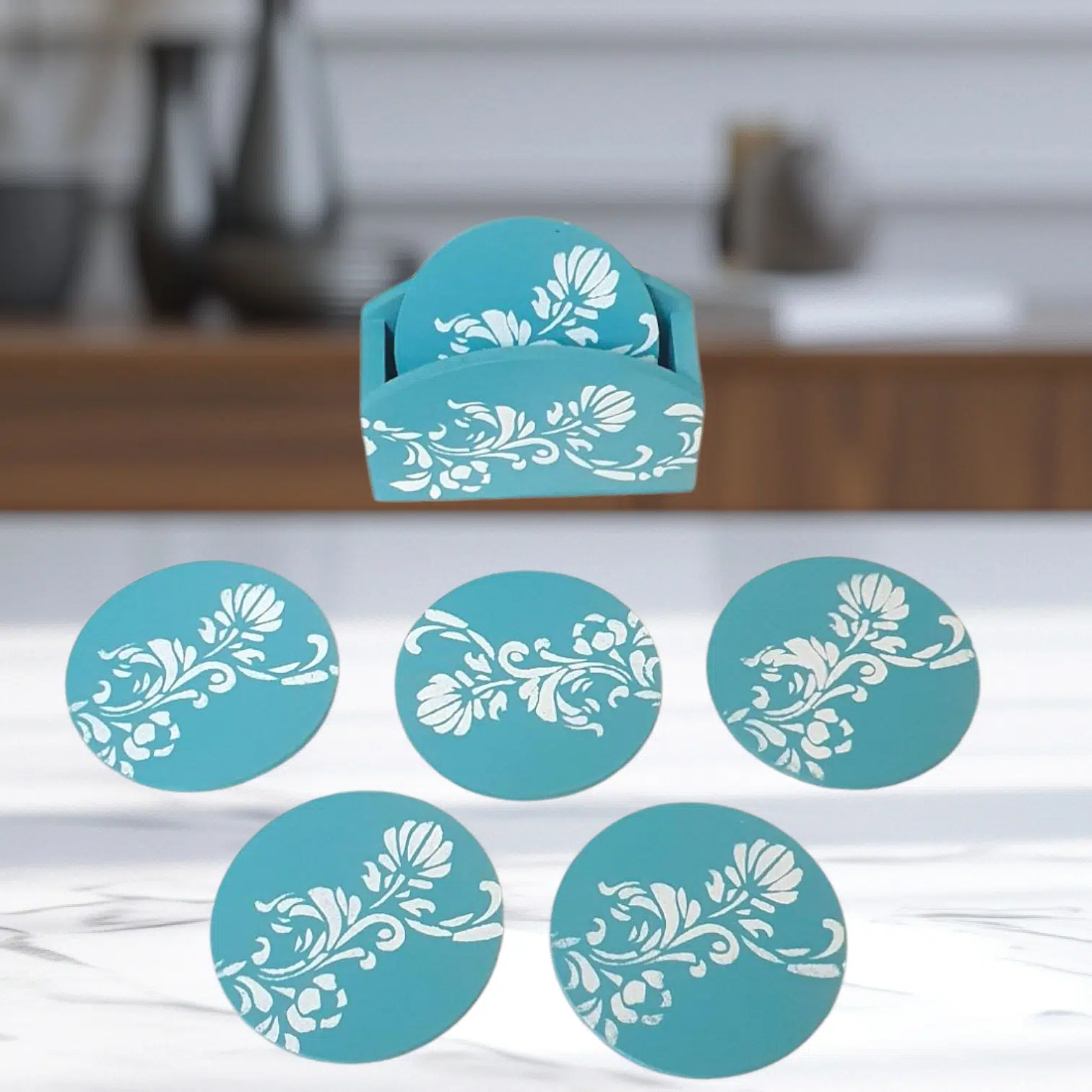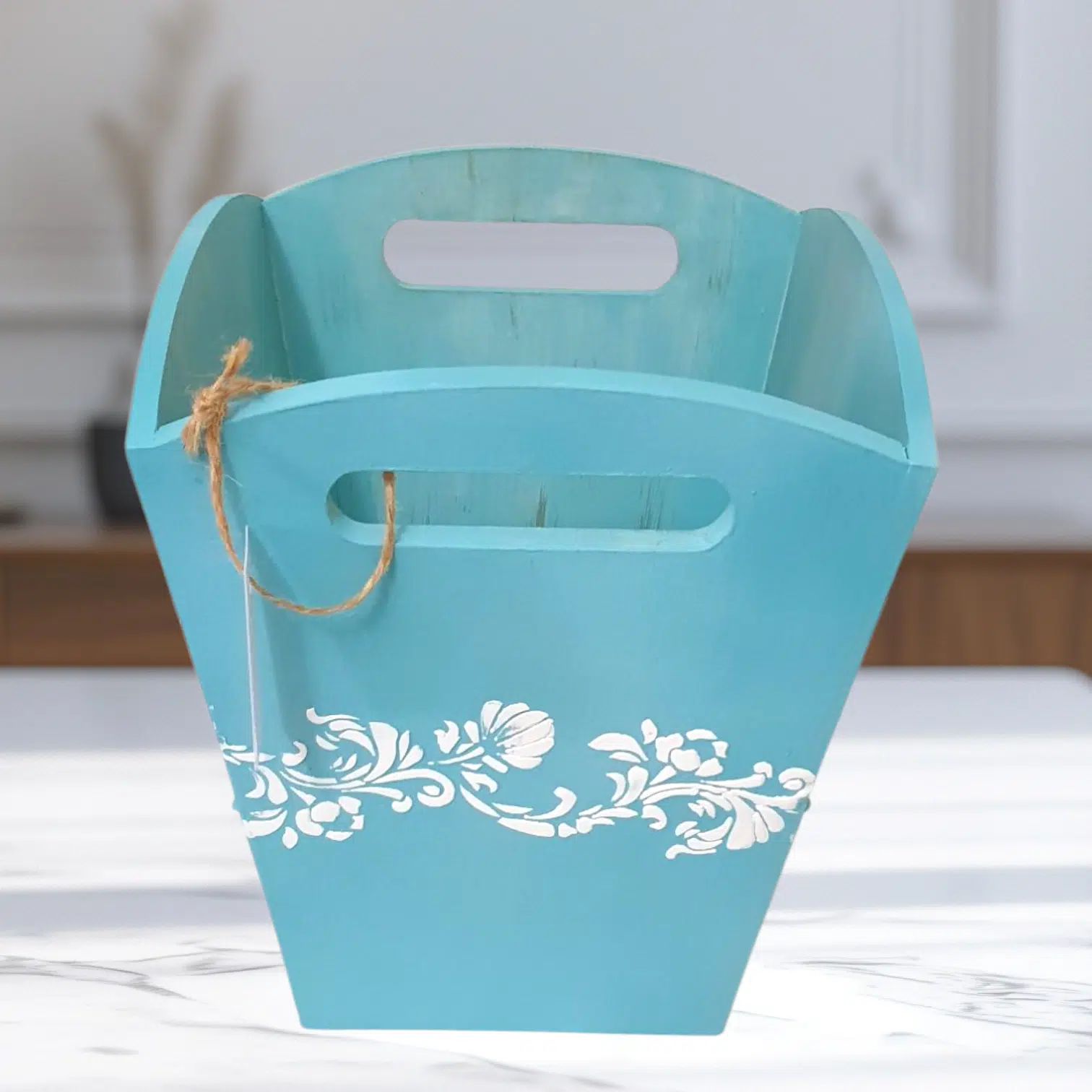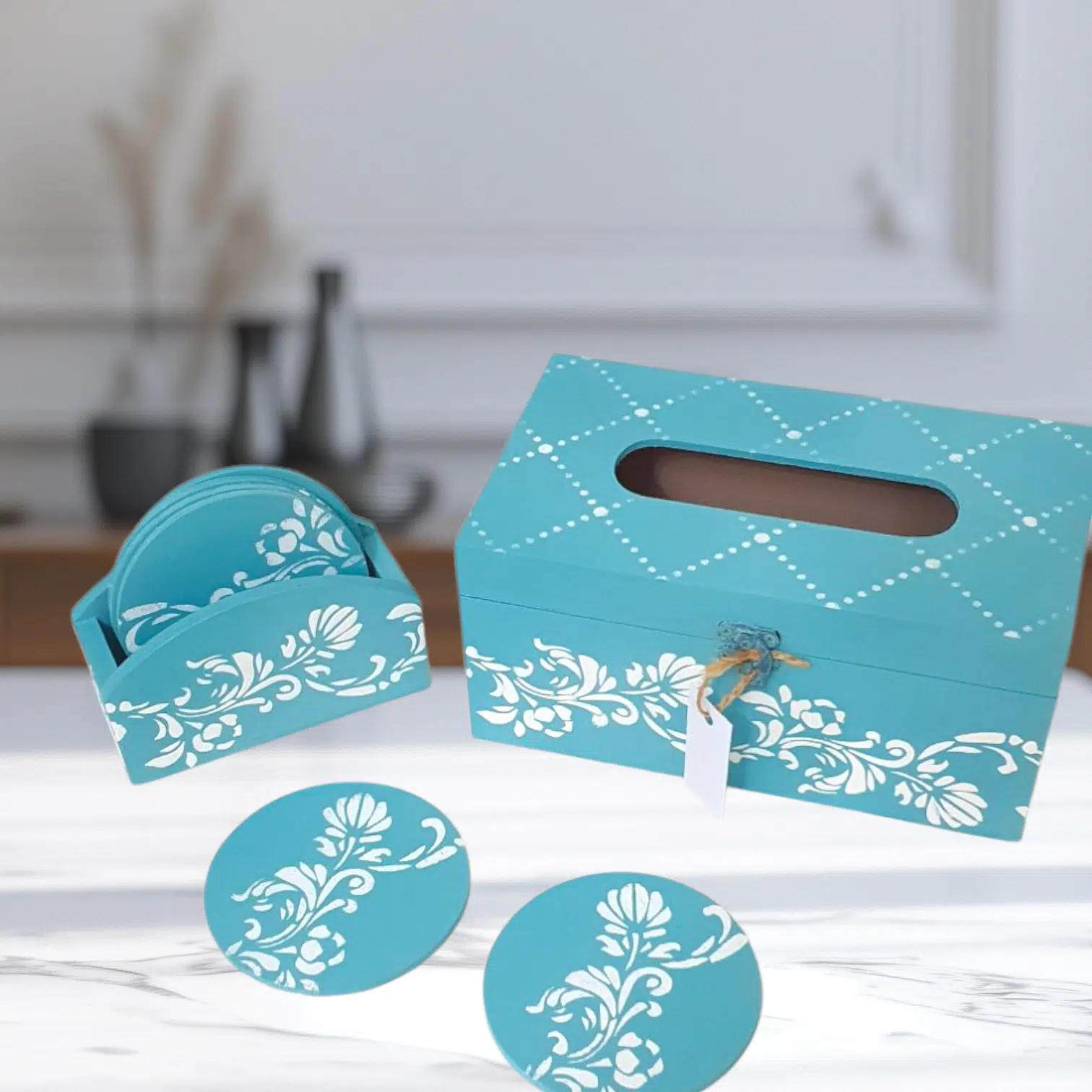 Set includes a tissue box, set of coasters, basket (can be used a a bin or a plant pot).