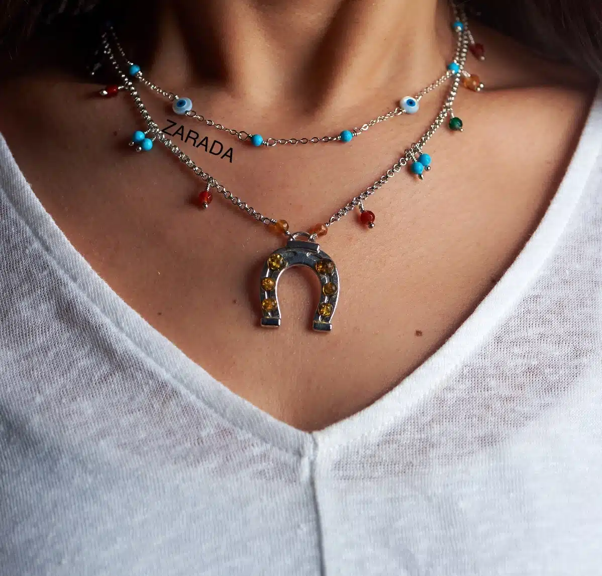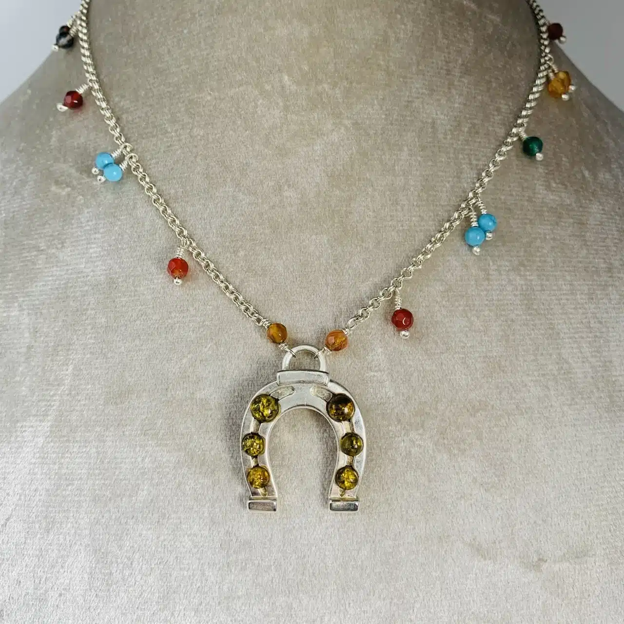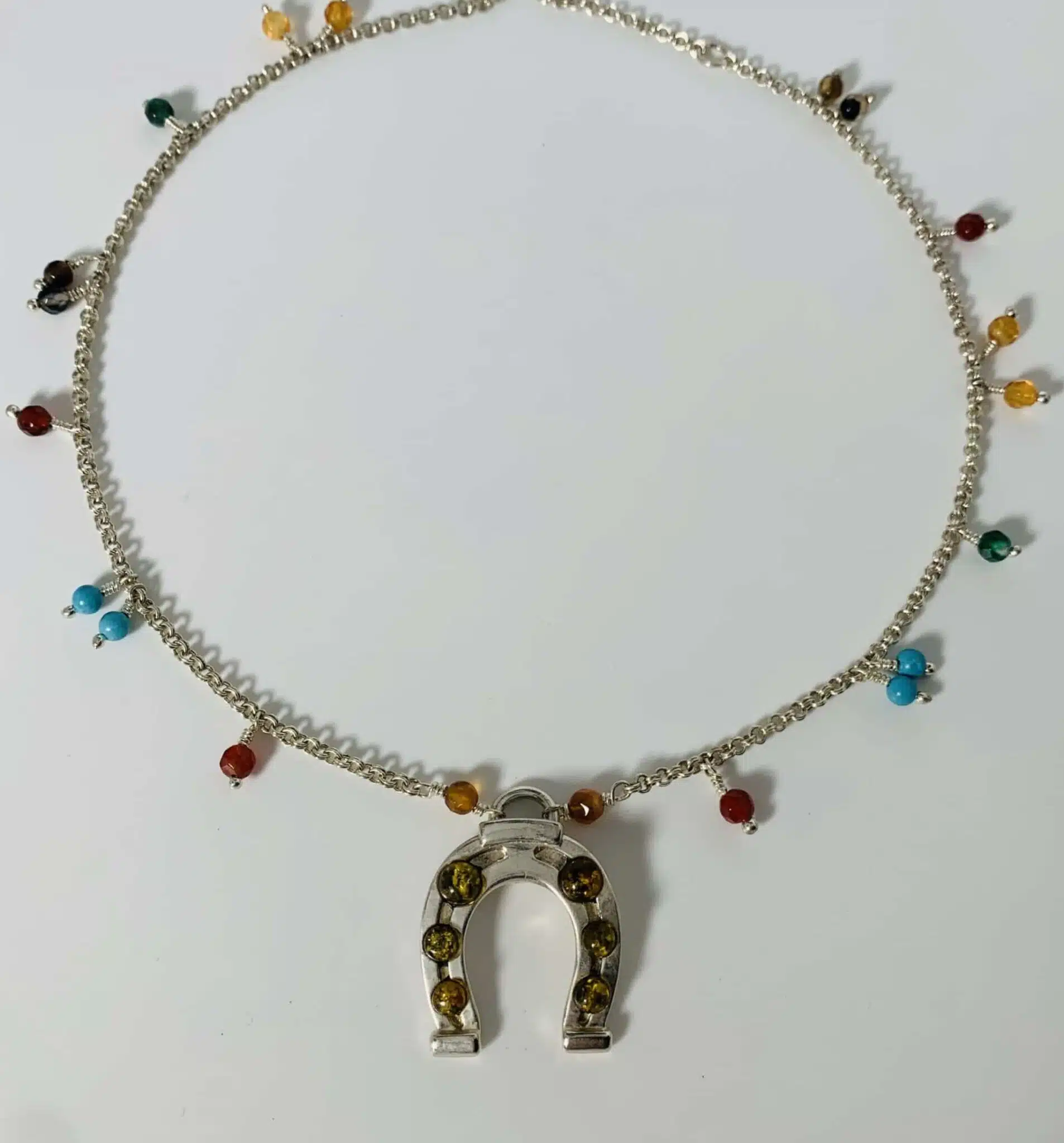 925 sterling silver beaded chain with handcrafted horseshoe pendant with amber stones.
