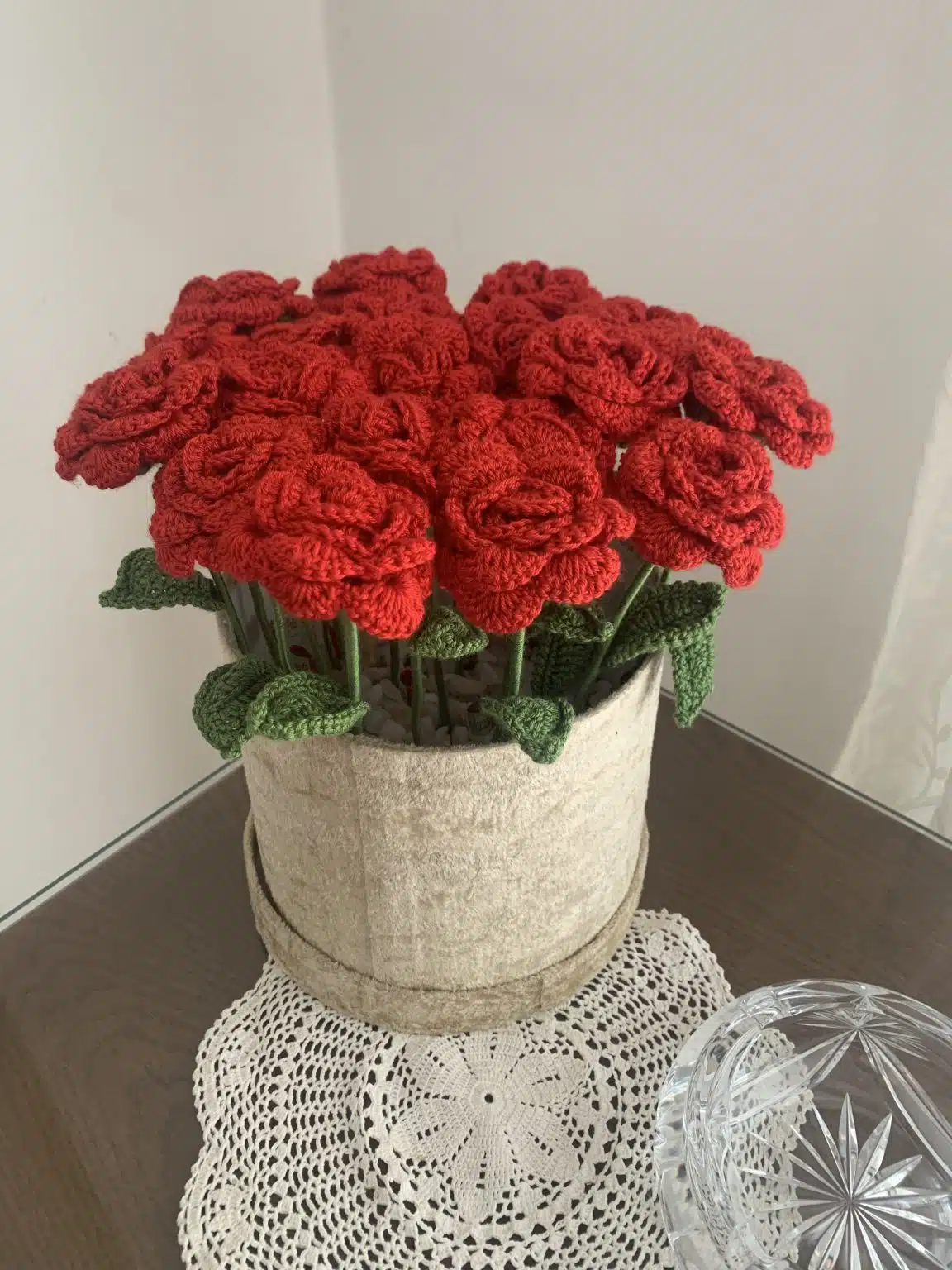 The crochet flower is made of cotton yarn with a silk effect.