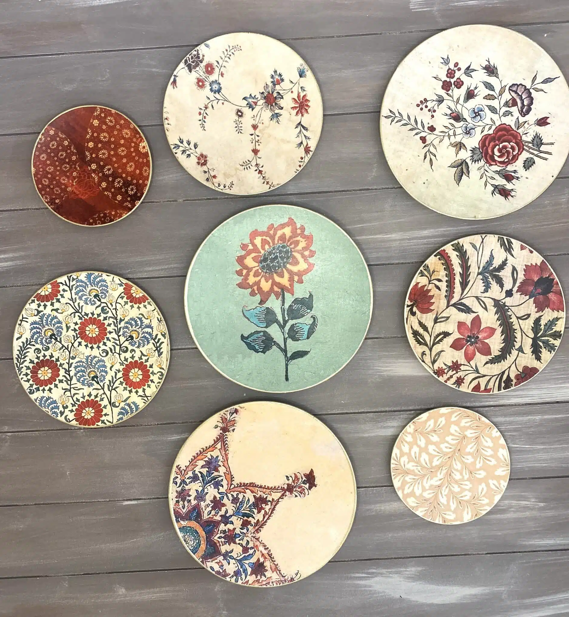 Decoupaged wall plates collection in Indian flowers and mandala design