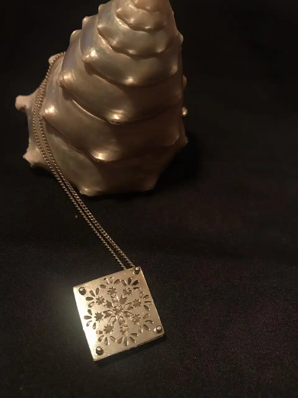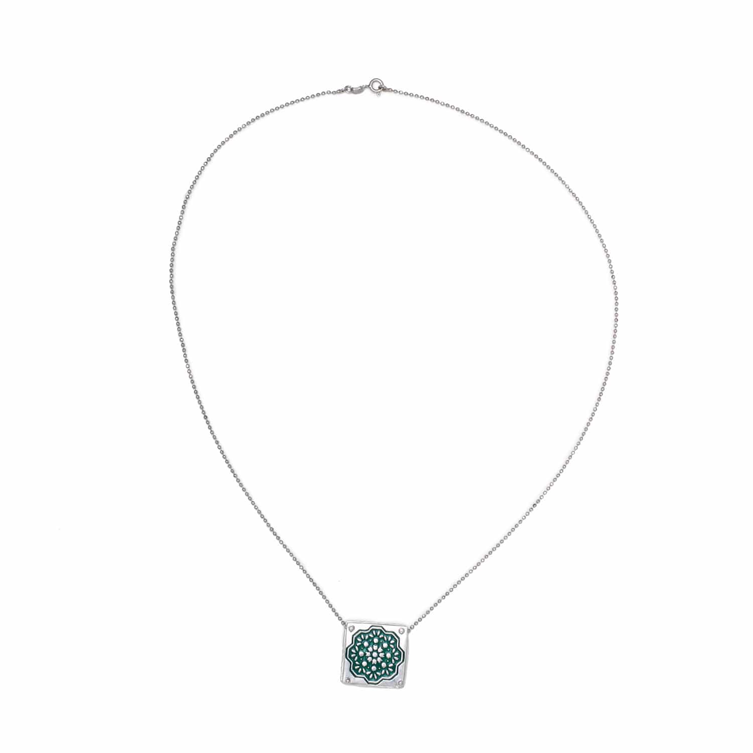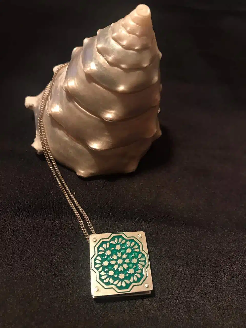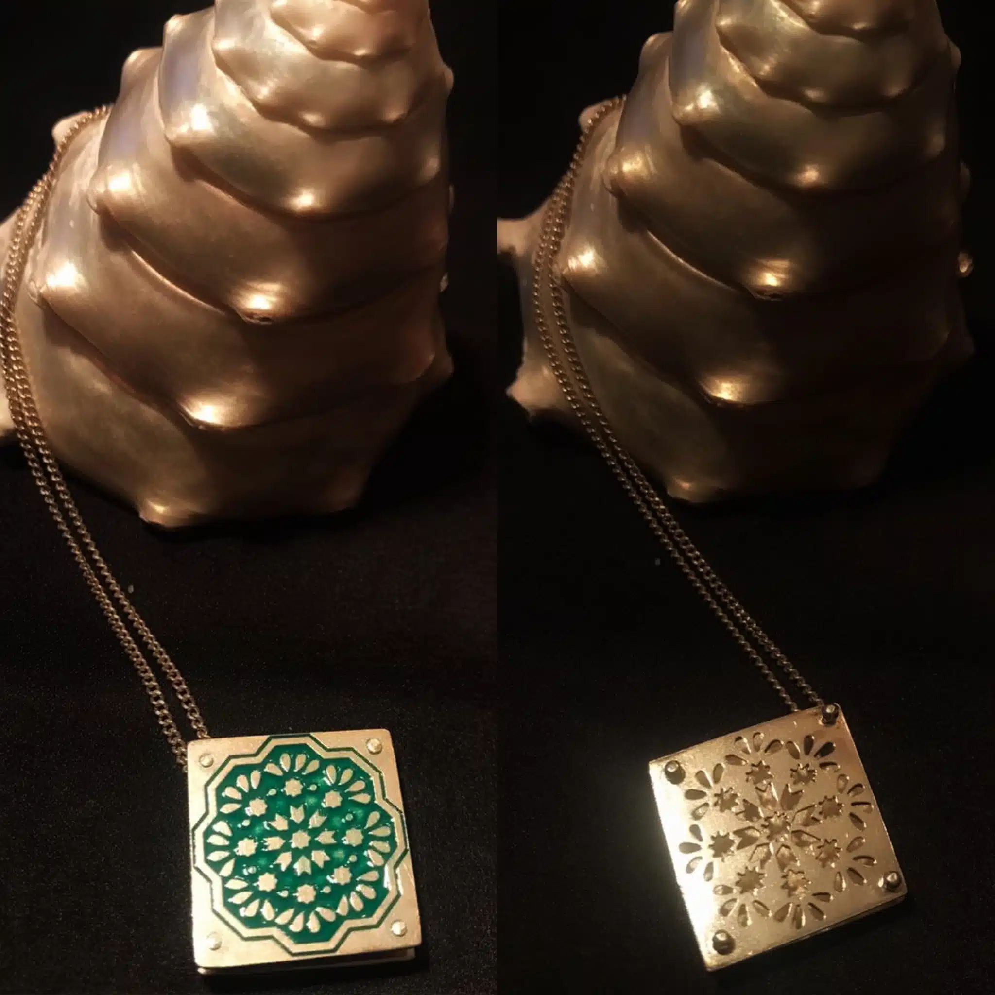 Interchangeable necklace has one side with an intricate design, and the other with colorful enamel. Additionally, the necklace can be worn either as a square shape 🟥 or a diamond shape ♦️