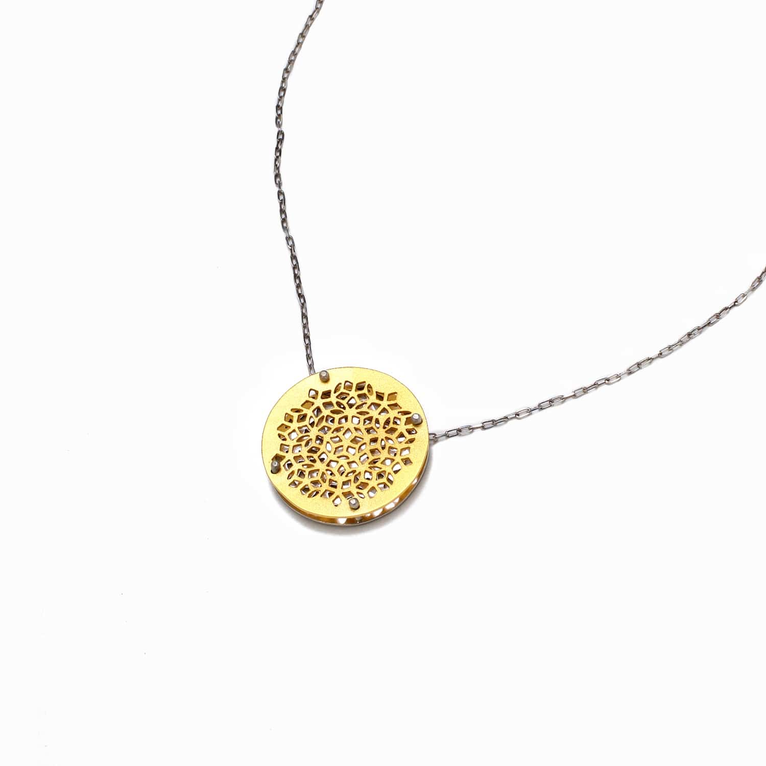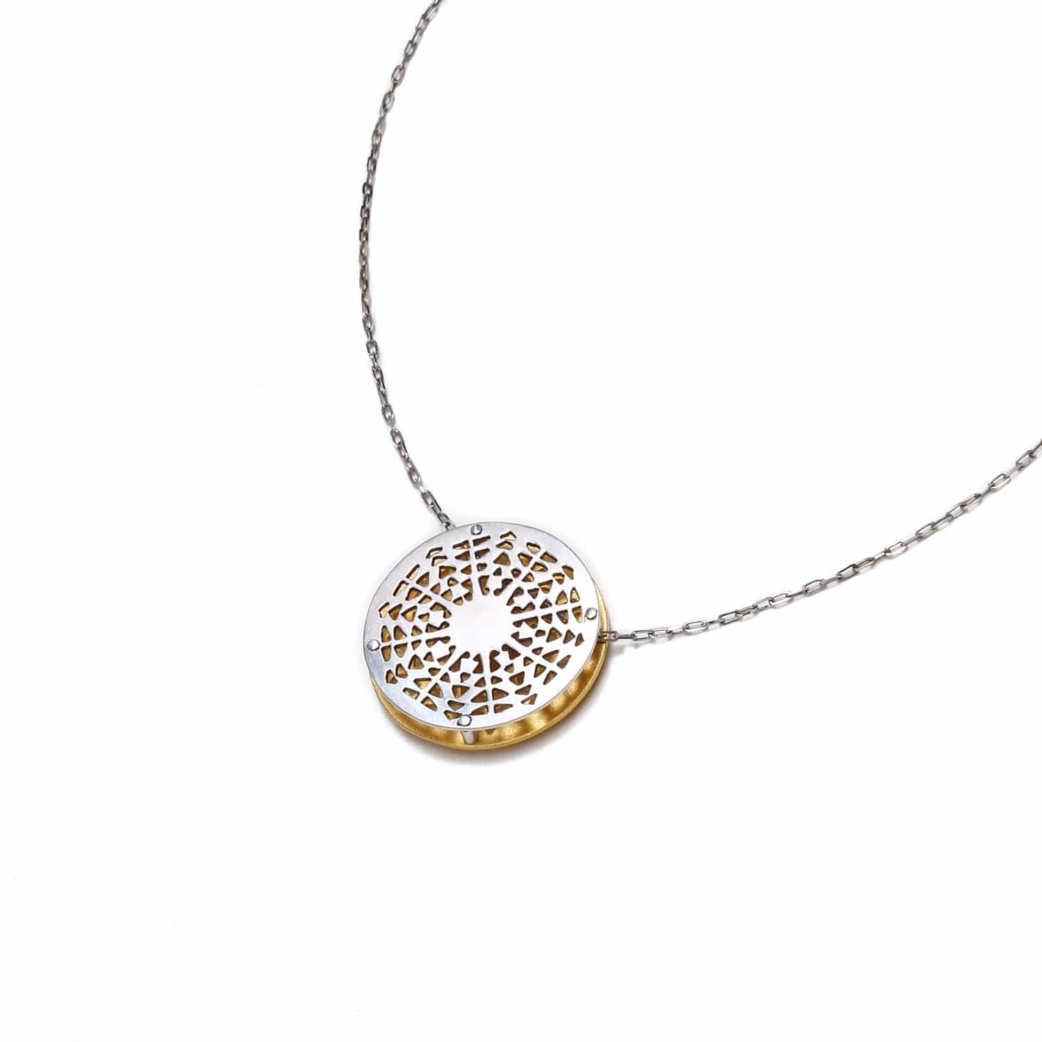 - Interchangeable necklace has one side with an intricate sterling silver design, and the other is intricate gold plated brass design. Additionally, the necklace can be worn long or short.