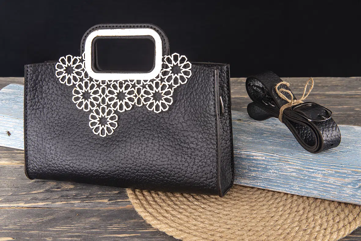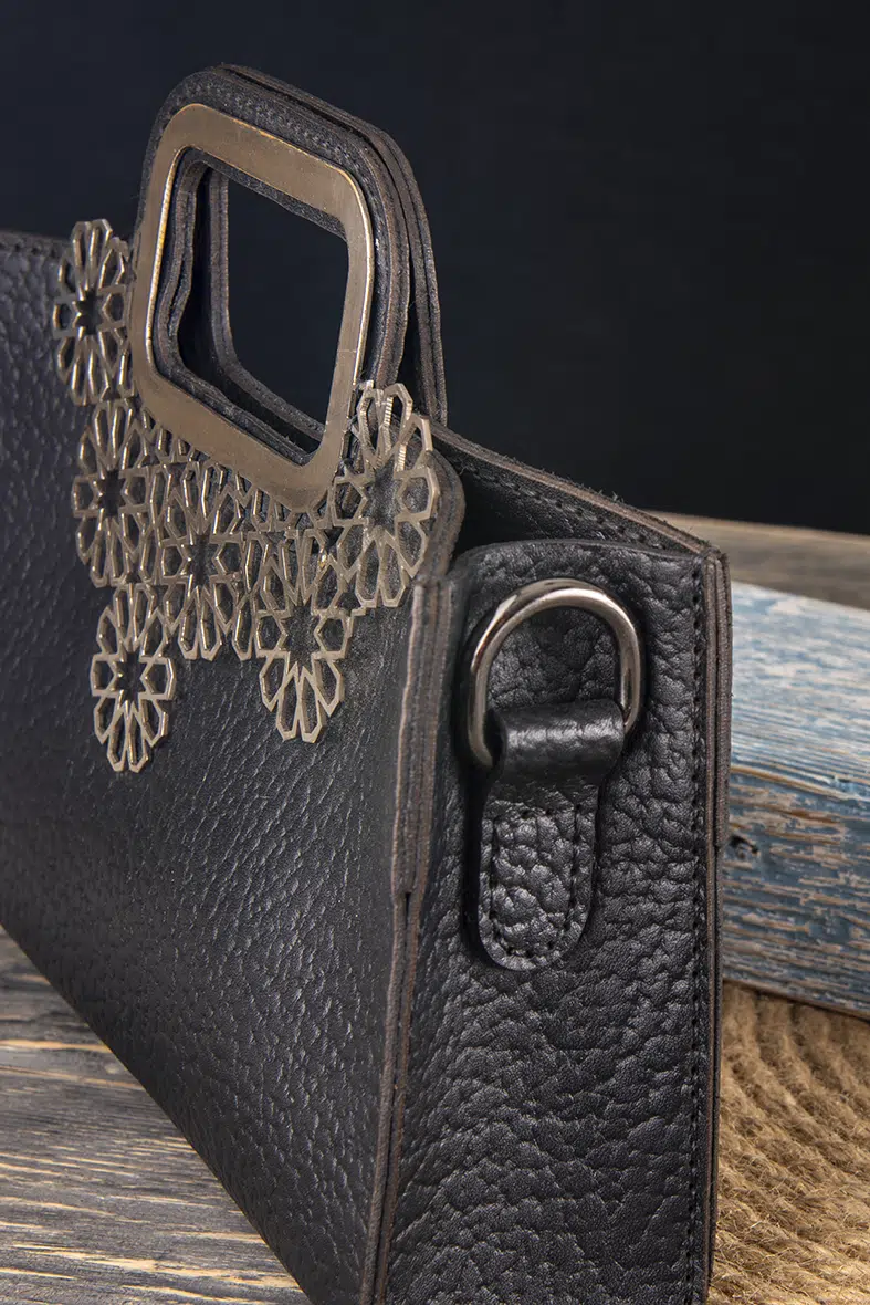 A luxurious black genuine leather handbag adorned with a silver-plated brass ornament featuring intricate Islamic-inspired engravings. Designed with a built-in handle and a detachable, adjustable strap for versatile carrying options.