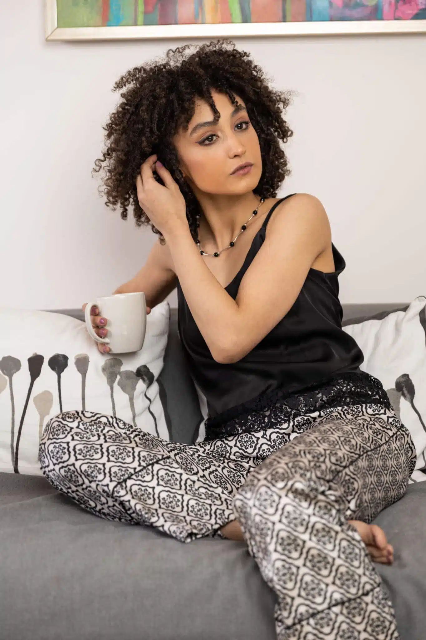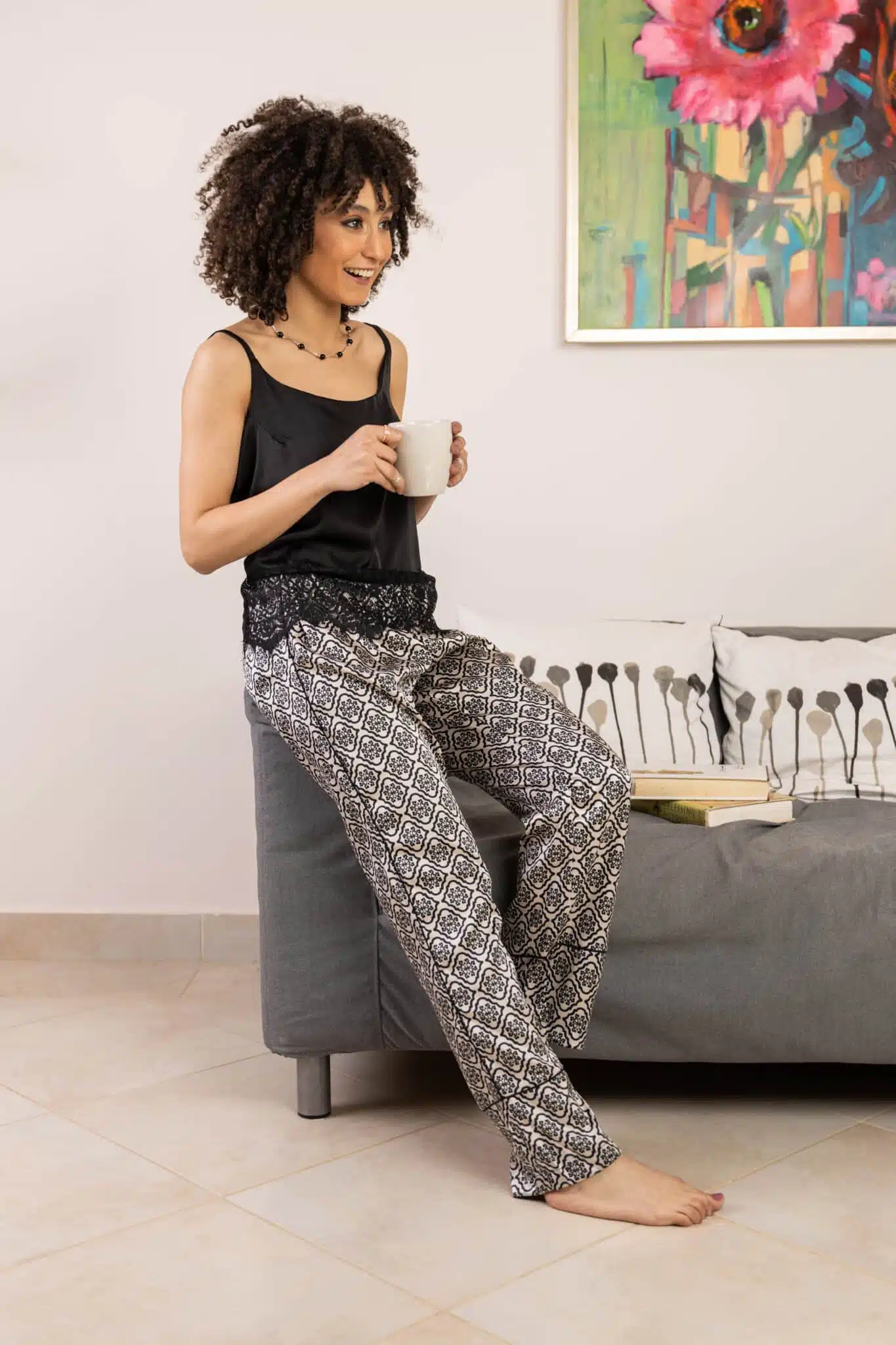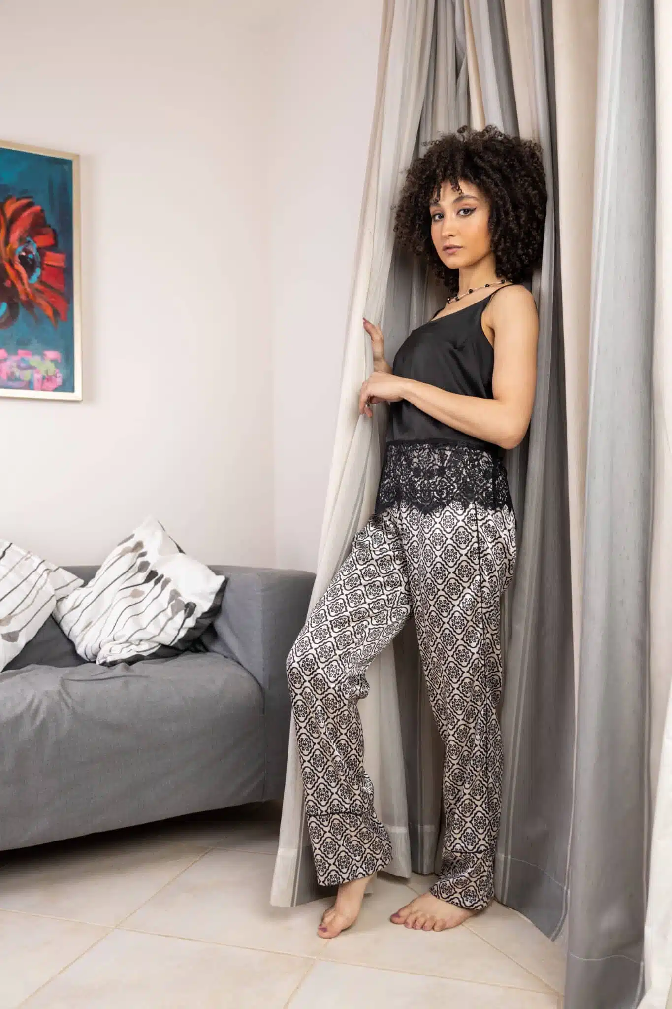 Satin pajama set decorated with lace. Comes in vibrant orange and sultry black.