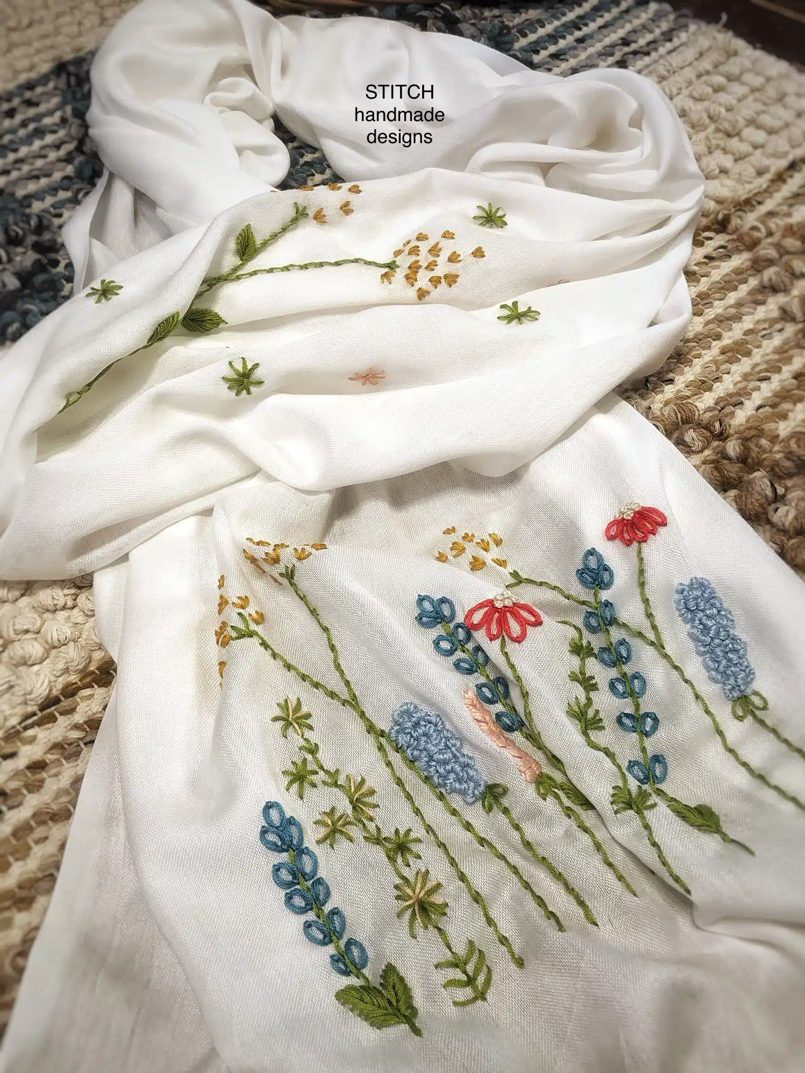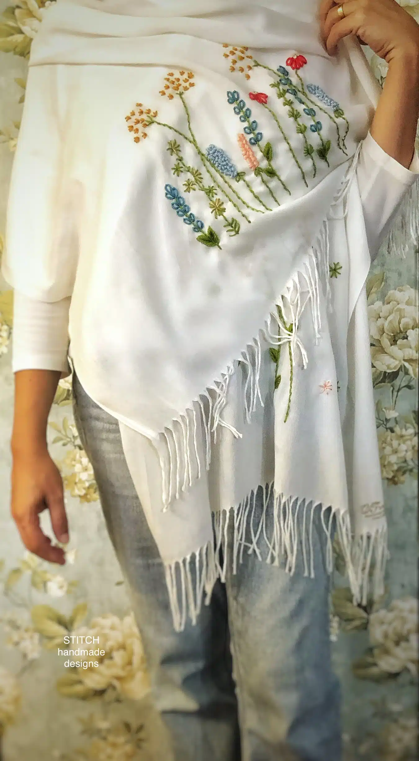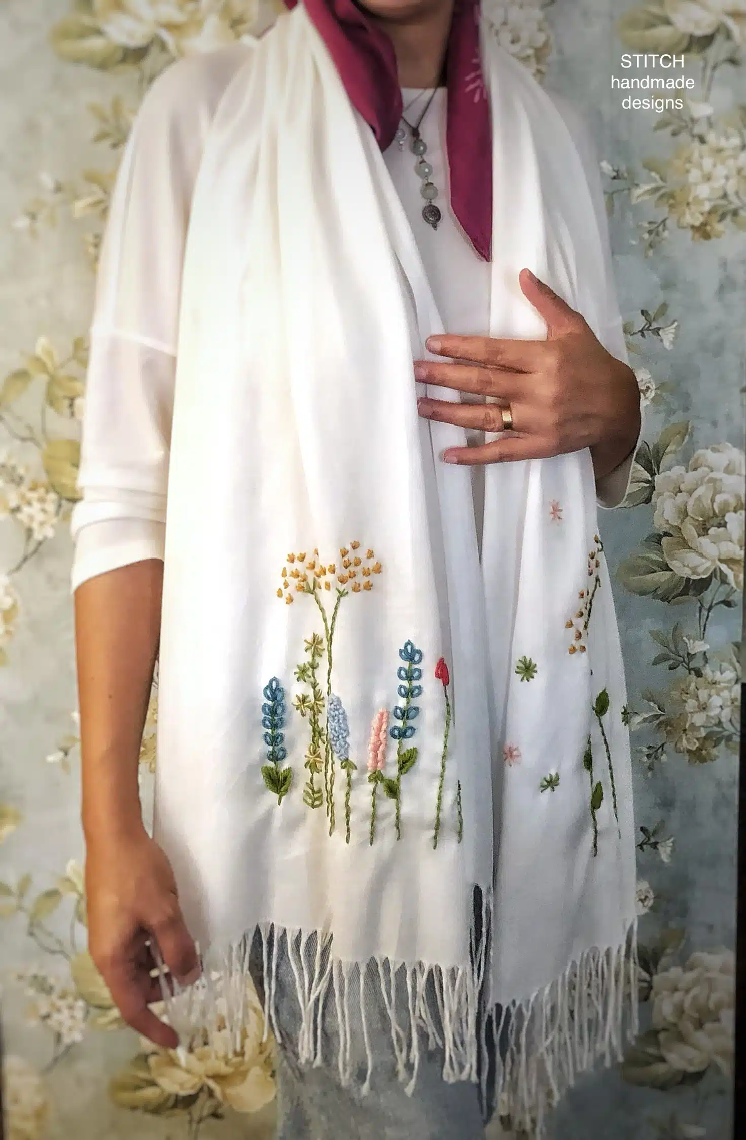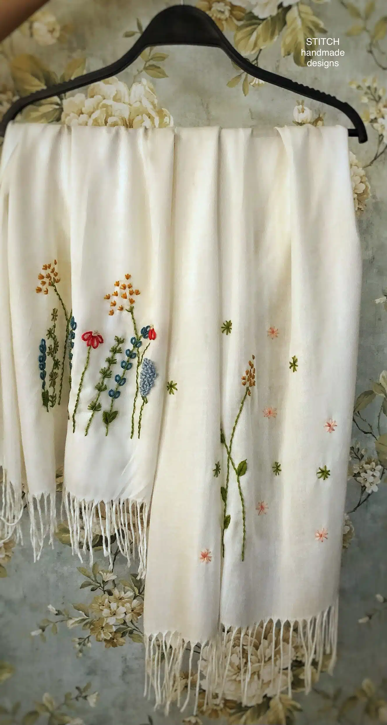 This off white scarf with embroidered flowers and leaves – a name that evokes the image of a beautiful garden embroidered on this hand embroidered pashmina shawl.