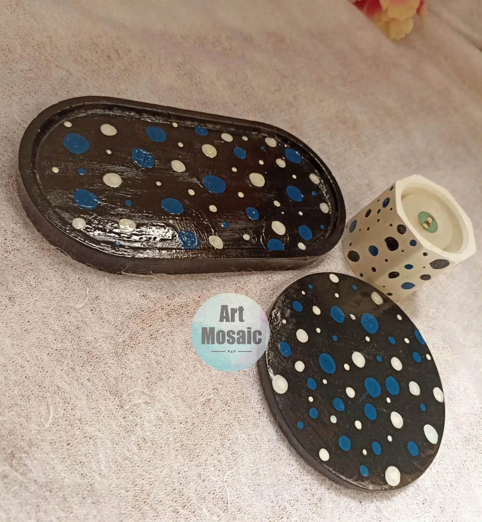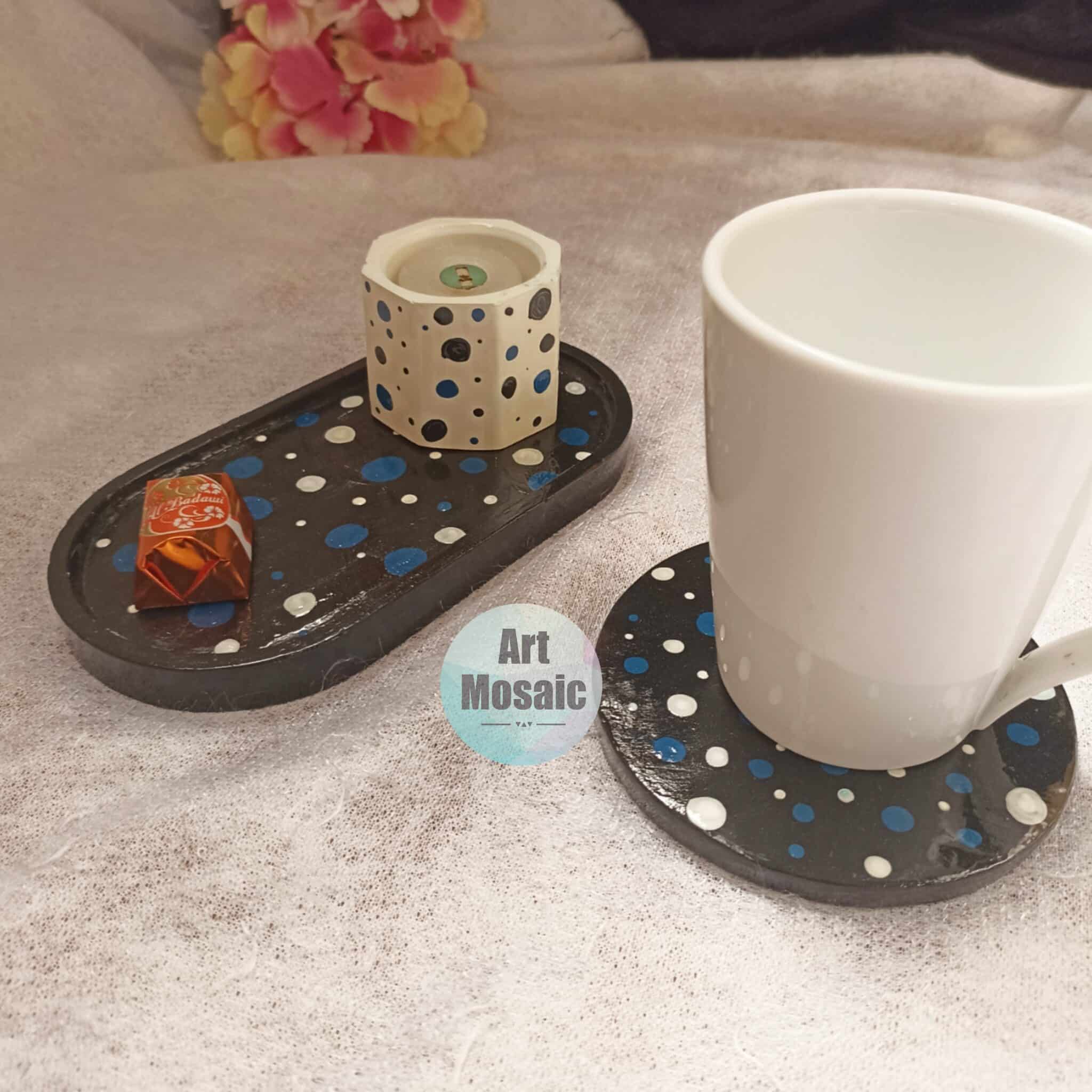 set of tray to  put accessories , coaster for cup of coffee and candle holder