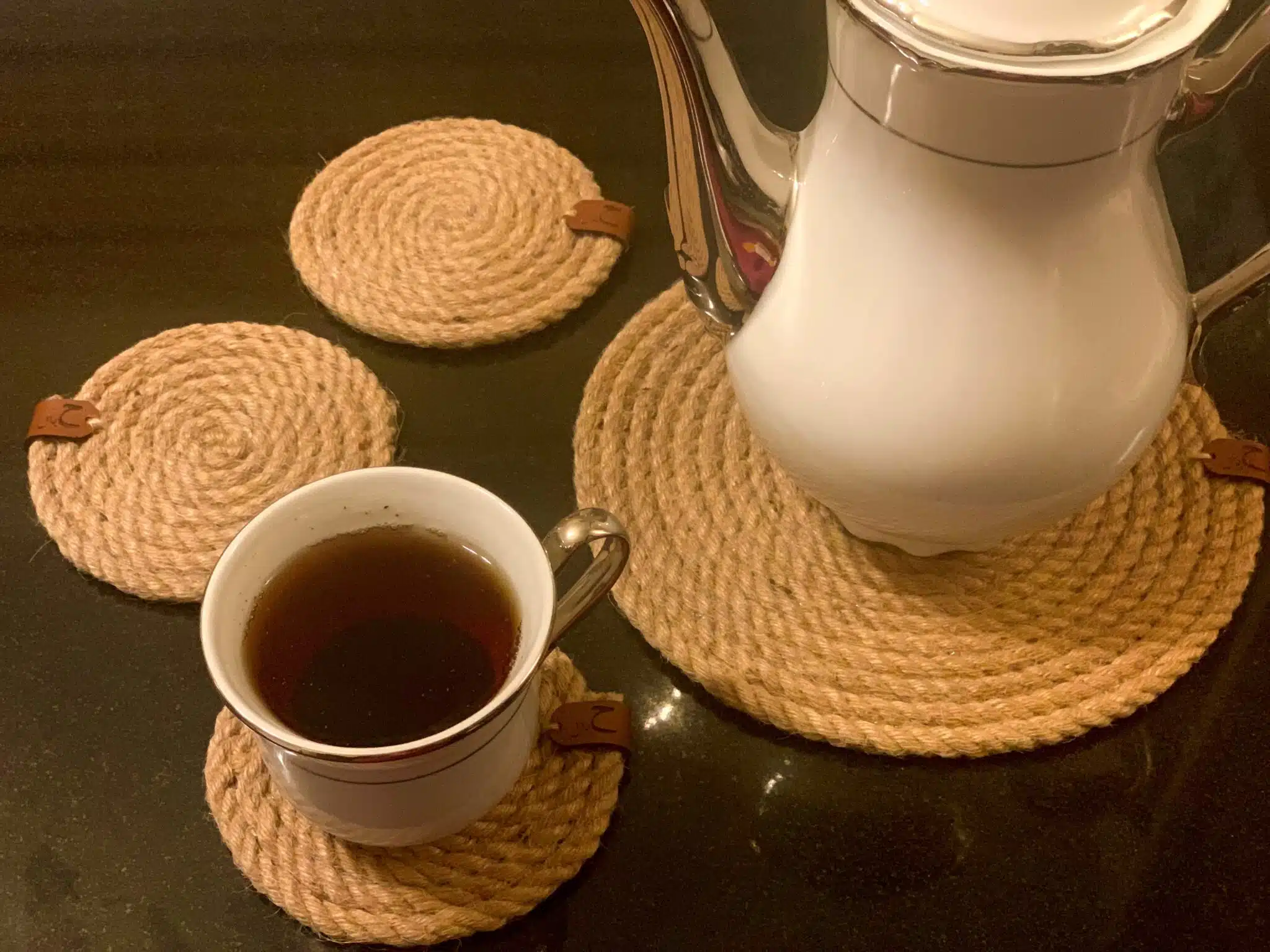 1 Handmade tea pot placemat diameter 20 cm & 4 coasters diameter 10 cm made by natural jute rope.