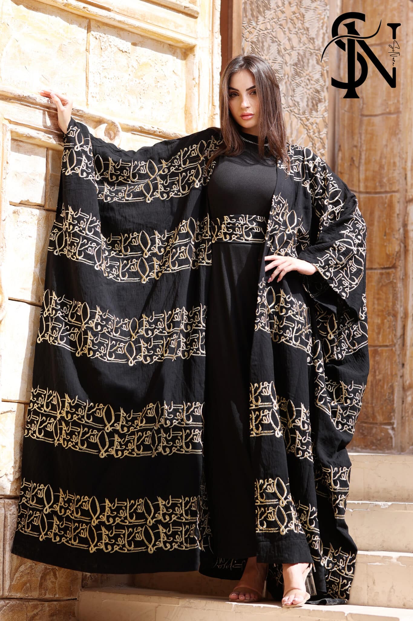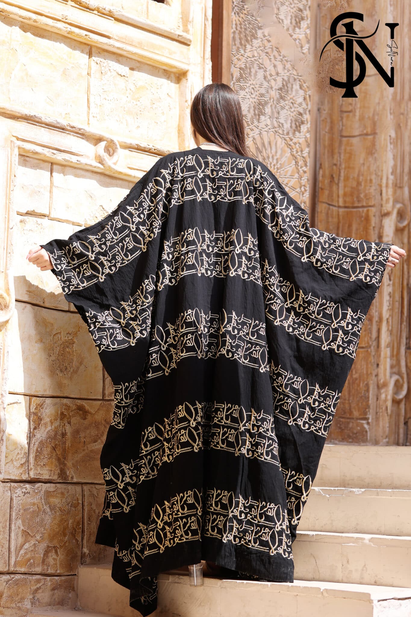 Gold embroidered kaftan with Islamic pattern.