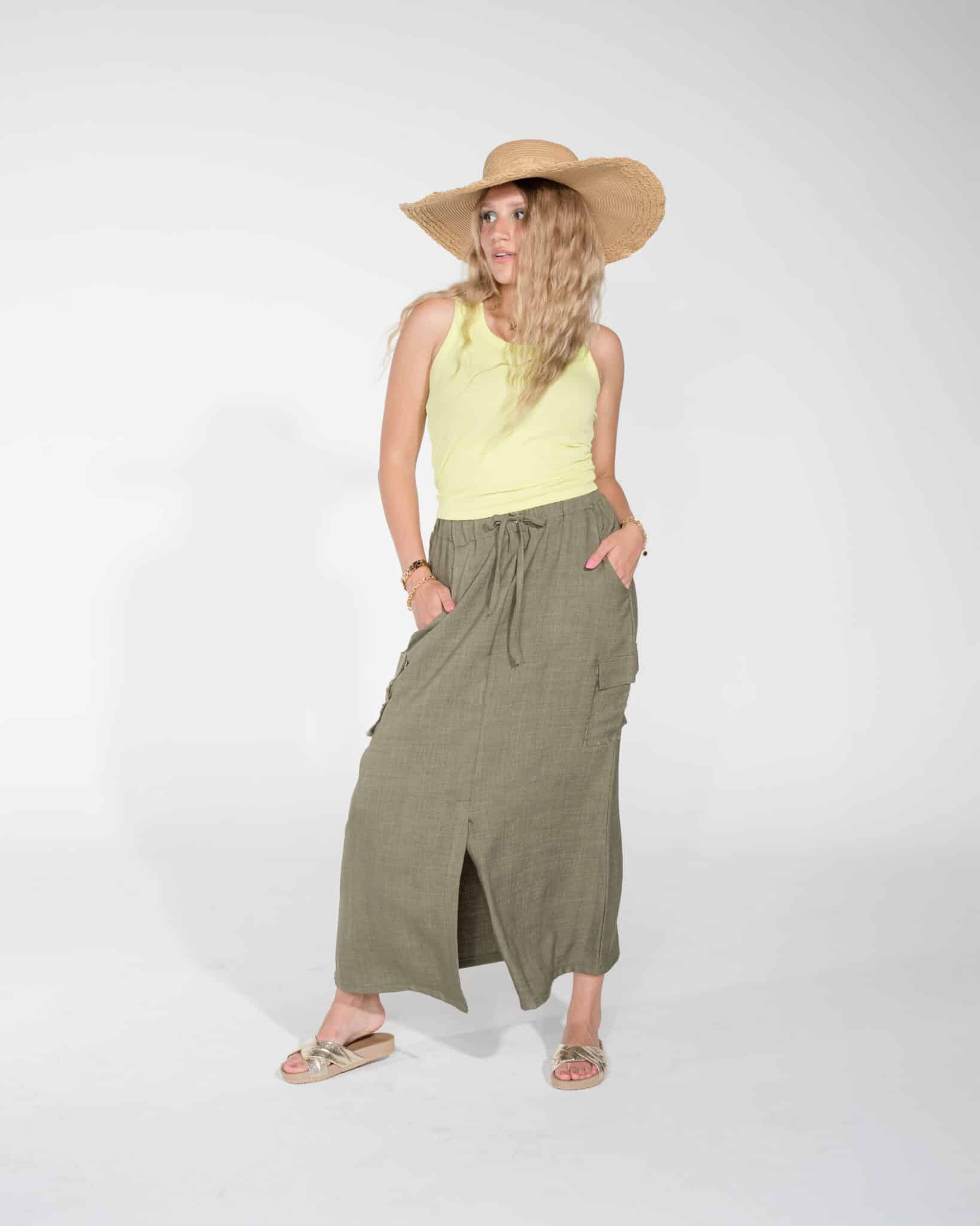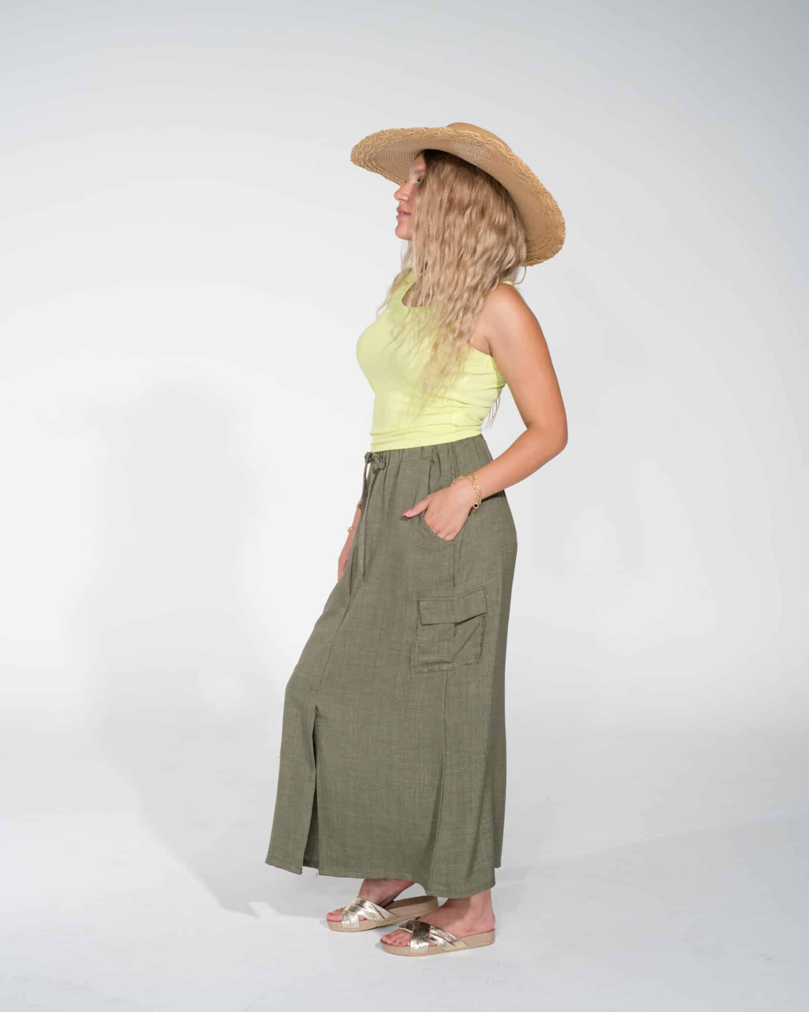 khaki green cargo linen long skirt