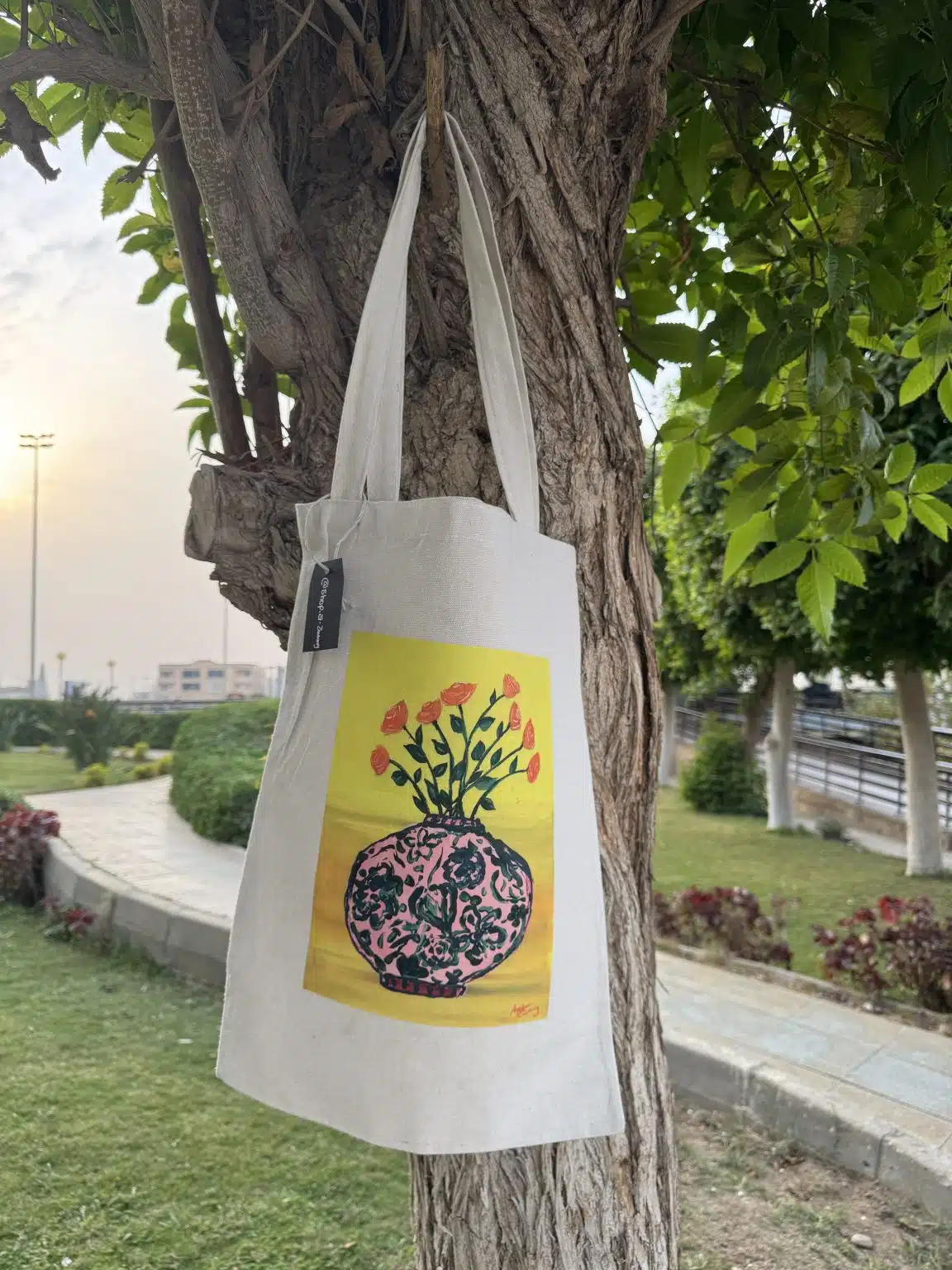 Original artwork print on beige canvas tote bag