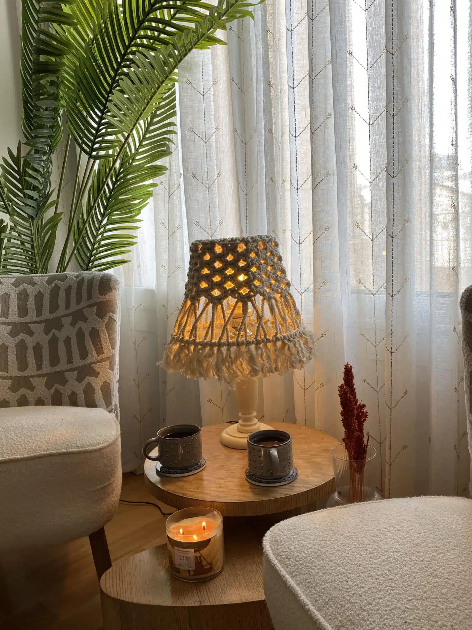 The “Lantern Side Lamp” is made out of 100% Egyptian cotton, attached to a curved white wood base
