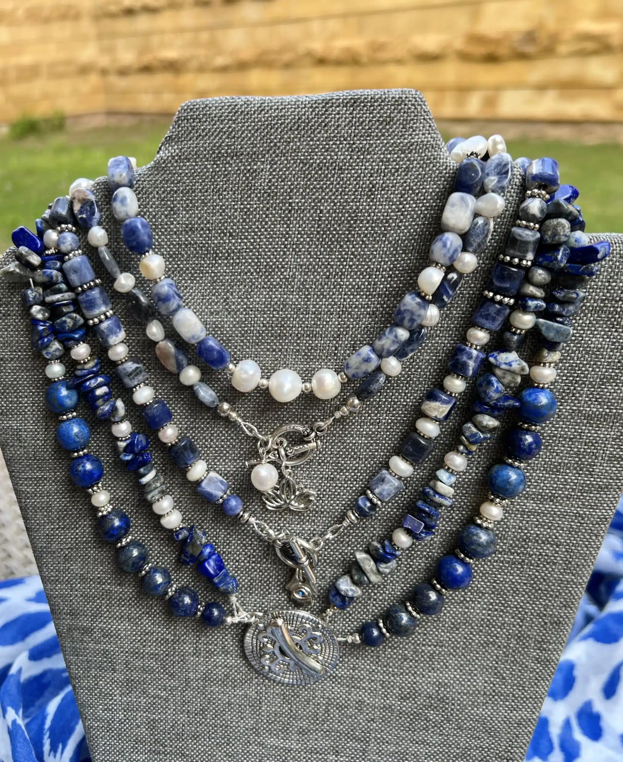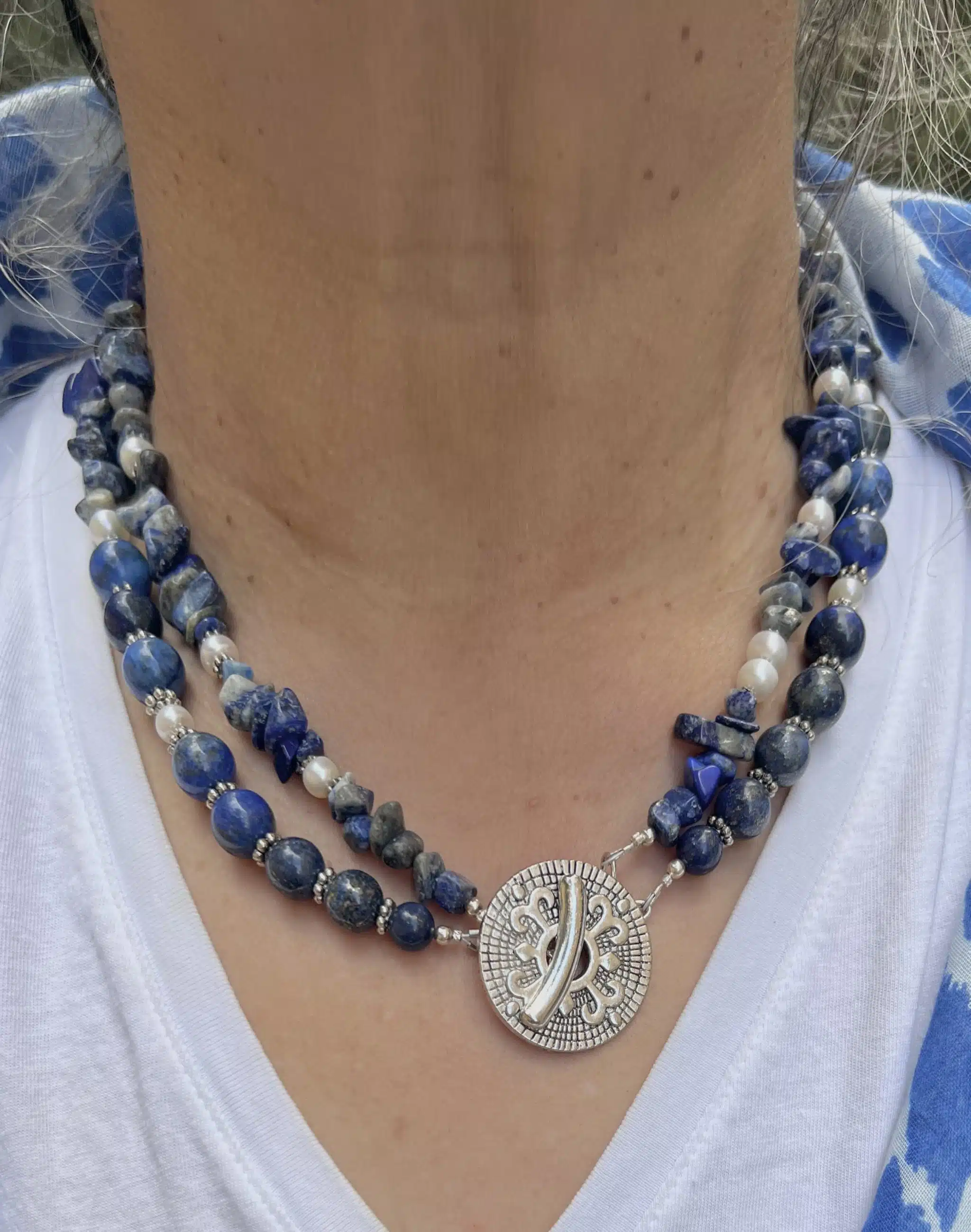Gorgeous lapis pearl 2 layer necklace with big clasp, just for you
