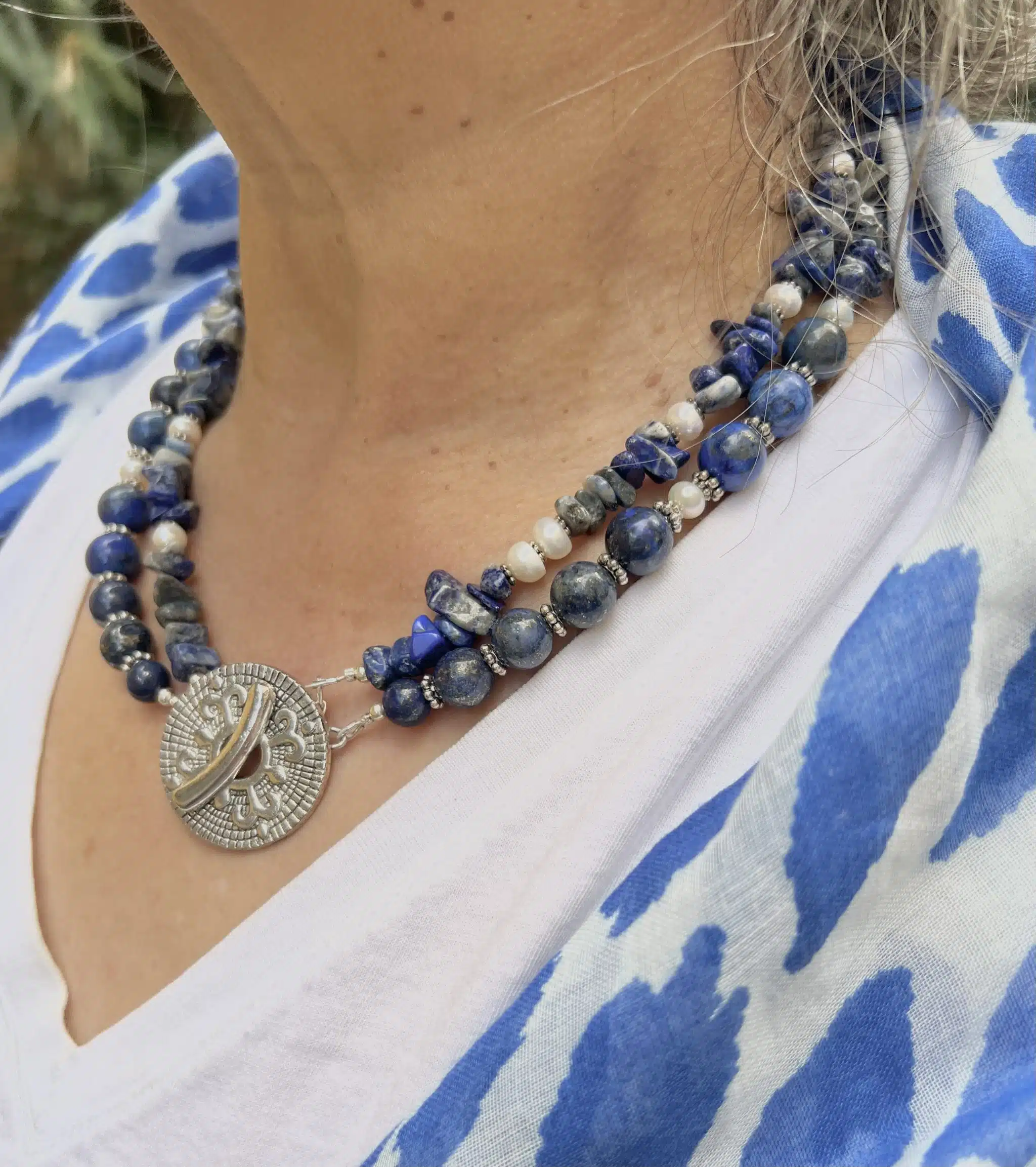 Lapis Lazuli & cultivated freshwater pearl 2 layer necklace with big clasp