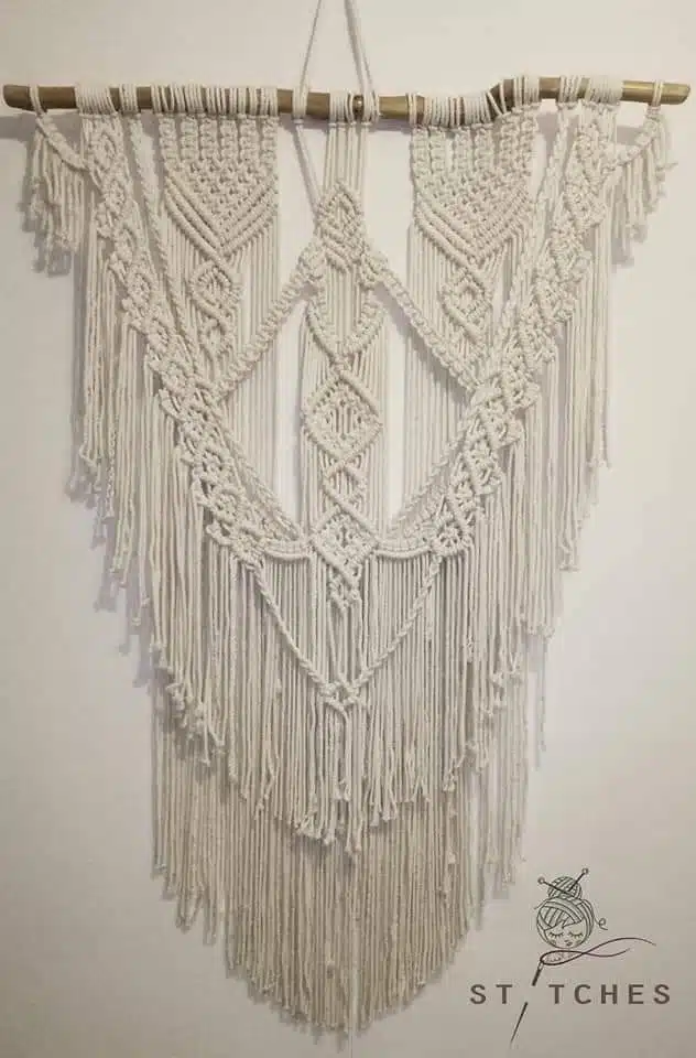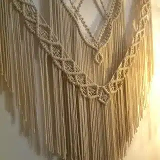 This is a handcrafted macrame wall hanging with beautiful delicate details and a gorgeous fringe.