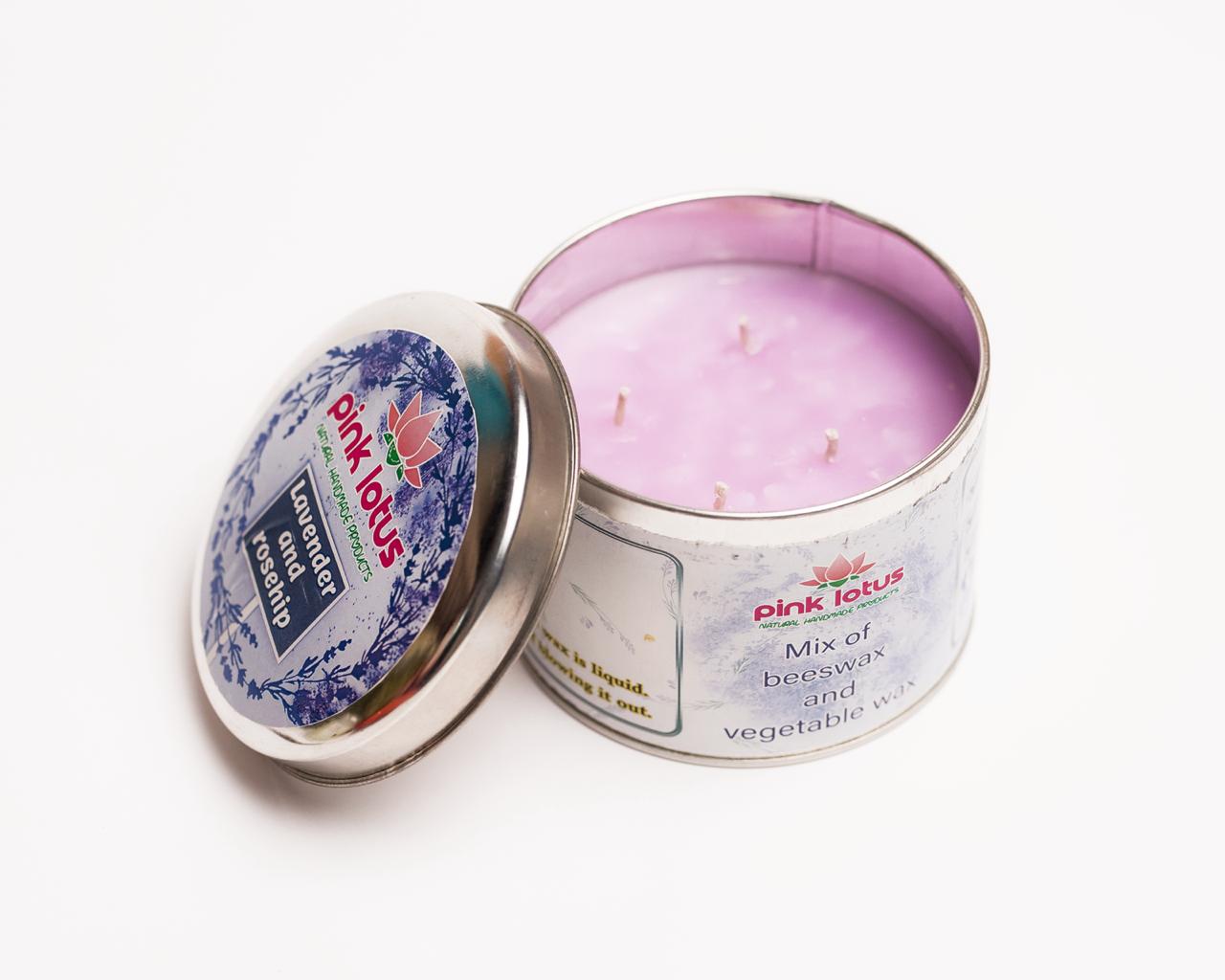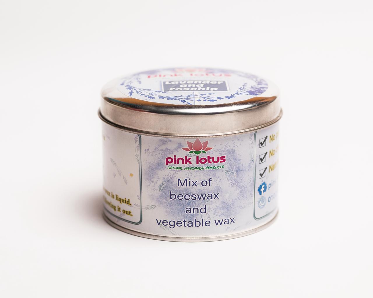 the candle is a mix between beeswax and soy wax scented with lavender & rosehip essential oil in a pottery container.