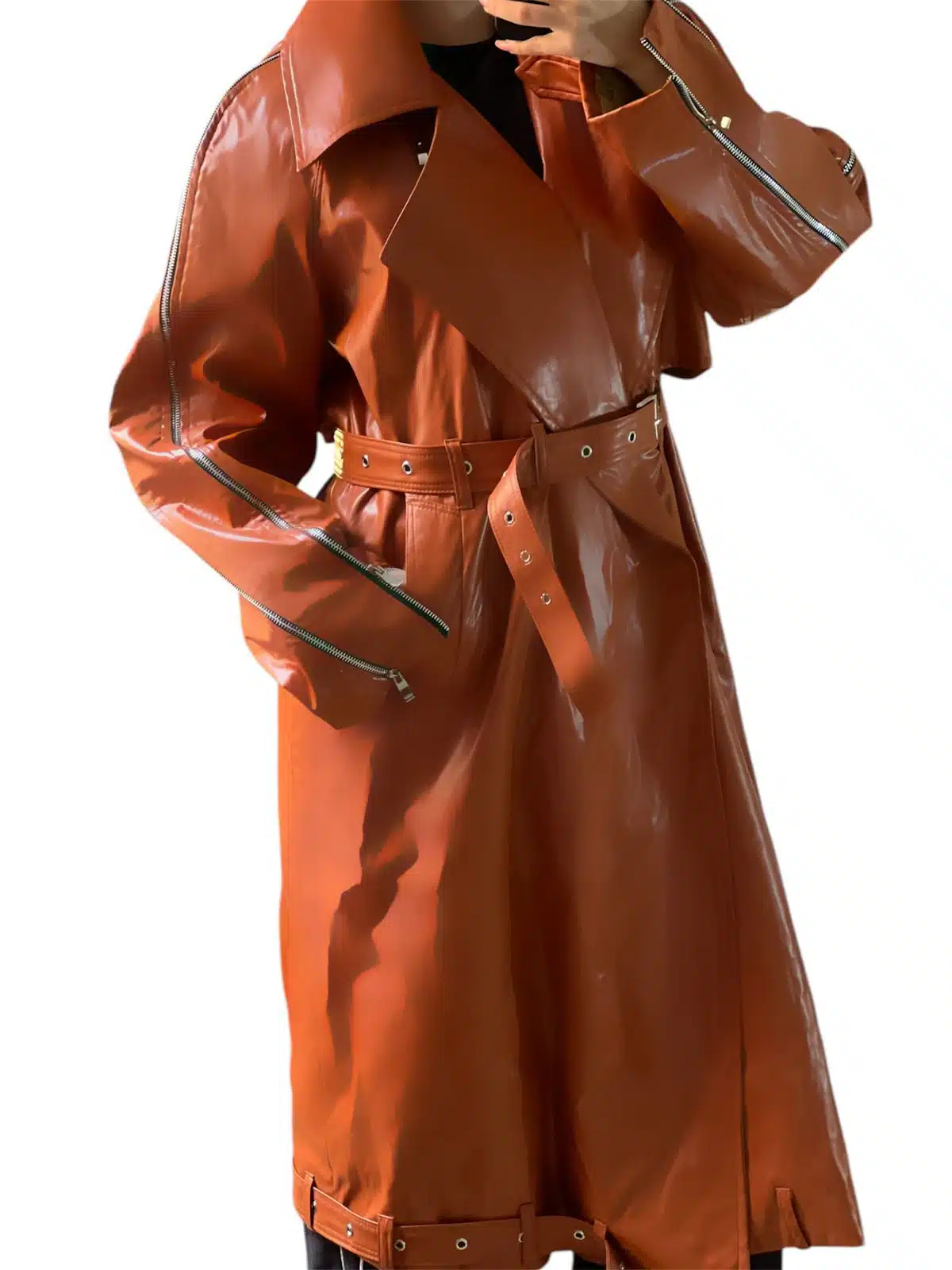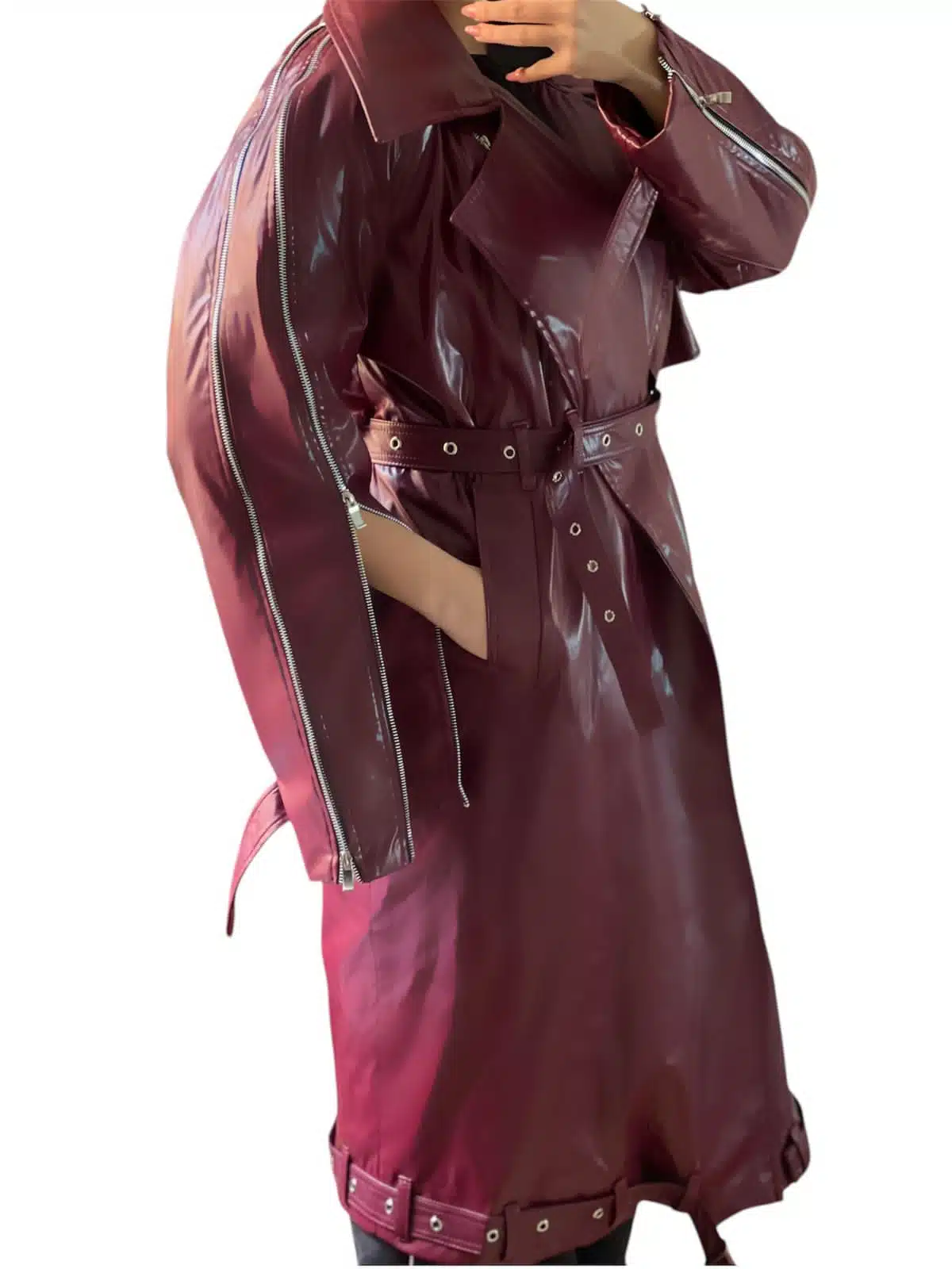Edgy and bold, this high-shine leather coat features statement zippers, a belted waist, and a futuristic silhouette for a striking look. Available in four stunning colors: Burgundy, Black, Red, and Burnt Orange.