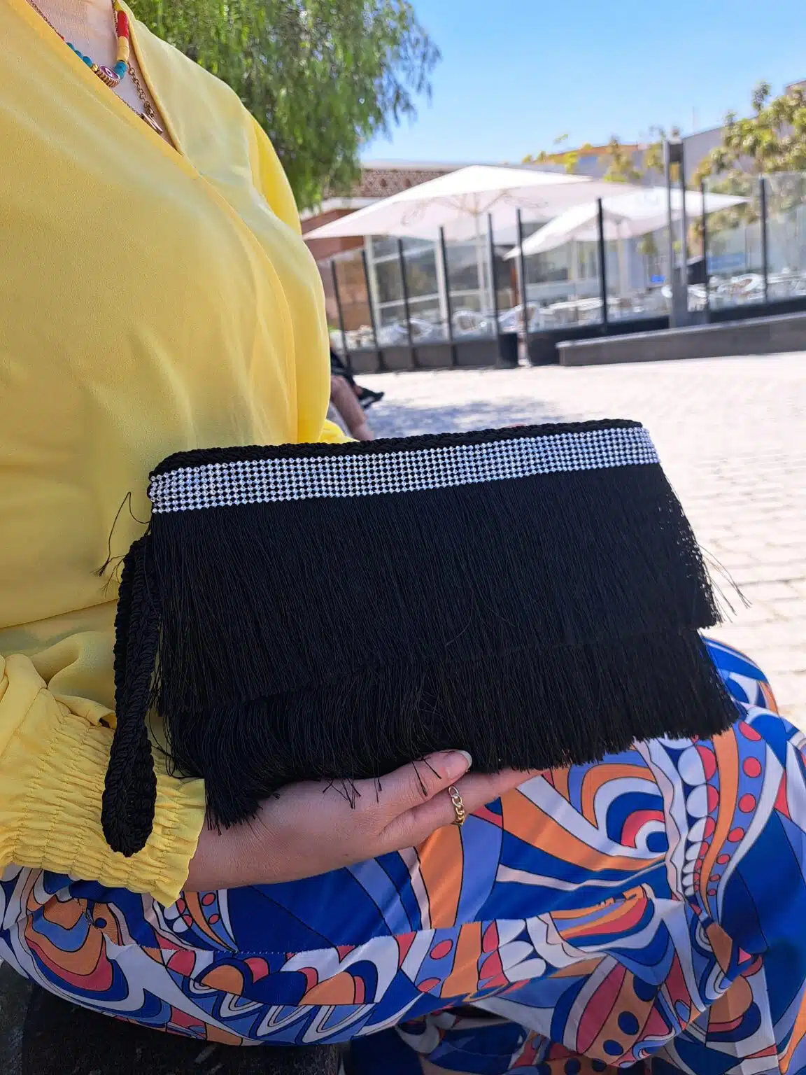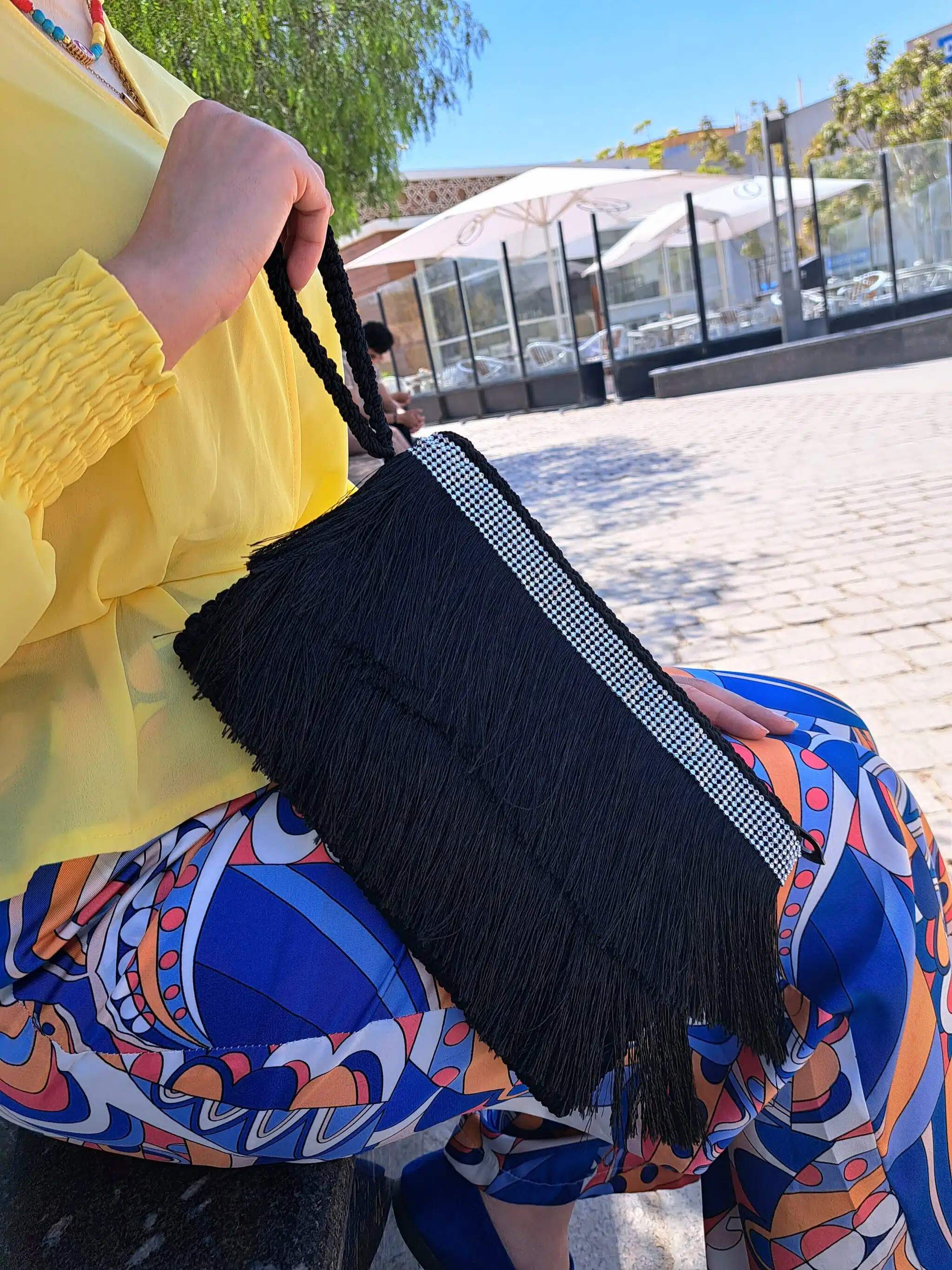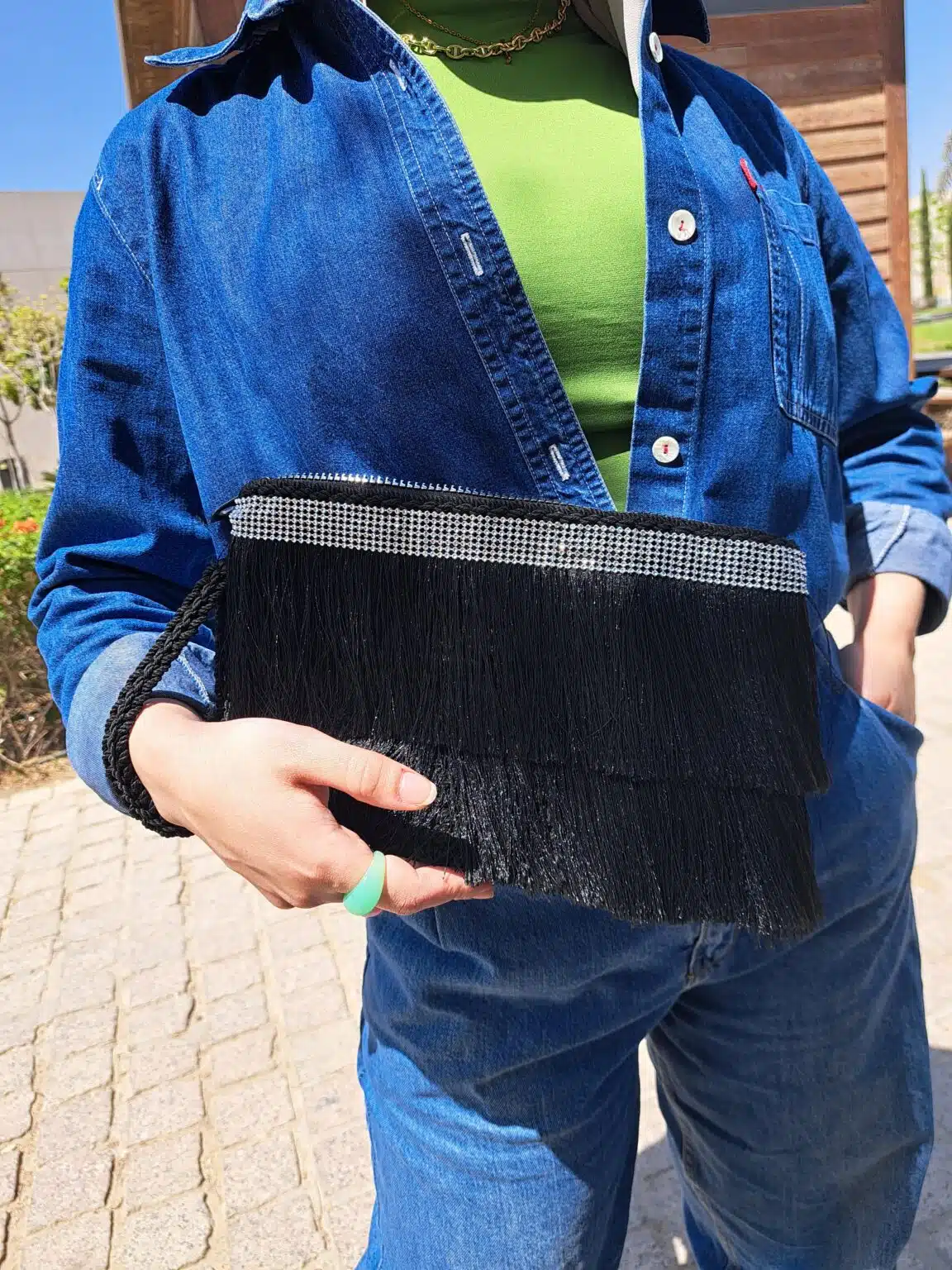 Handmade black macrame clutch.
