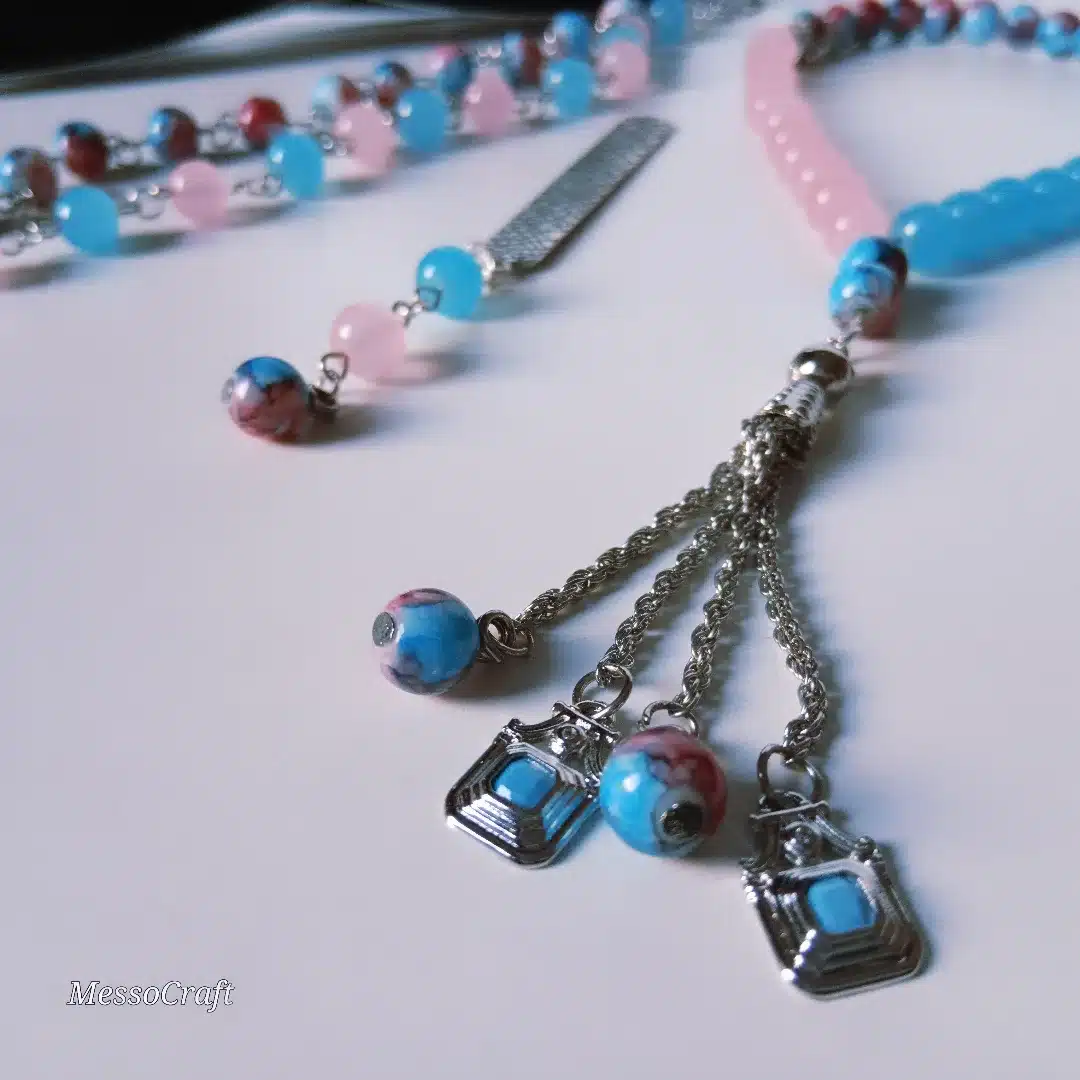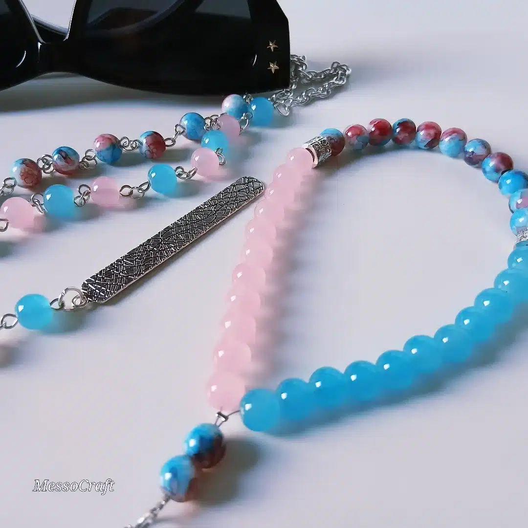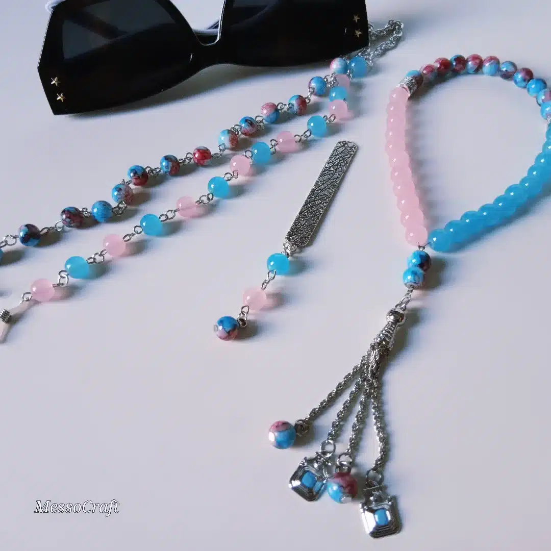 A set consists of 33 beads rosary (seb7ah), bookmark, and glasses chain made of light cheerful mix of blue and rosy alabaster stones