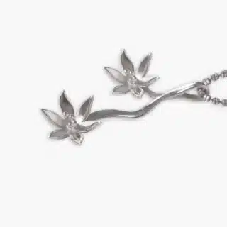 A modern classic chain necklace, versatile in length to suit many styles and looks. One side is a blossoming lily flower and the other side is a bell-shaped floral form accented with a freshwater pearl. It all comes together with three beautiful silver flower blossoms.