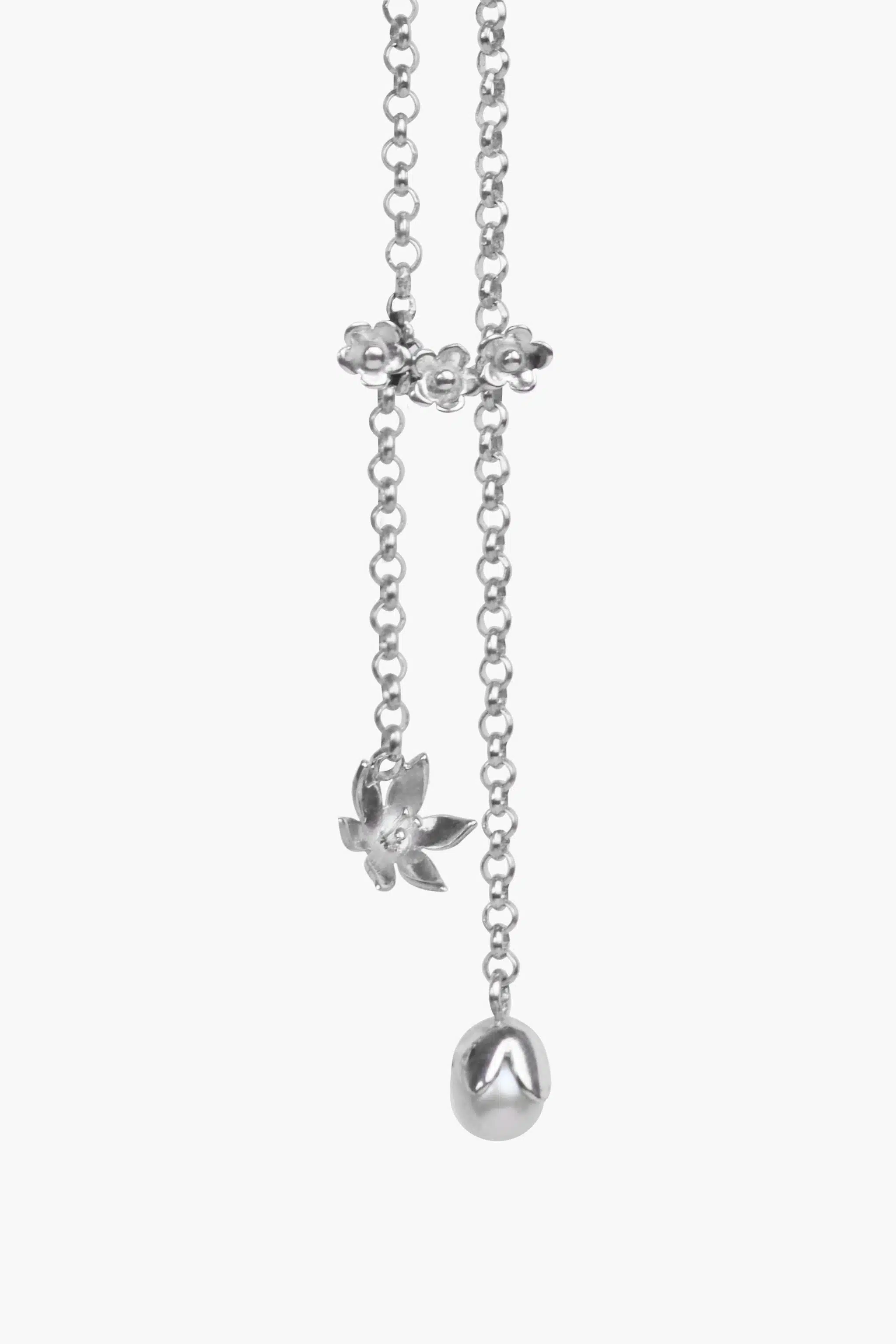 A modern classic chain necklace, versatile in length to suit many styles and looks. One side is a blossoming lily flower and the other side is a bell-shaped floral form accented with a freshwater pearl. It all comes together with three beautiful silver flower blossoms.