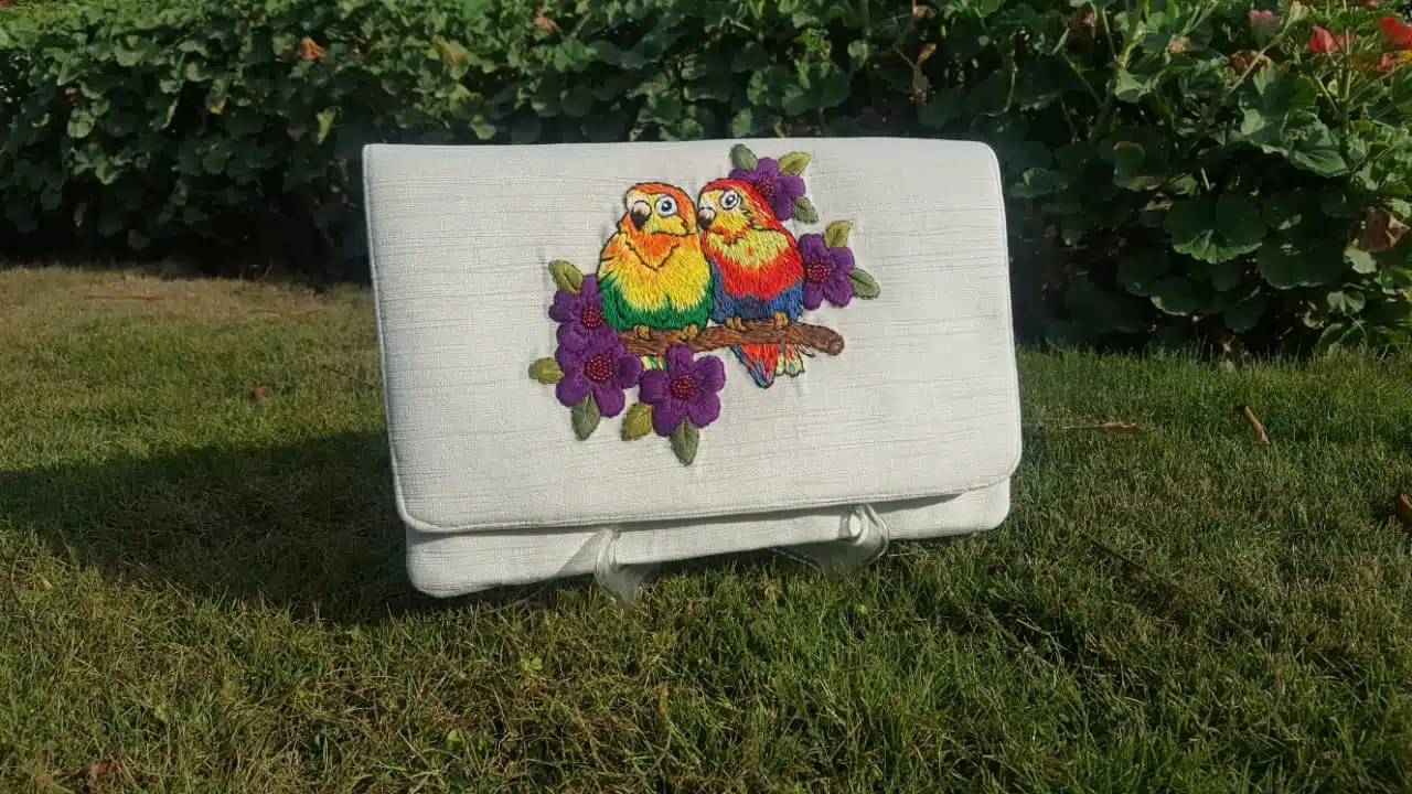 Off-white velvet clutch with gold metal hand ..lining with satin and zip inside it
