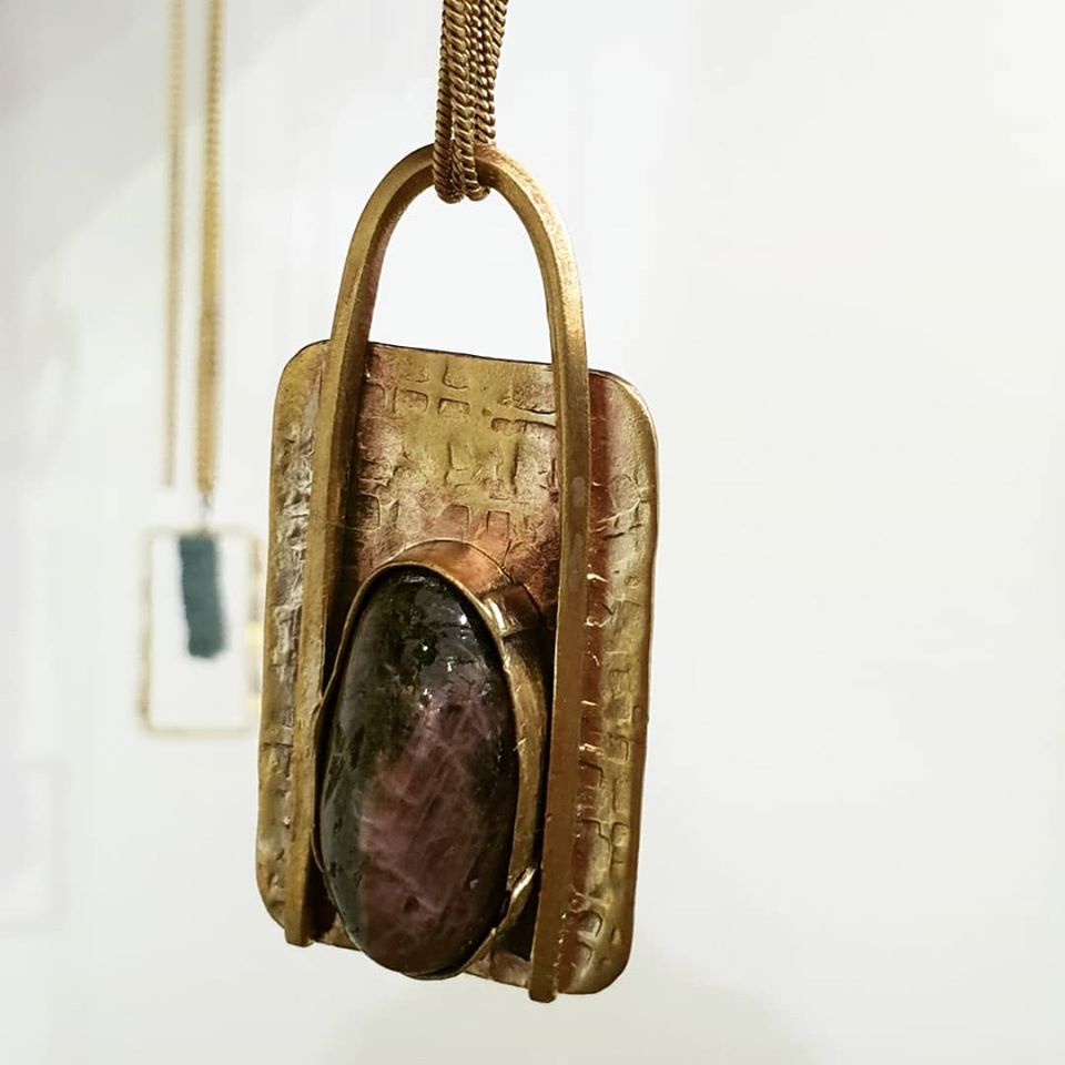 Hammered and oxidized lock-shaped pendant with tourmaline stone.