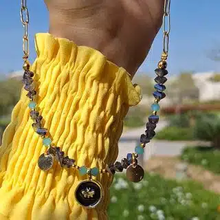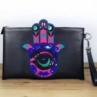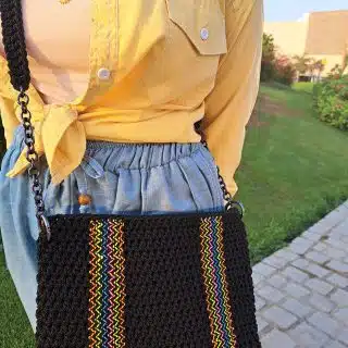 Handmade macrame clutch. Matches with Ramdan vibes. Decorated with pearls & stones. It has a white zipper & inner coating.