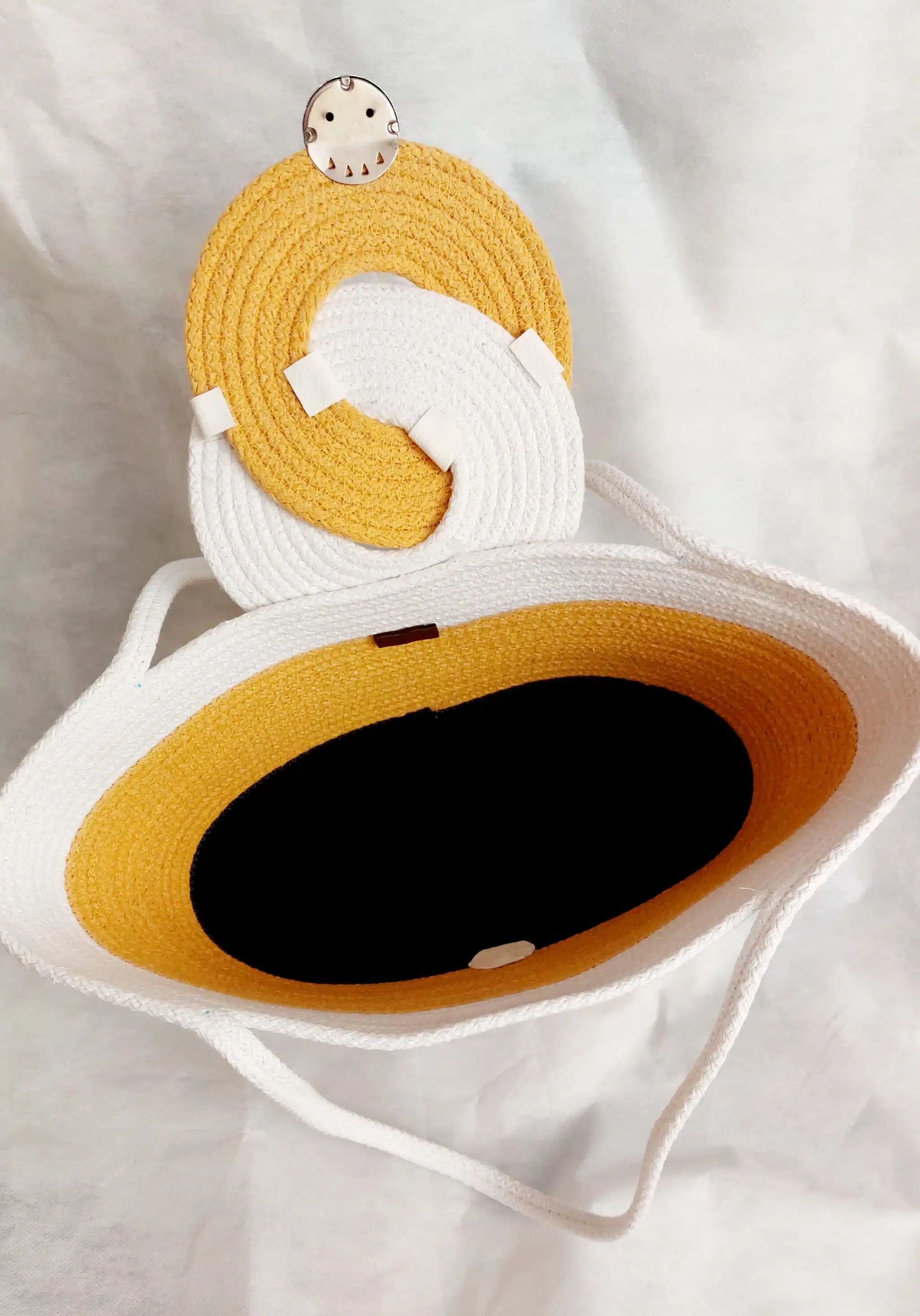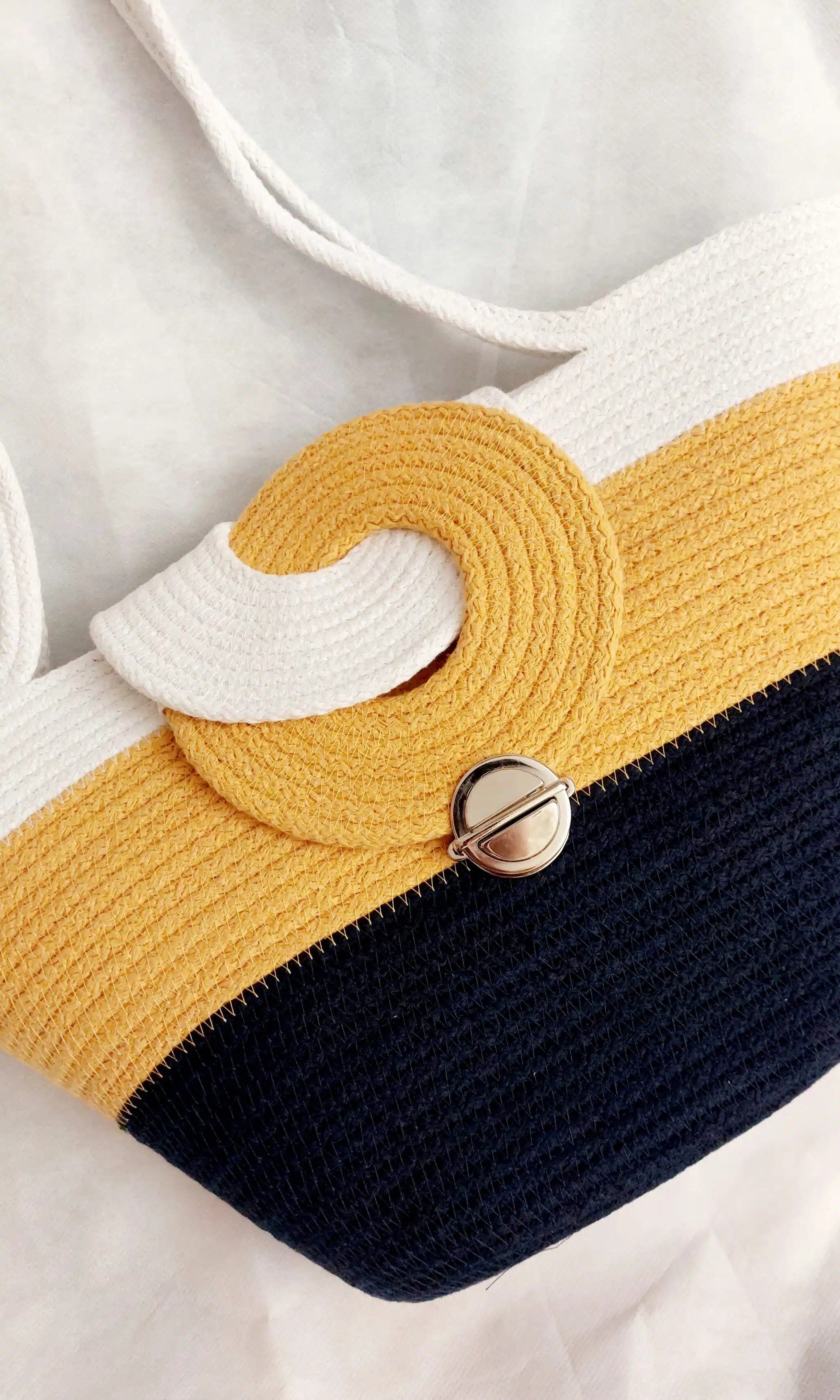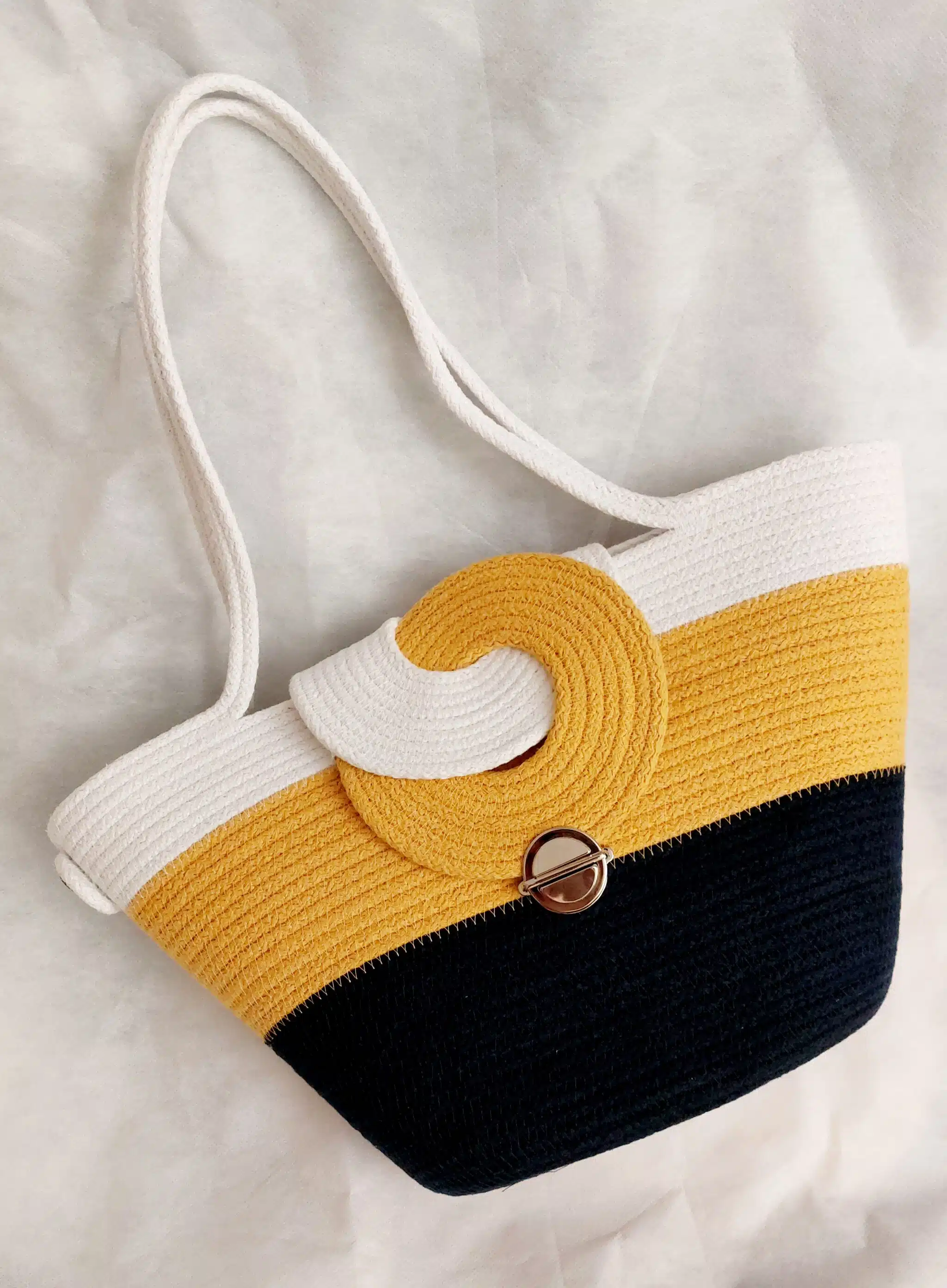 Turn heads with this beautifully handcrafted rope tote bag, designed with a modern twist on classic style. Its eye-catching layered design and unique swirl flap closure make it a standout piece for everyday use or vacation outings. Lightweight yet durable, the structured silhouette provides ample space for all your essentials, while the secure twist-lock keeps your belongings safe.